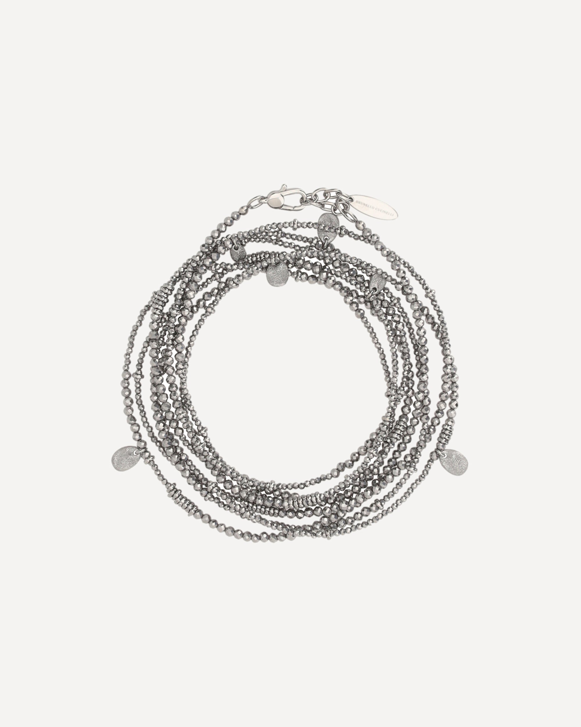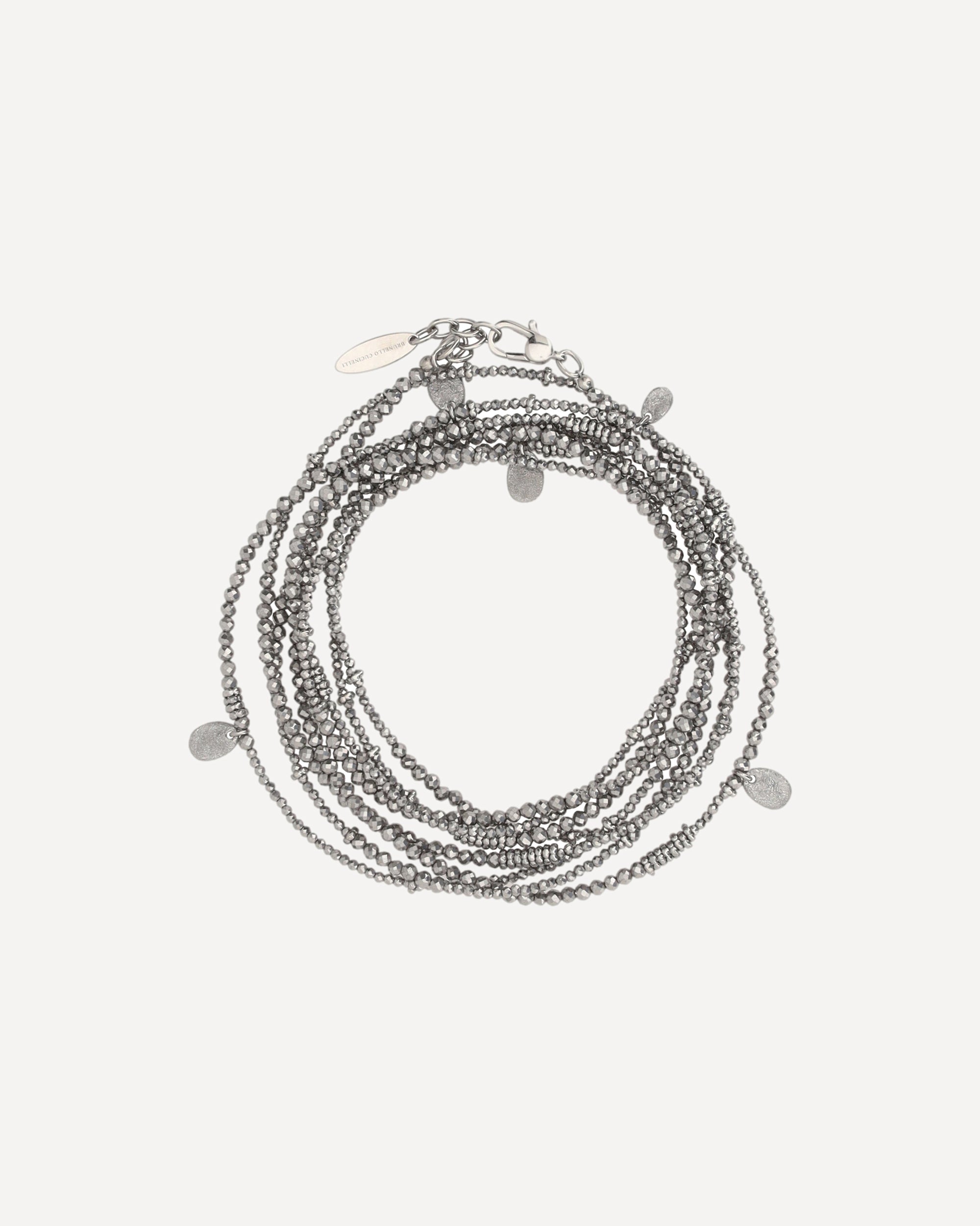 Brunello Cucinelli's Silver Beaded Bracelet features a hook-and-eye closure and nickel-free bead decoration. The beads, with a lustrous finish, are embellished with a handcrafted diamond pattern that sculpts the surface, enhancing the jewel's luminous reflections. An elegant accessory that combines craftsmanship and luxury.