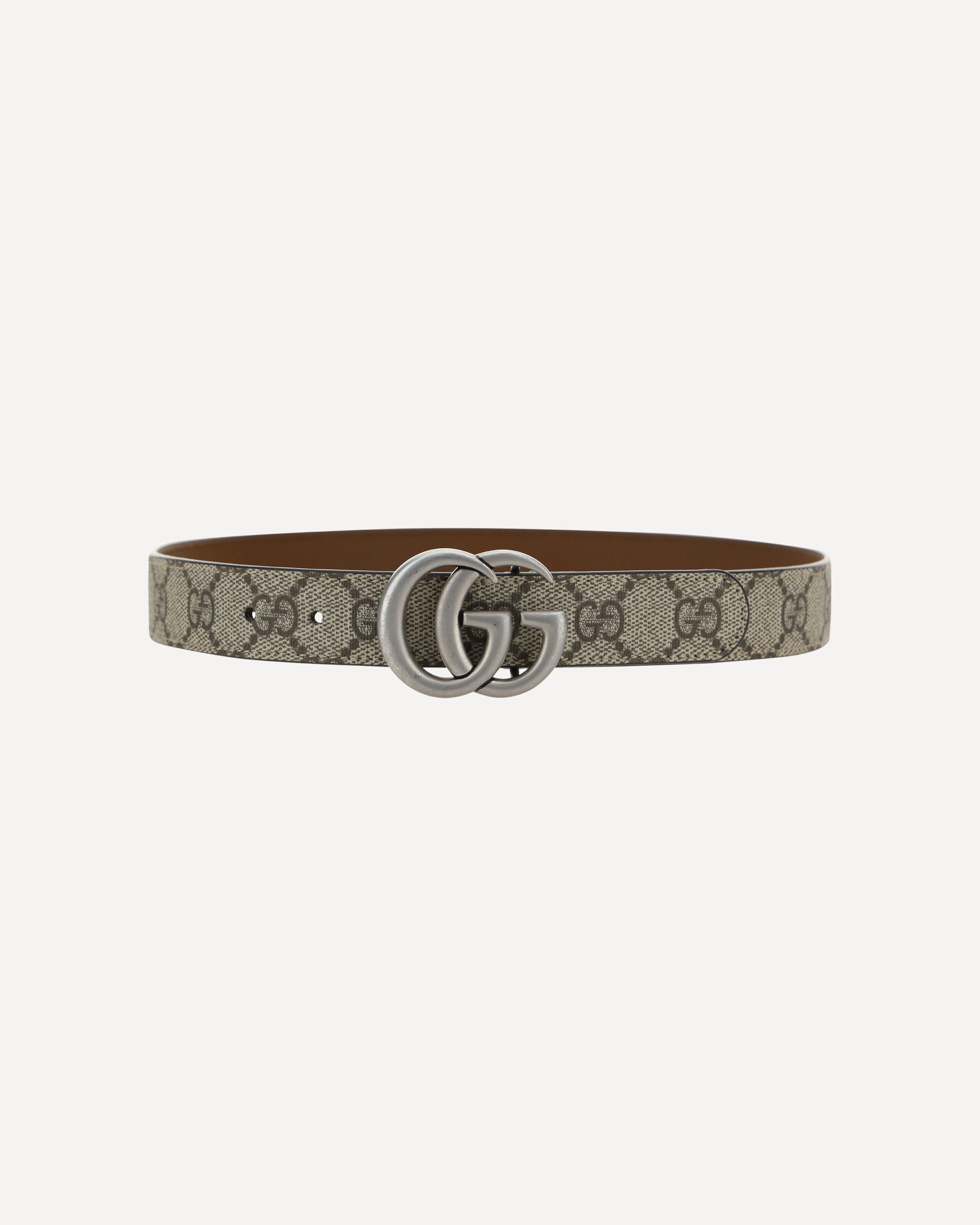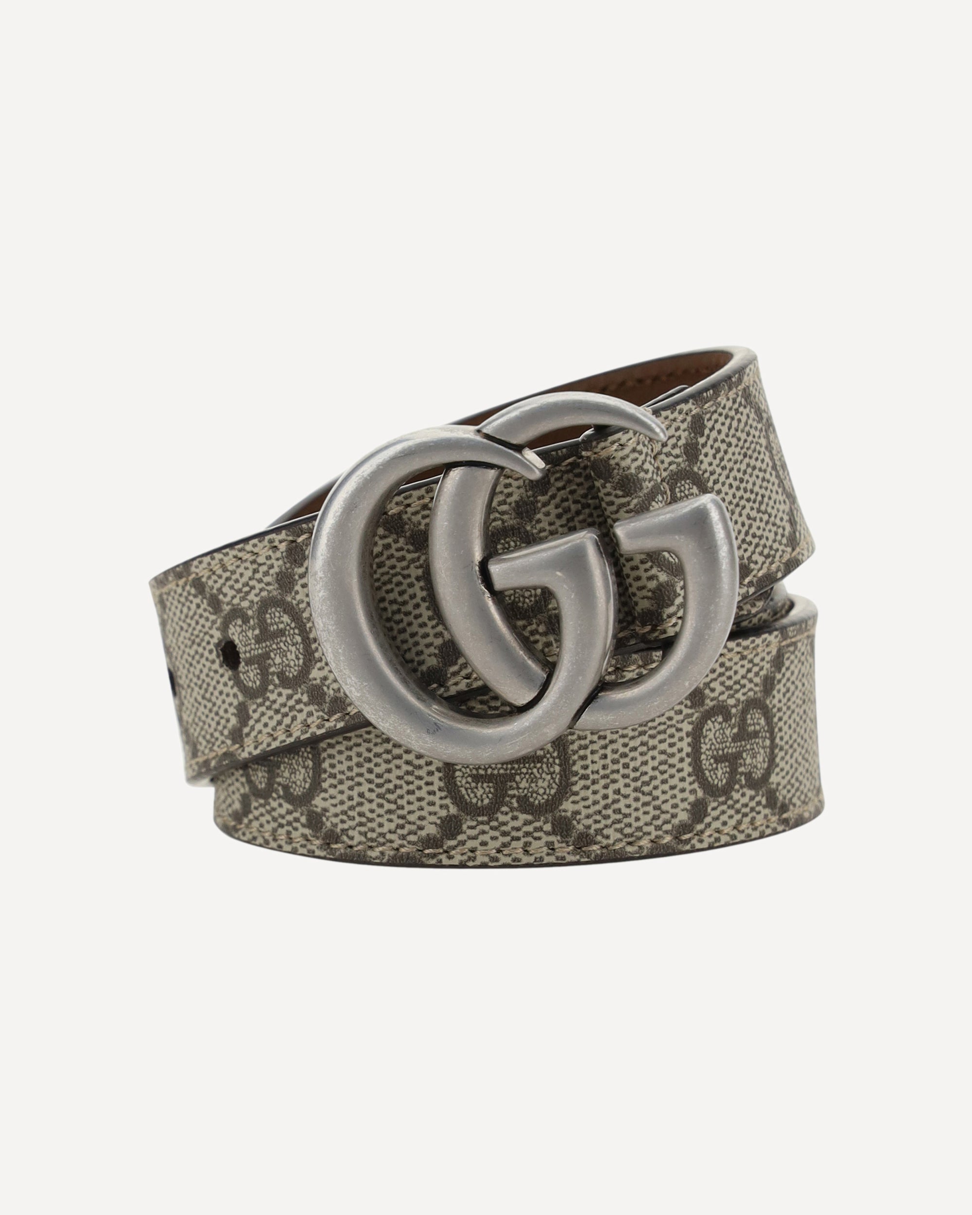 Belt by Gucci, iconic all-over repeated GG Supreme logo pattern, buckle with iconic silver-plated brand logo. Thickness: 3 cm.