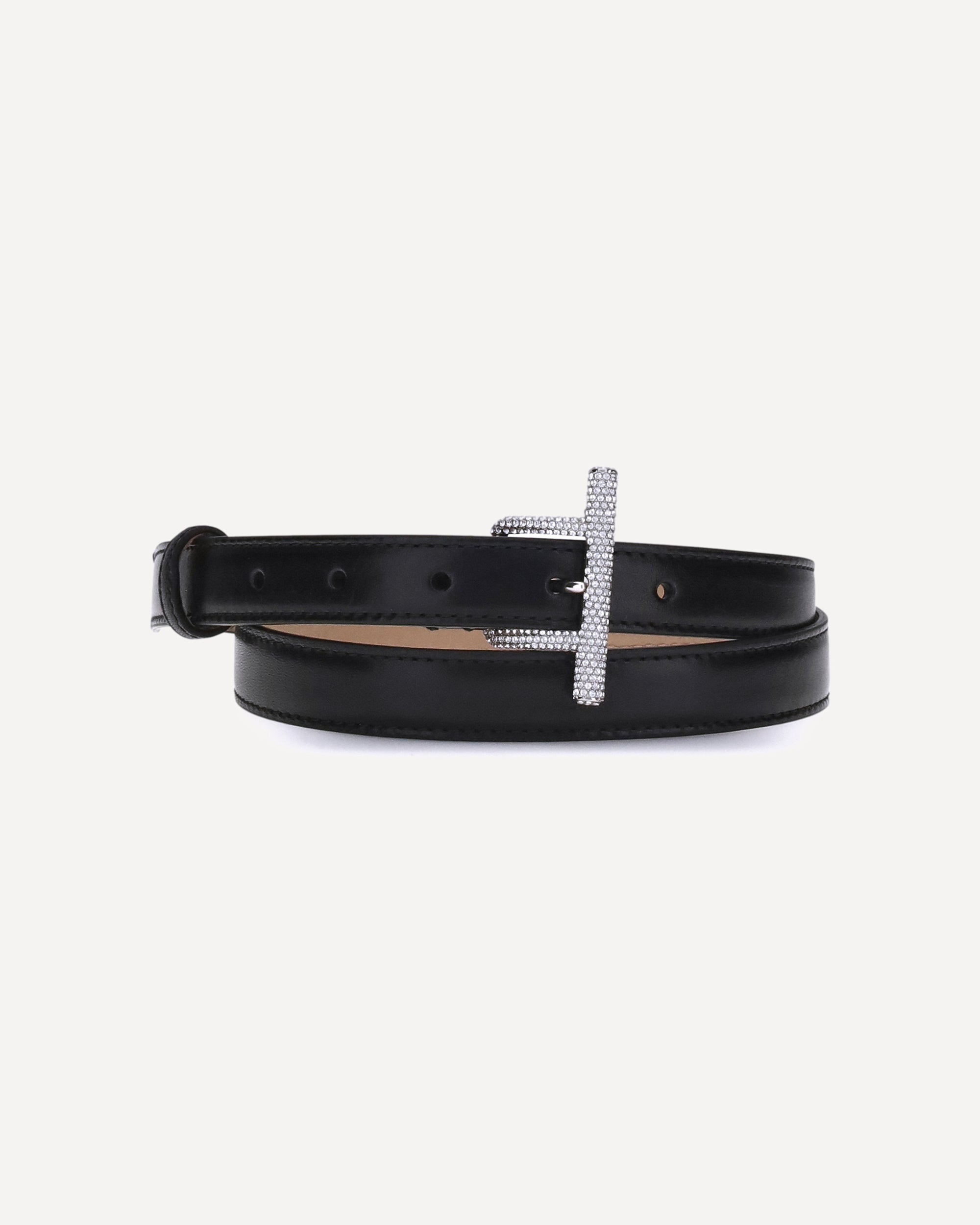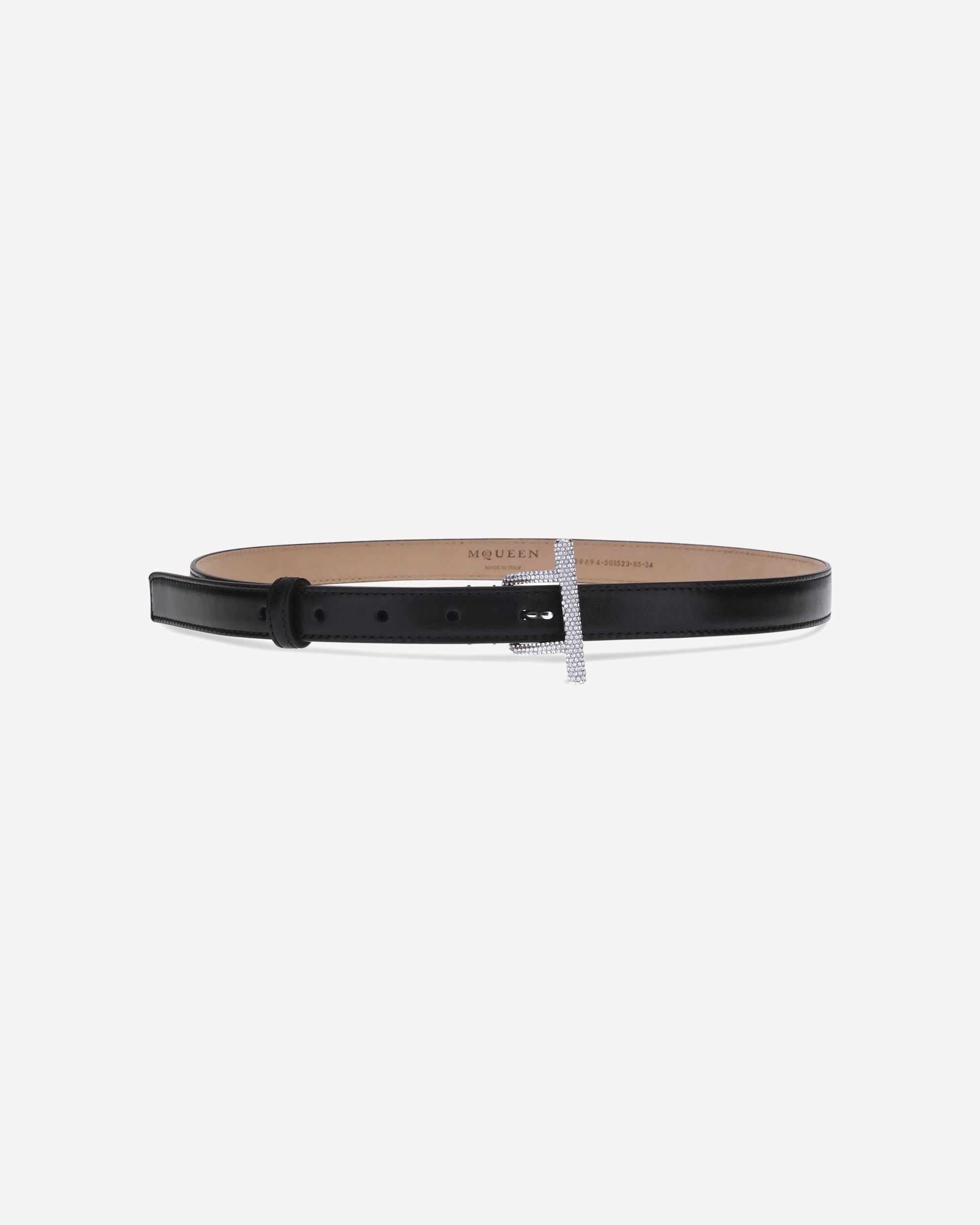 The Alexander McQueen Leather Belt is a distinctive and luxurious accessory. Made of fine smooth black calfskin leather, it is complemented by the iconic silver metal T-buckle, fully embellished with a pavé of crystals. A bold piece that elevates any outfit.