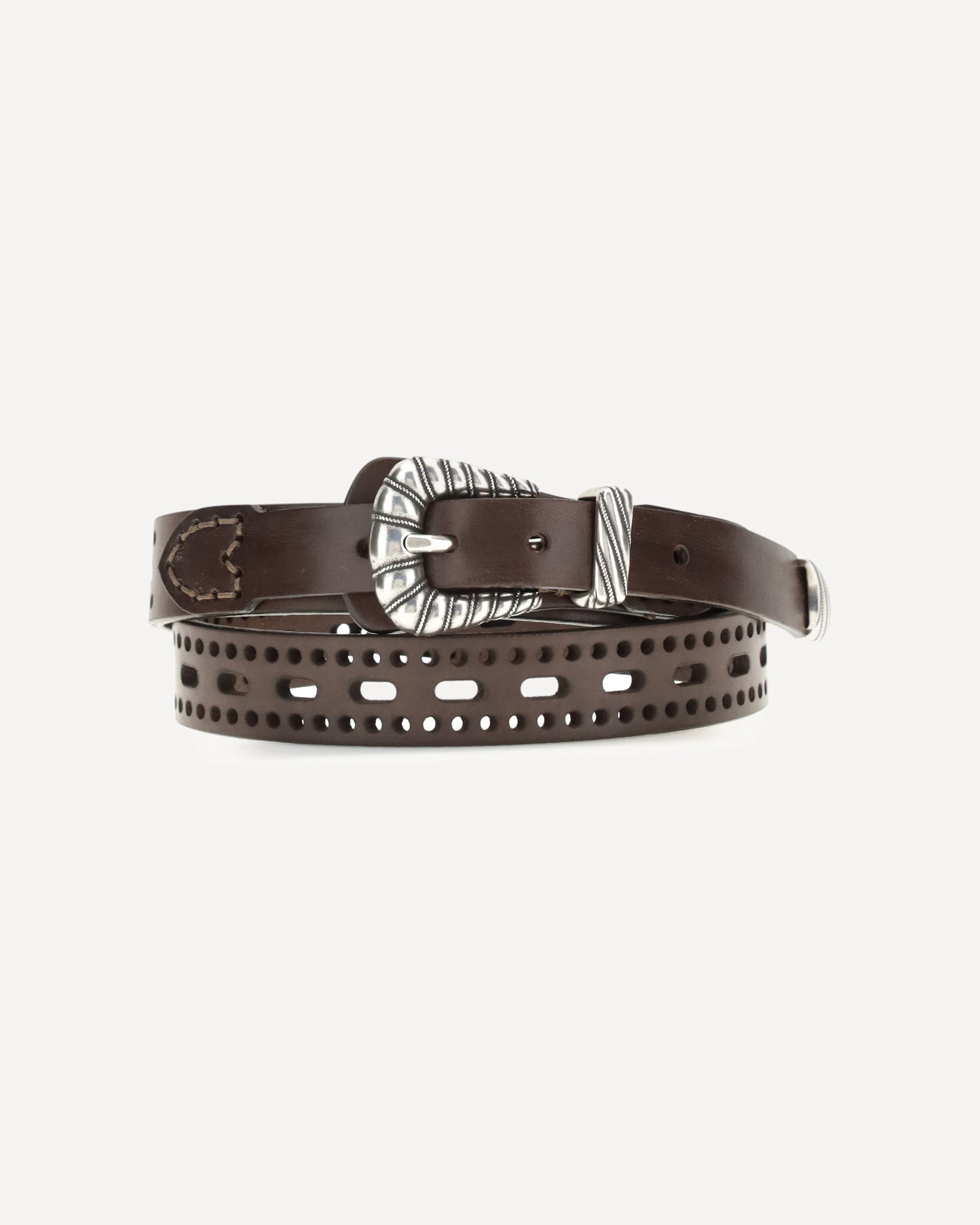 Leather Belt by Etro stands out for its perforated details and refined style. It is complemented by metal elements with a silver finish and engraved workmanship, adding a sophisticated, handcrafted touch to the accessory.