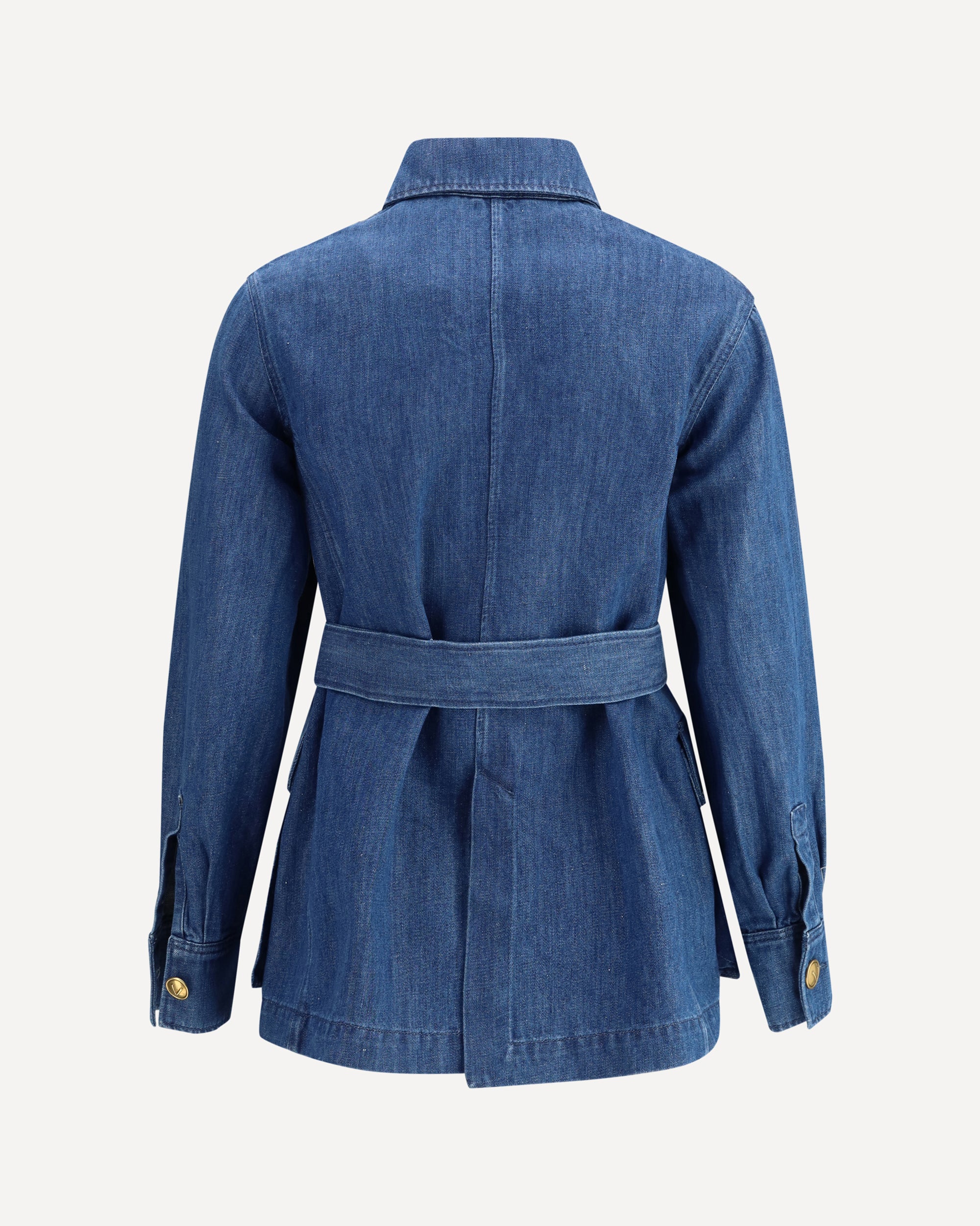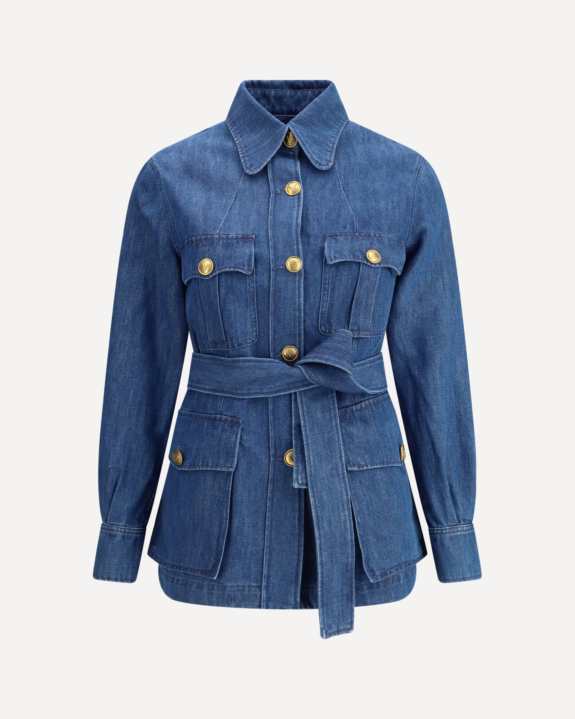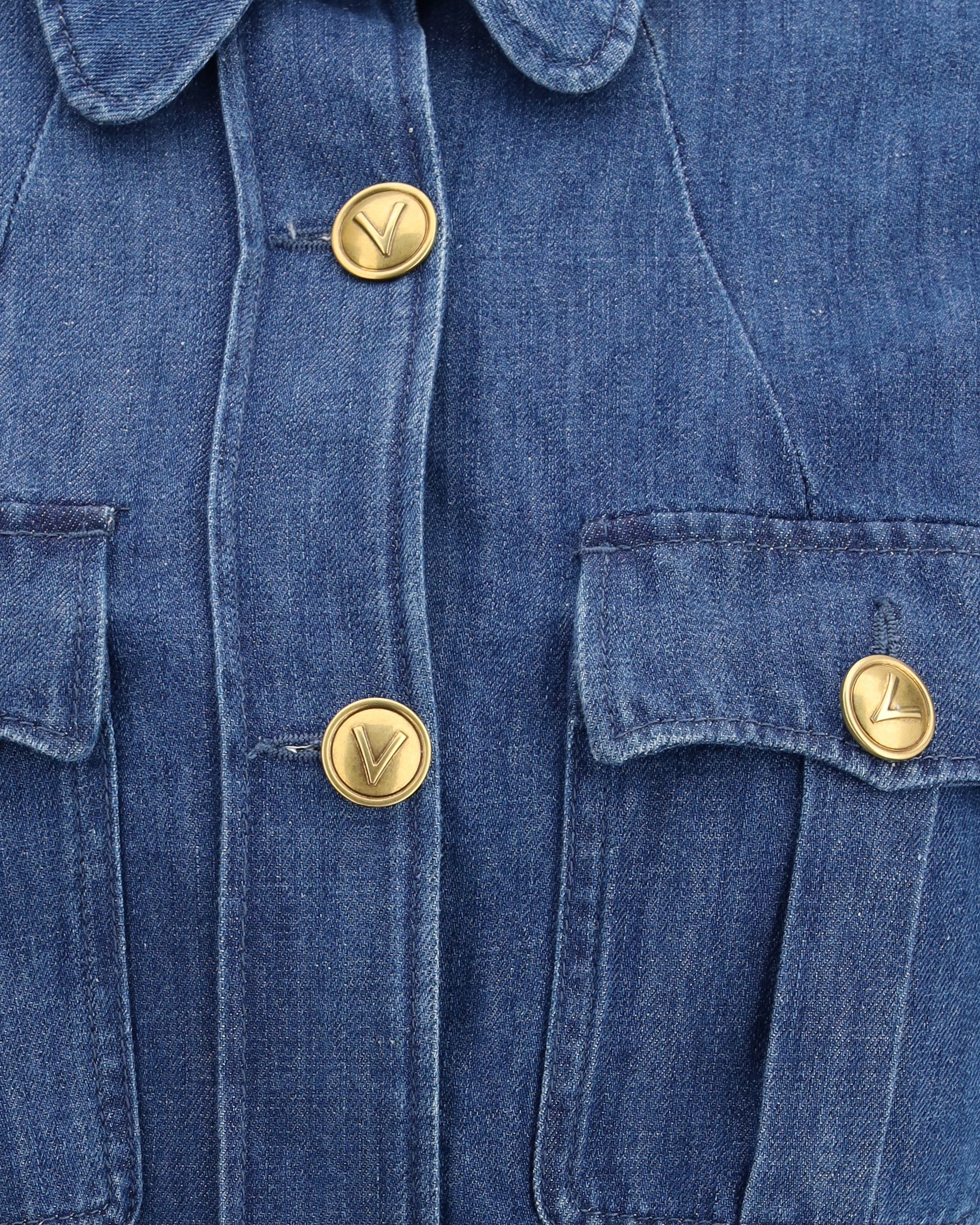The Valentino Belted Denim Jacket is a piece that combines the comfort of denim with a sophisticated design. The classic collar and front closure with embossed buttons add a touch of discreet elegance, while the four front patch pockets with flap and buttons offer functionality and a stylish detail. The matching sash, which can be tied at the waist, allows you to customize the fit, emphasizing the silhouette. A versatile and modern piece, perfect for creating casual-chic looks with a distinctive touch of high fashion signed Valentino.