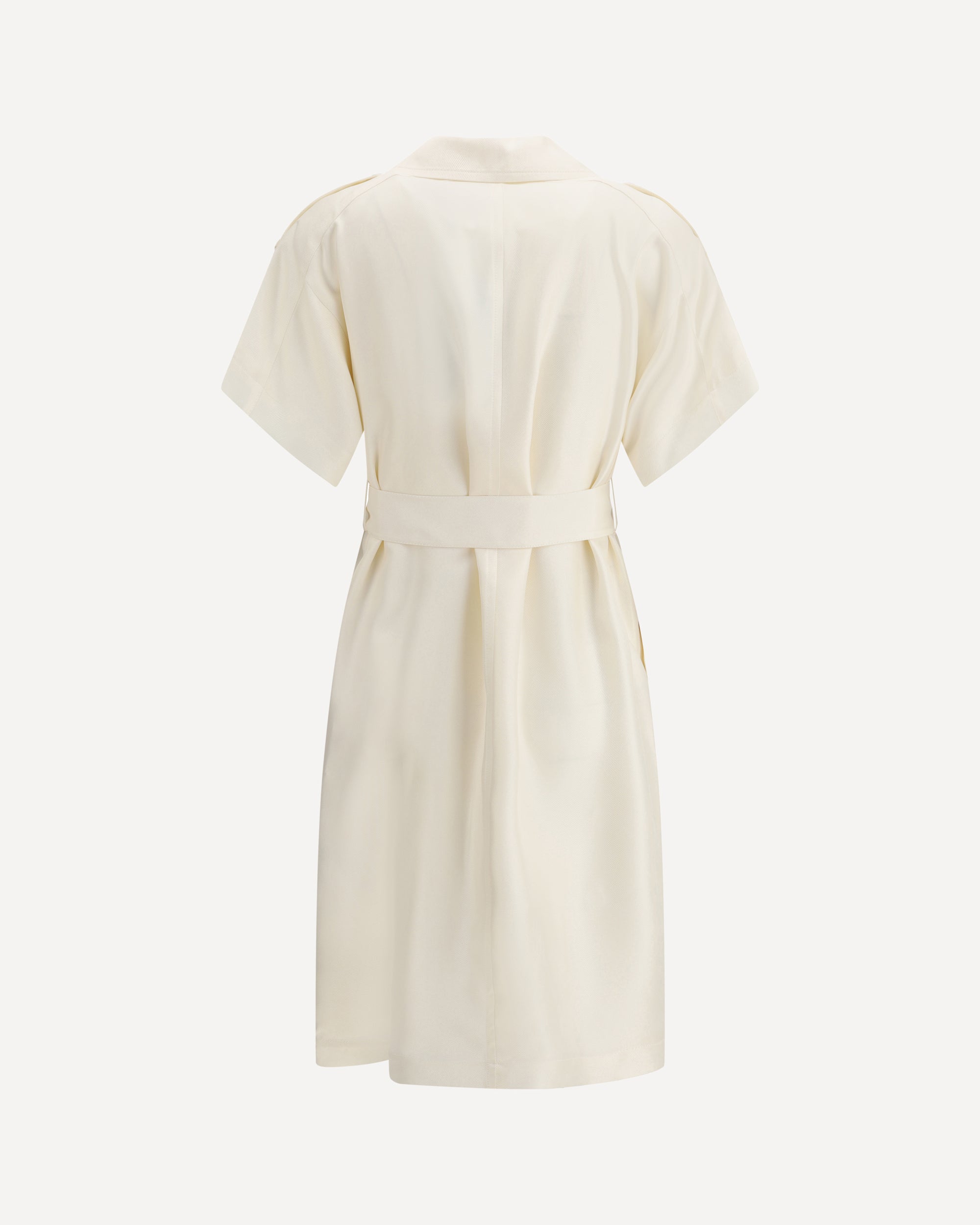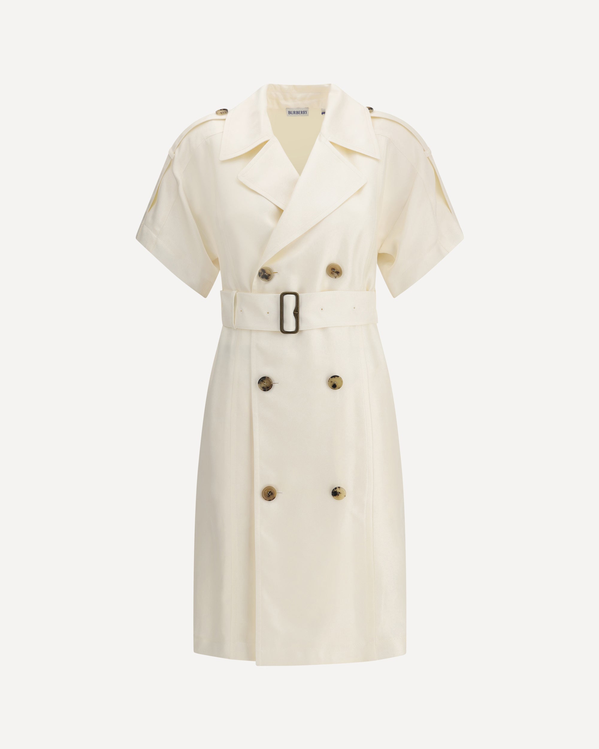 Burberry's Belted Trench Dress blends sartorial elegance and heritage inspiration. Featuring wide lapels, a double-breasted button closure and knee length, it has two side welt pockets and pouch pockets for added functionality. The design echoes iconic elements of the brand's traditional trench coat, such as structured epaulettes and a waist belt that enhances the silhouette.