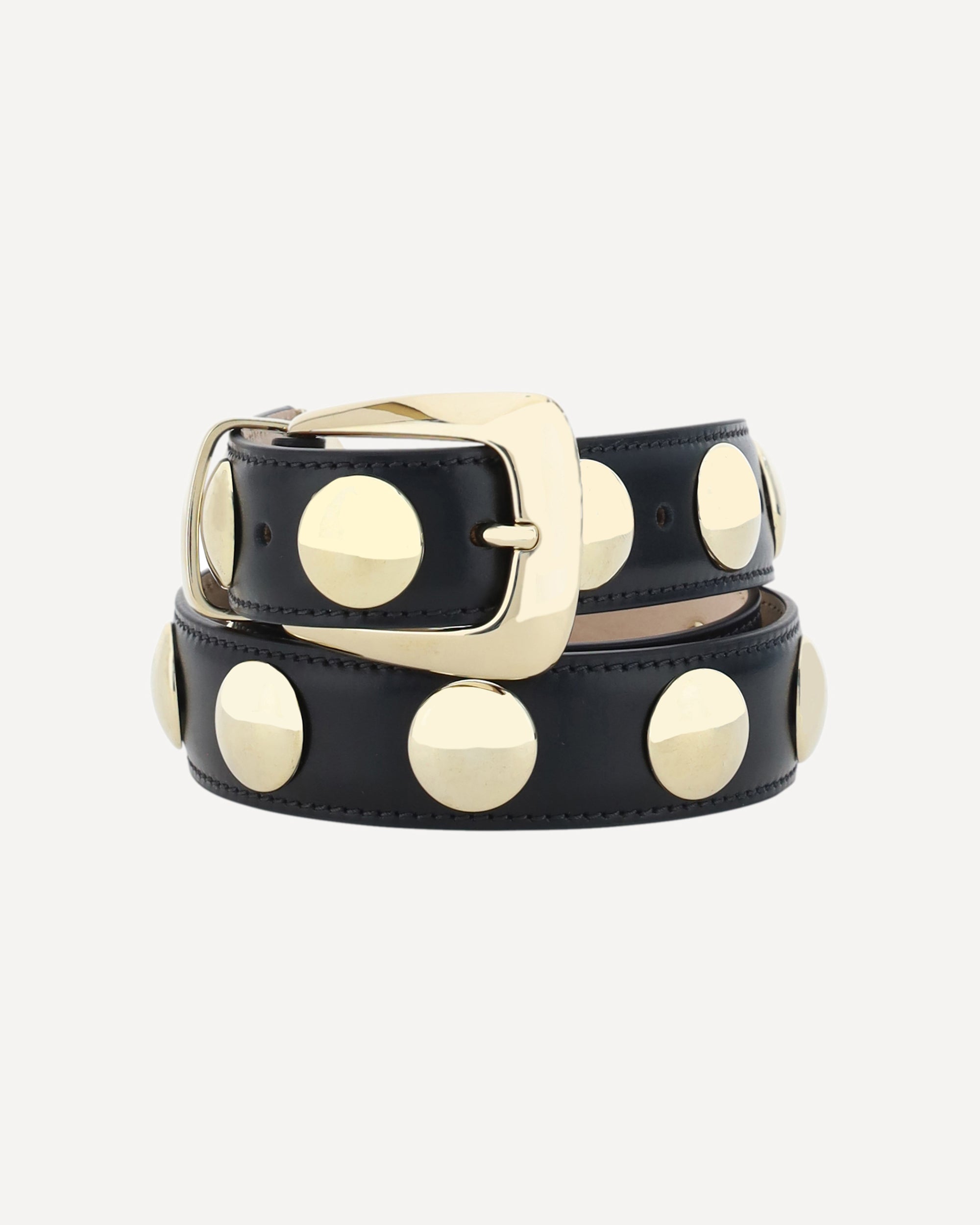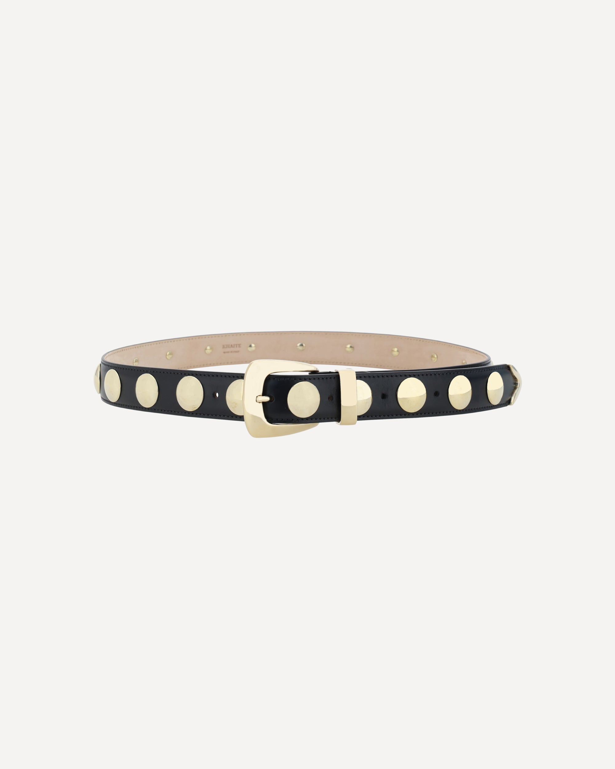 Khaite's Benny leather Belt combines elegance and panache in a refined design. Made of smooth leather, it is decorated with golden spherical studs and completed with a matching metal buckle. Perfect for enhancing dresses, blazers or high-waisted pants with a bold and sophisticated touch.