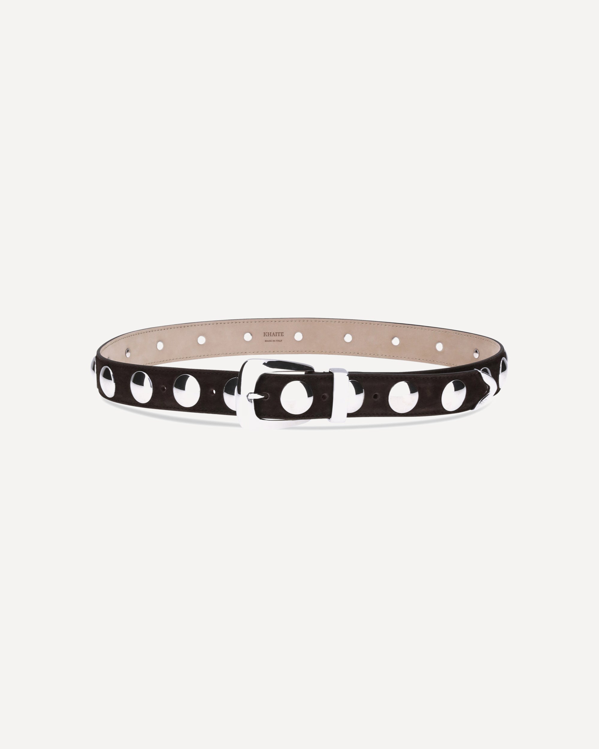 Khaite's Benny Leather Belt combines elegance and panache in a refined design. Made of smooth leather, it is decorated with silver spherical studs and completed with a matching metal buckle. Perfect for enhancing dresses, blazers or high-waisted pants with a bold and sophisticated touch.
