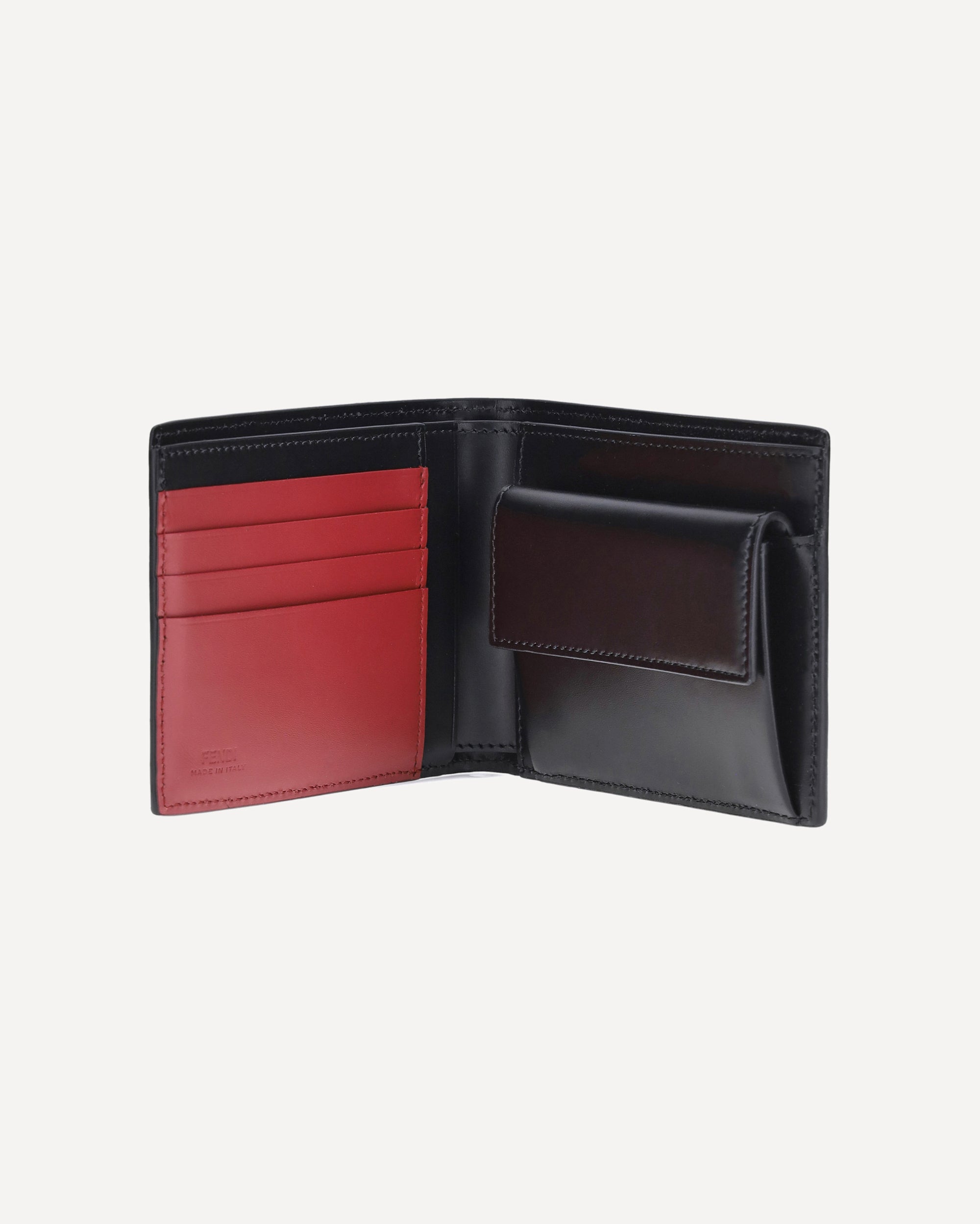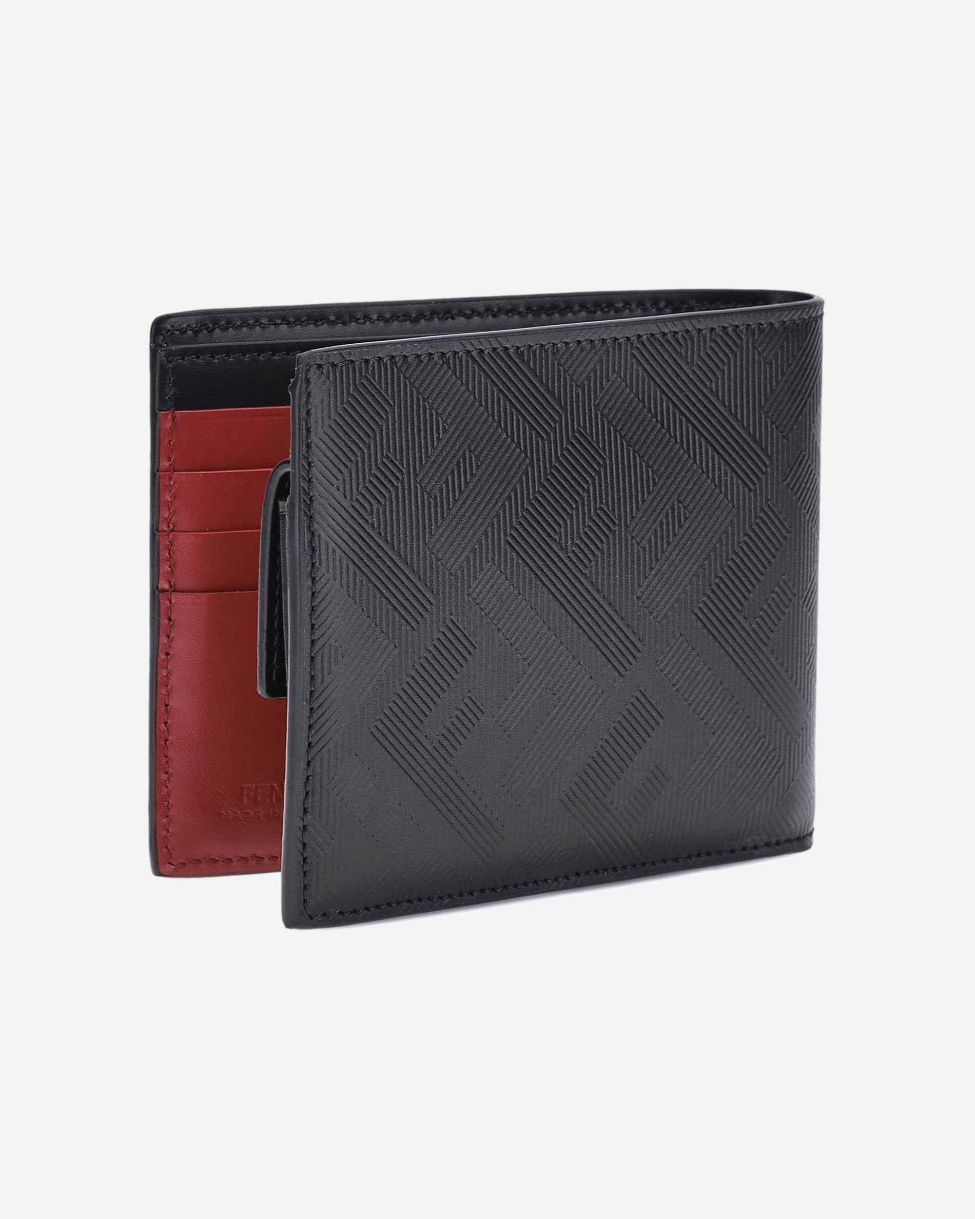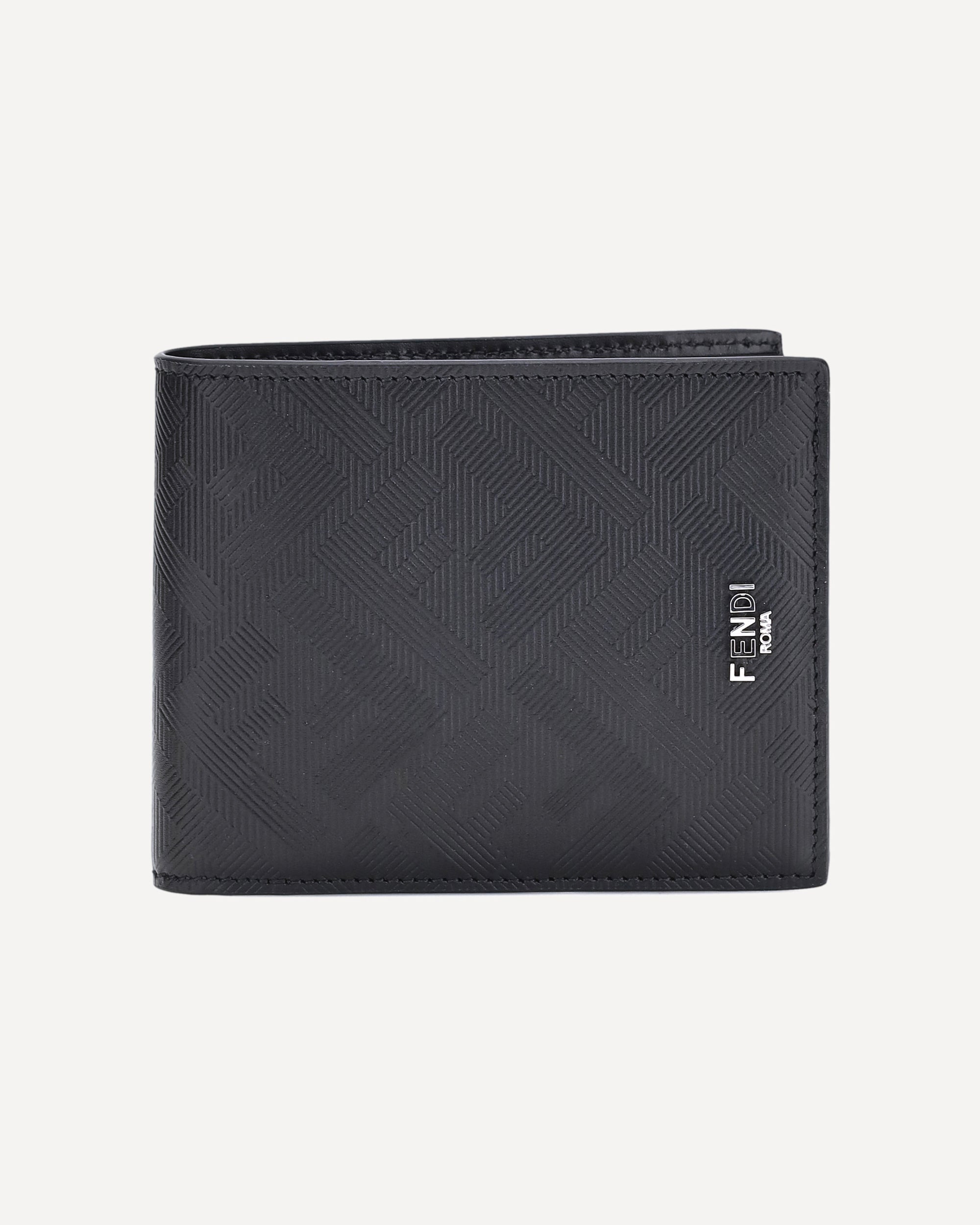 Leather Wallet with Embossed FF Motif by Fendi, bifold model, featuring the FF motif embossed across the surface and metal lettering logo on the front. The interior features a bill compartment, card slots and a contrasting interior panel for an extra touch of elegance.
