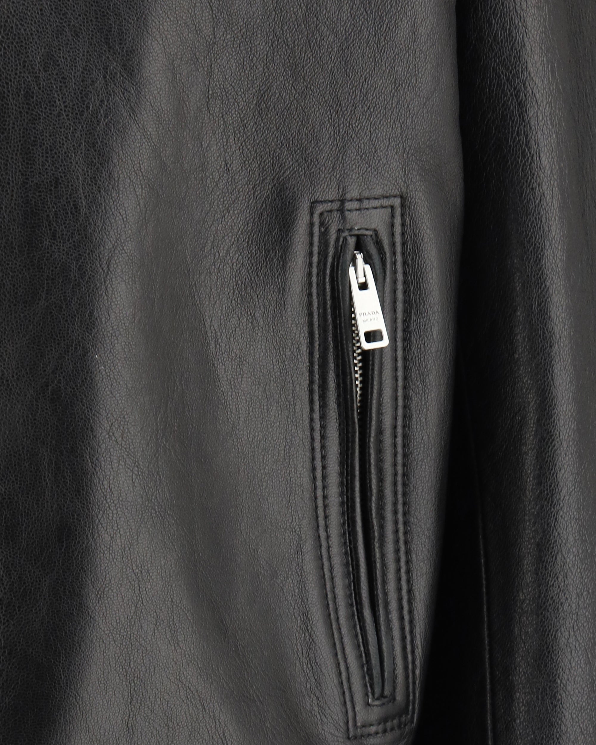 Prada's Biker Leather Jacket combines a bold and sophisticated design. The snap-button front closure offers practicality and clean styling. Two zippered welt side pockets and a zippered chest pocket add a functional and modern touch, while a zippered sleeve pocket further enhances the garment with useful and stylish details. The classic lapels lend a touch of sophistication, complementing the bold, contemporary look of this leather jacket, ideal for a bold, urban look.