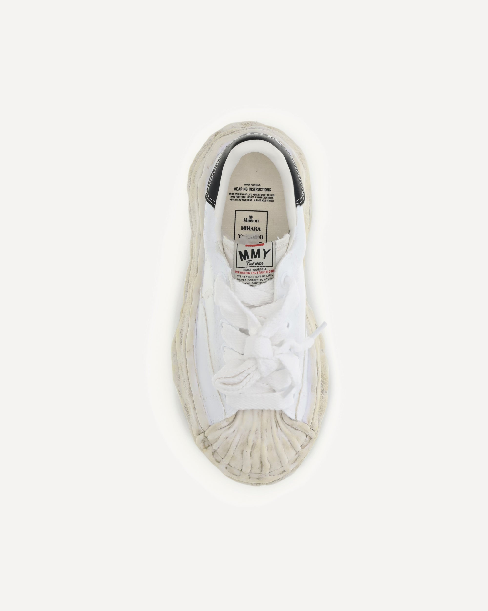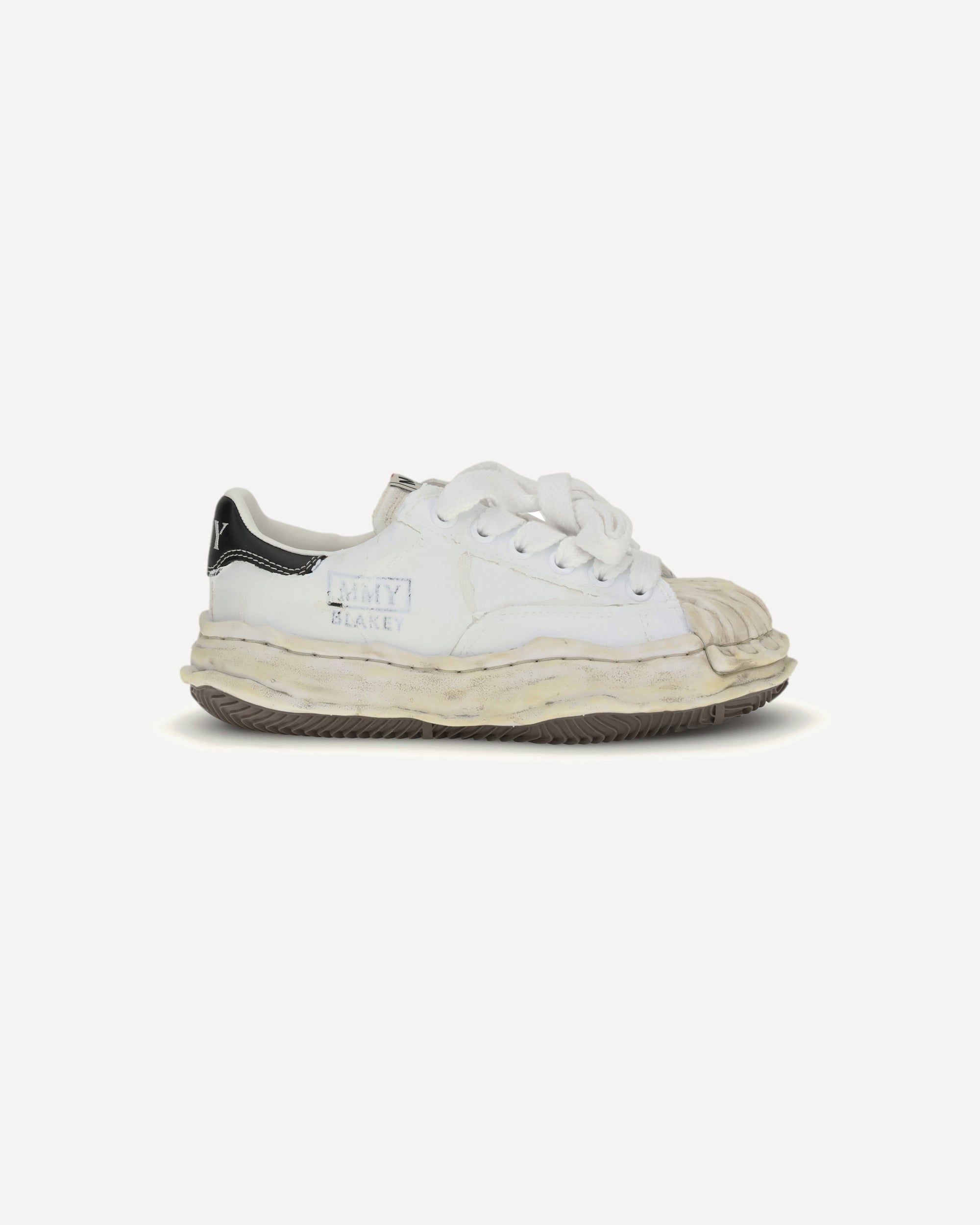 The Blakey Sneakers by Maison Mihara stand out for their experimental, urban style. Made of canvas with ripped foil, they feature a logoed heel and a lace-up closure that ensures an adjustable fit. A rubber sole and toe complement the design, lending a gritty and contemporary touch typical of the brand's aesthetic.