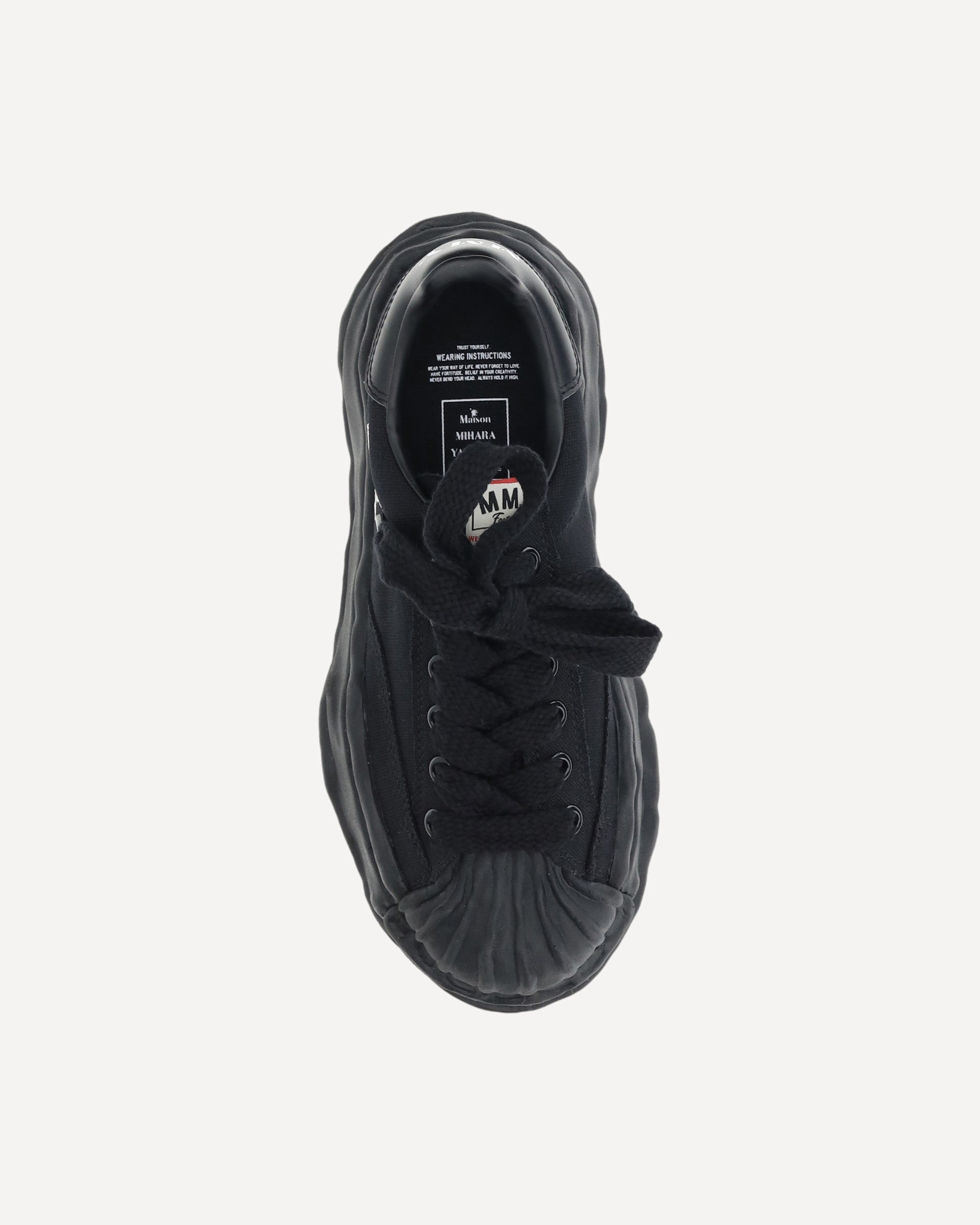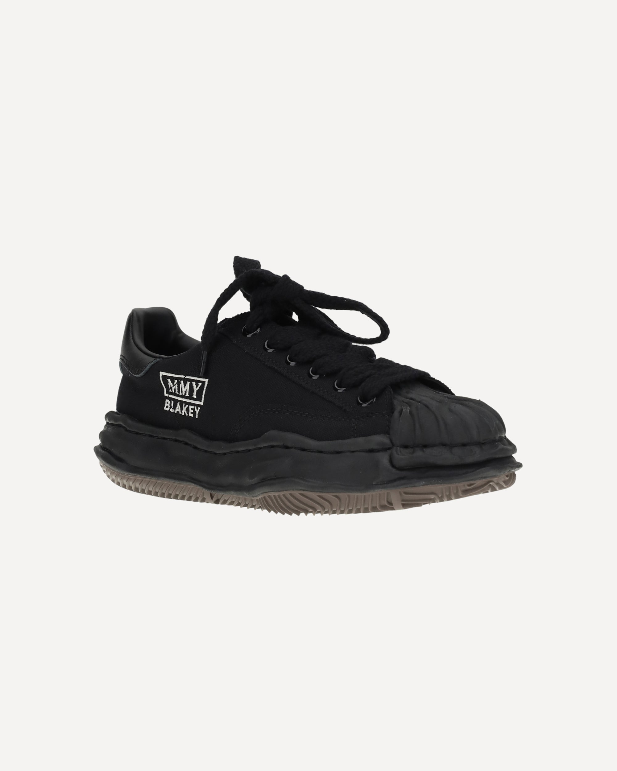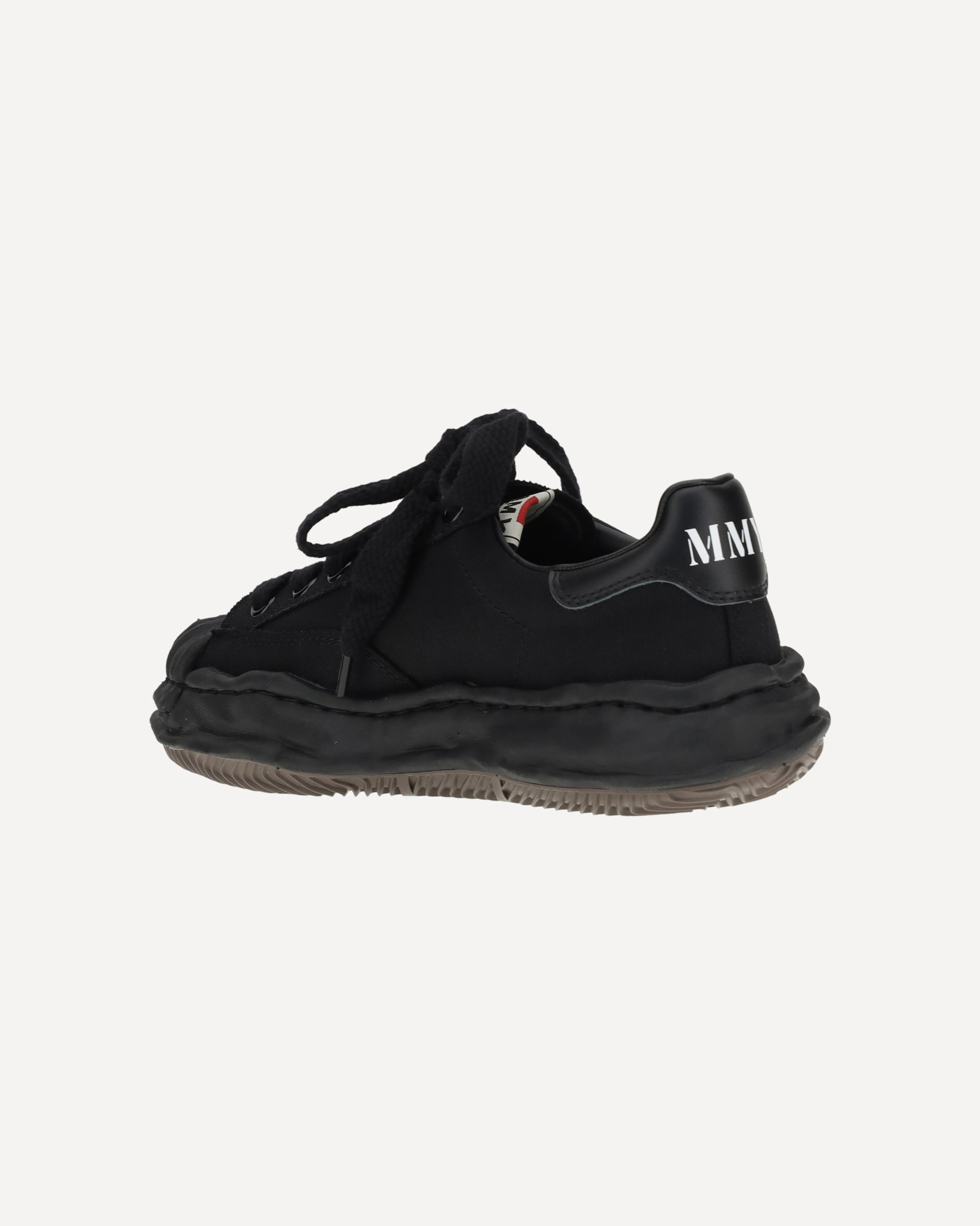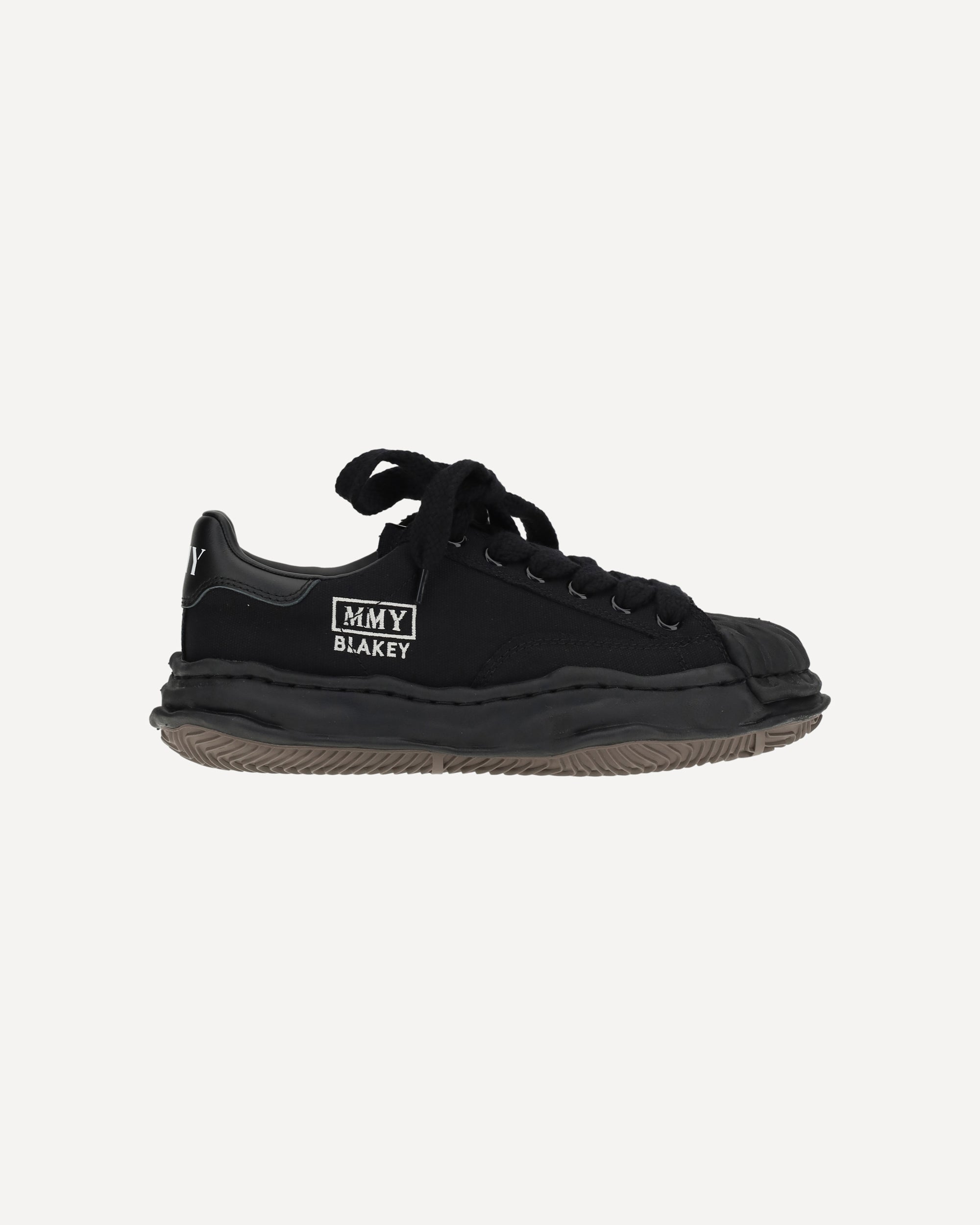 Maison Mihara's Blakey Sneakers are a perfect blend of urban style and distinctive details. The black canvas upper, paired with white rubber, creates a stylish contrast. The lace-up closure and logo patch tongue add a touch of personality, while the side logo embroidery and white leather heel with logo print highlight the brand. Contrast stitching and a rubber sole complete the design, making these sneakers a versatile and trendy accessory.