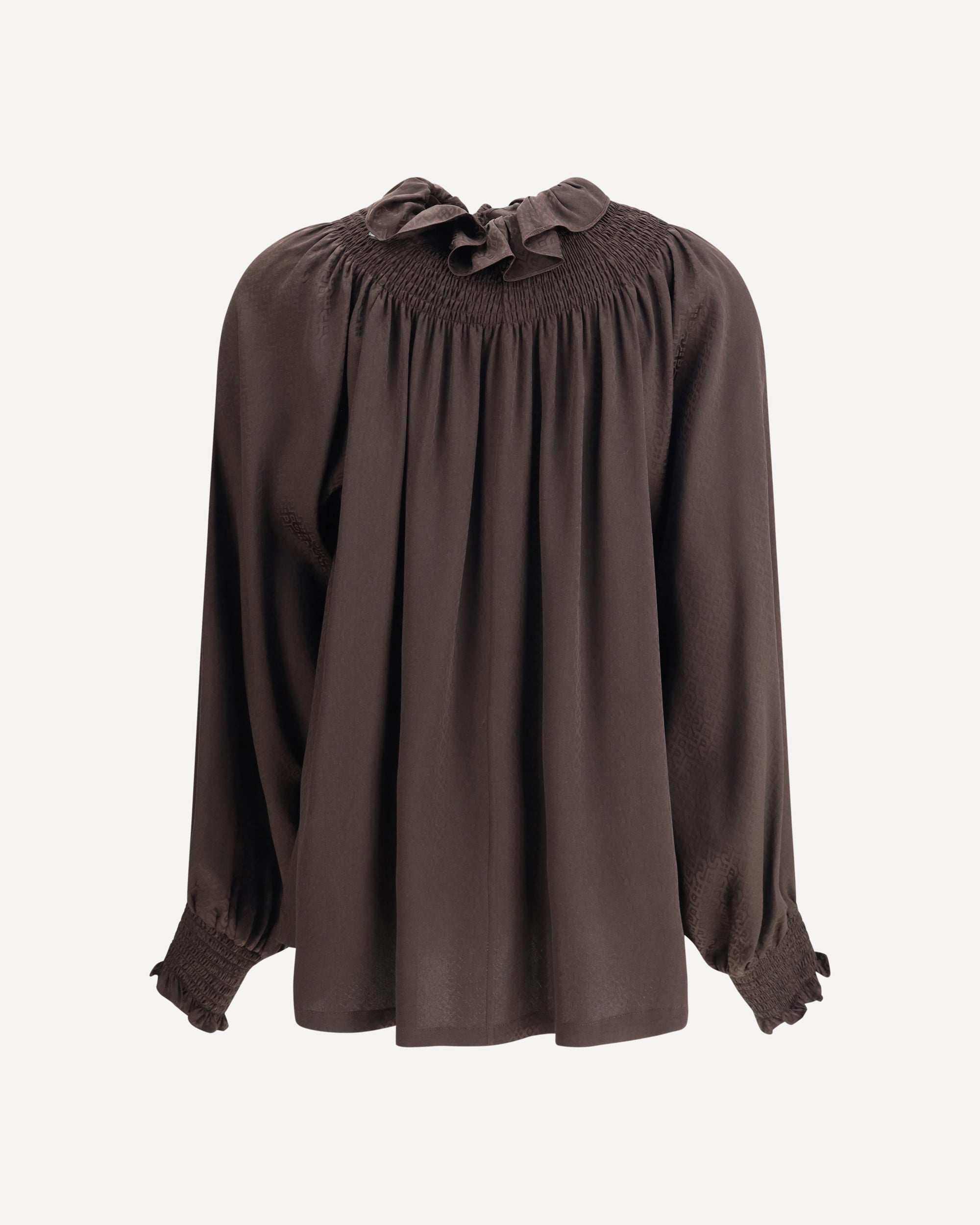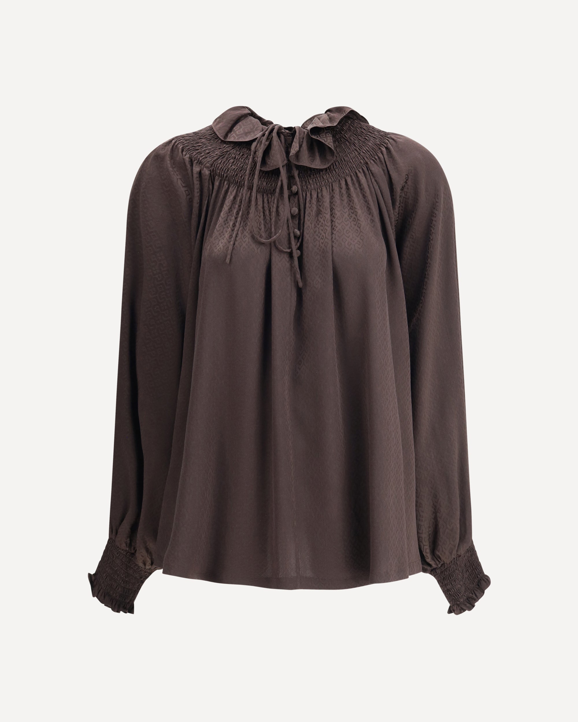 The Geometric Silk Blouse by Burberry is crafted in Italy from silk crêpe de chine, jacquard-woven with a geometric pattern inspired by wallpapers found in British stately homes. Designed for a relaxed fit, it features smocking and delicate ruffles that shape the neckline and cuffs. Button fastening, a self-tie collar, elasticated cuffs, and side splits complete this timelessly elegant piece.