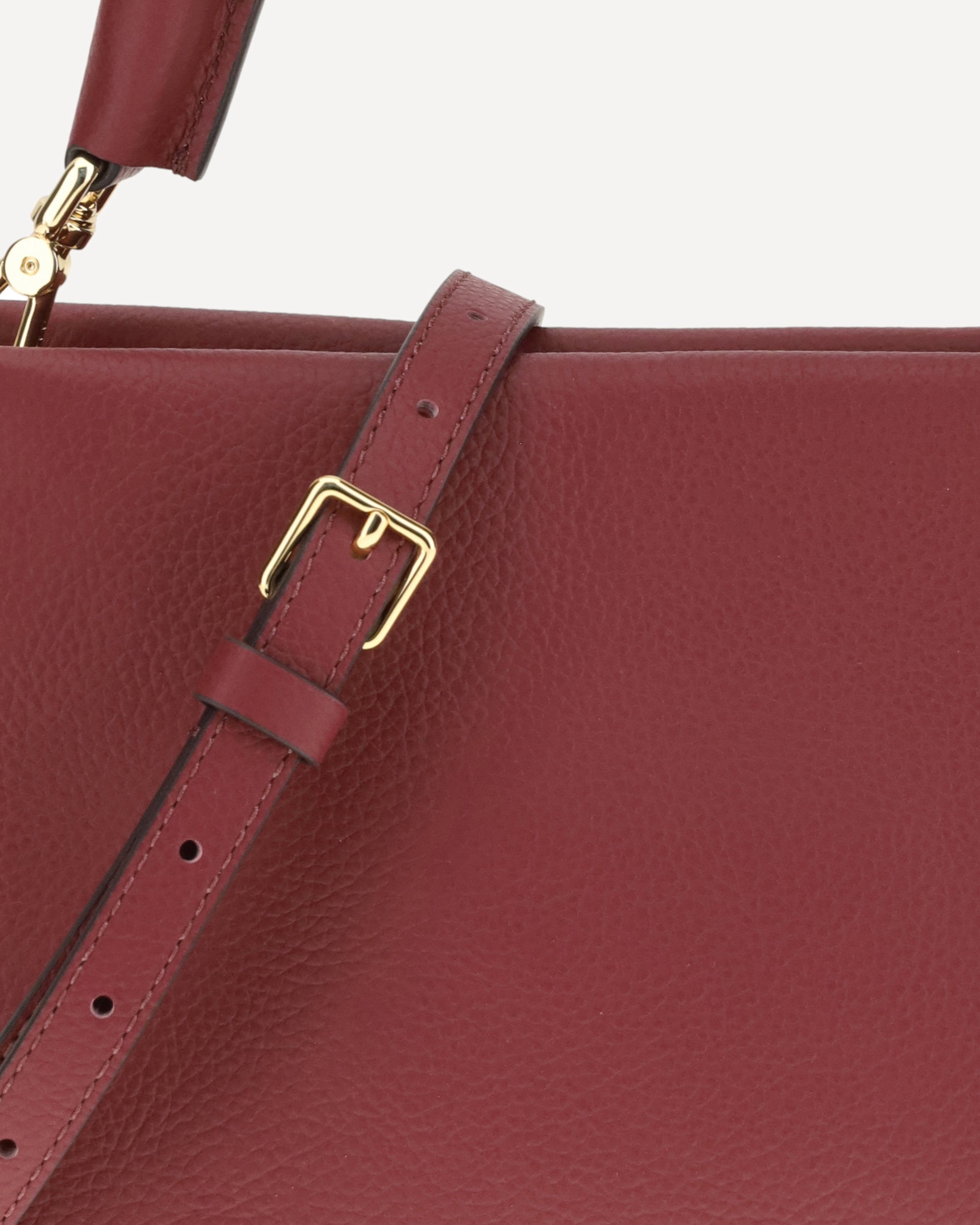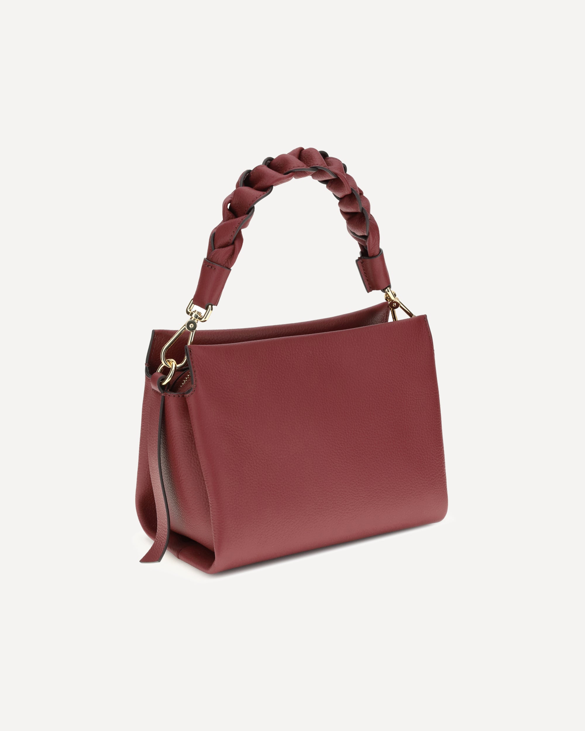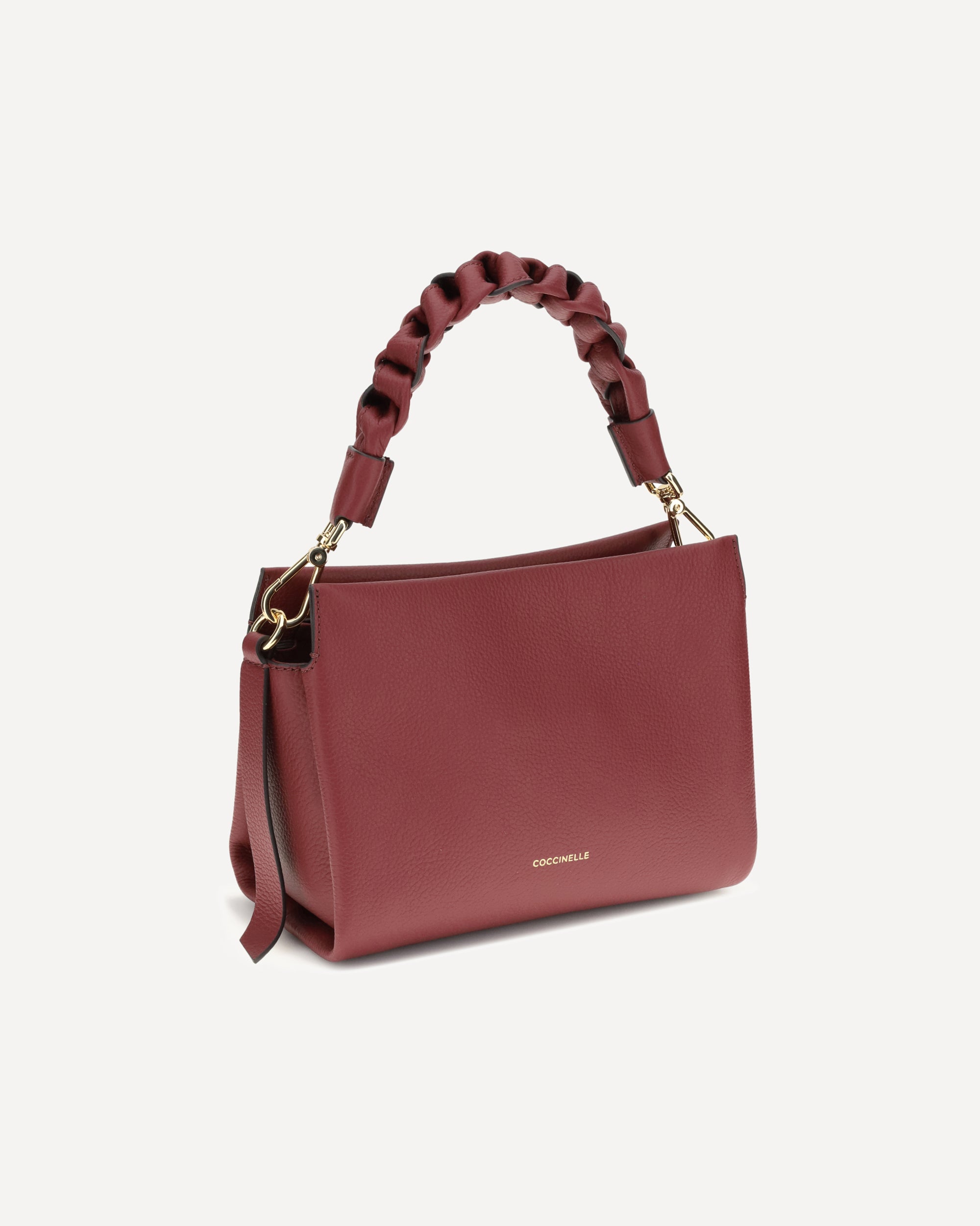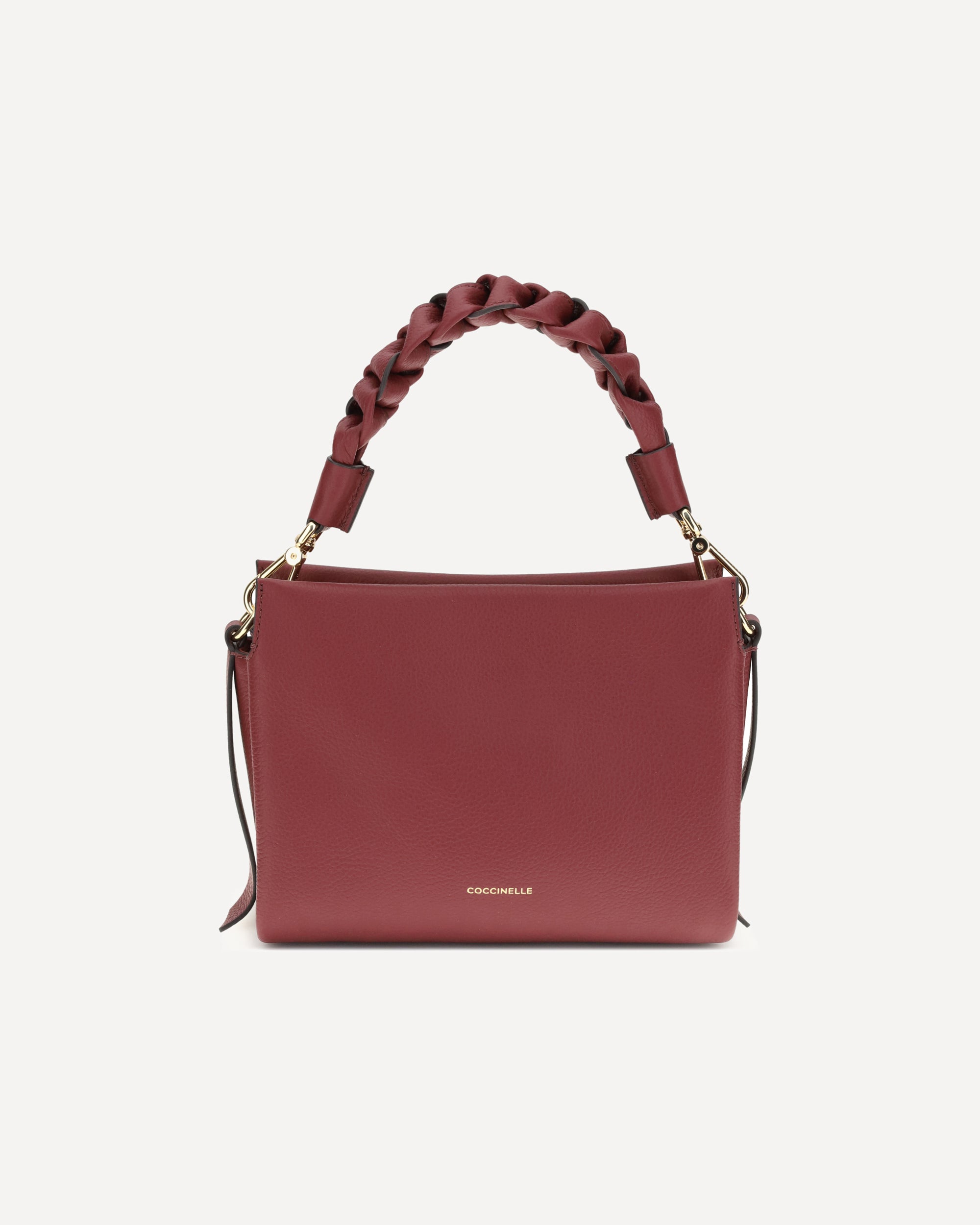 The Boheme Handbag by Coccinelle is an elegant and sophisticated accessory made of high-quality garnet leather. The rigid leather top handle, with a braided and twisted detail, adds a handcrafted and distinctive touch. The removable and adjustable flat shoulder strap allows it to be worn on the shoulder or crossbody for added versatility. The top zipper closure provides security, while the brand's iconic monogram, press-stamped on the front, lends a touch of recognition.