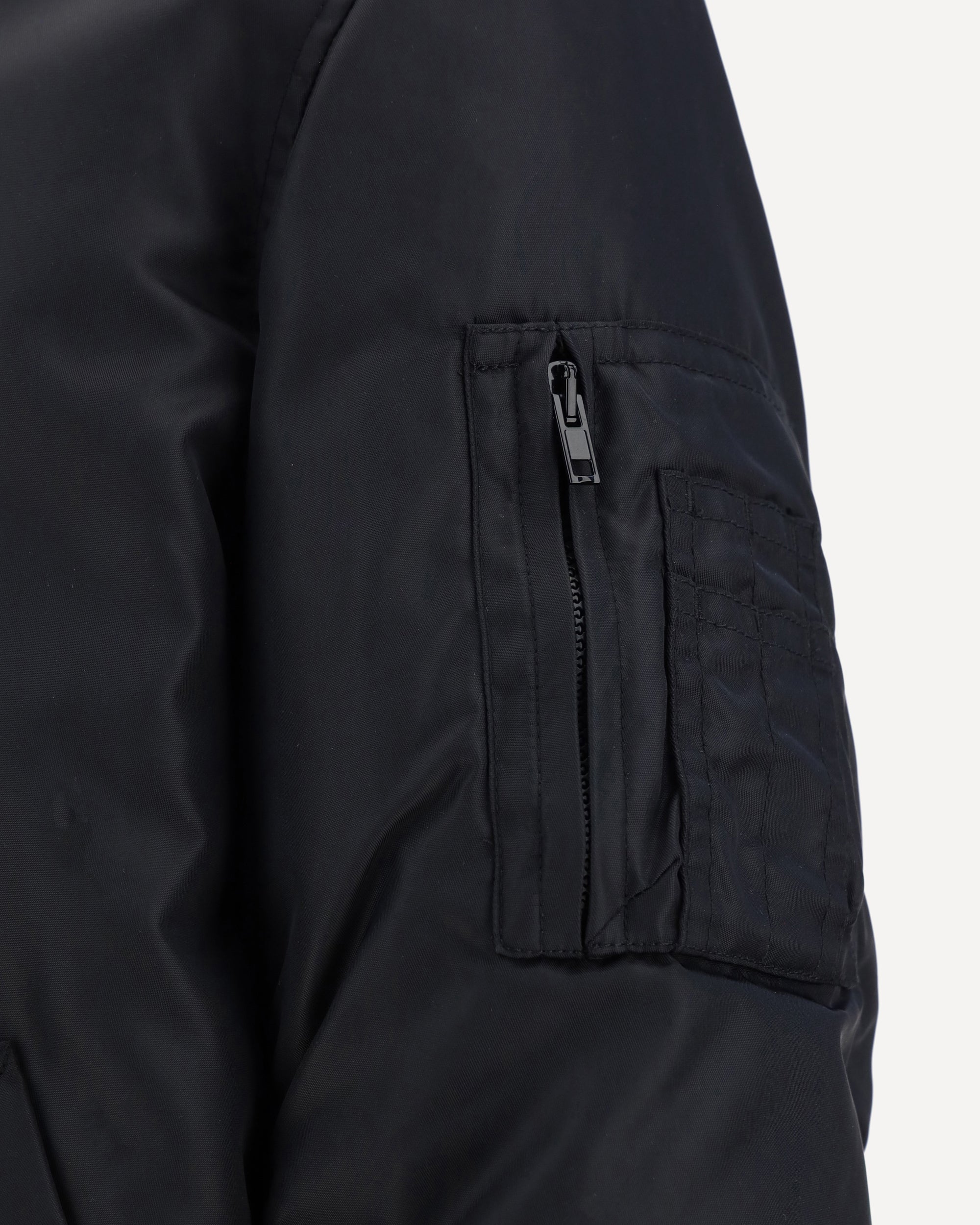Bomber Jacket by Moschino, front zipper closure, ribbed crew neck, ribbed cuffs, ribbed hem, two side welt pockets, zipper pocket on left sleeve, all-over quilted and padded design, contrasting lettering print on back, regular fit.