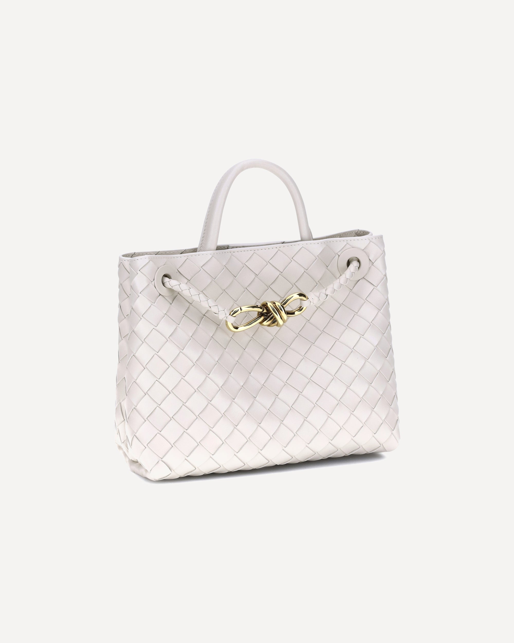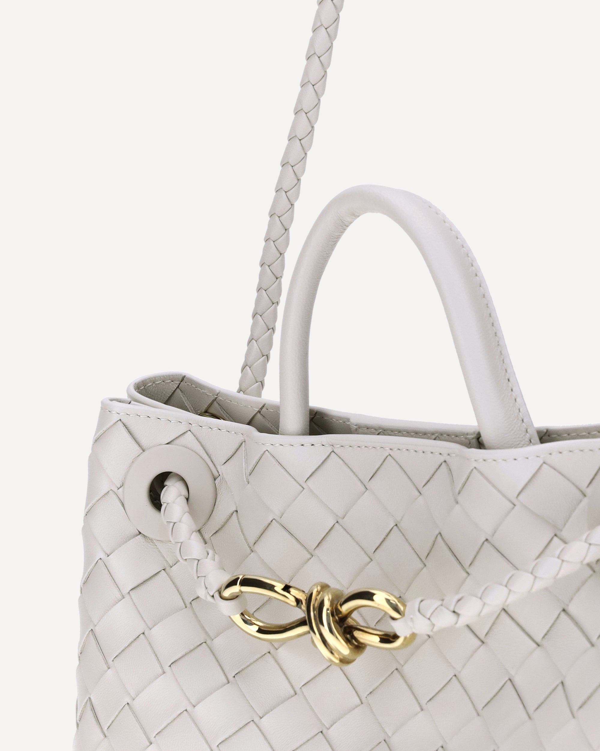 The Andiamo lambskin Shoulder Bag by Bottega Veneta features the brand's iconic intrecciato design covering the entire surface. It has a single rigid handle and a matching sliding shoulder strap, embellished with the iconic knotted brass Muse detail. The bag closes via a top magnetic flap. Inside, it features dual interior compartments and an interior welt pocket for optimal organization. A stylish and practical accessory for any occasion.