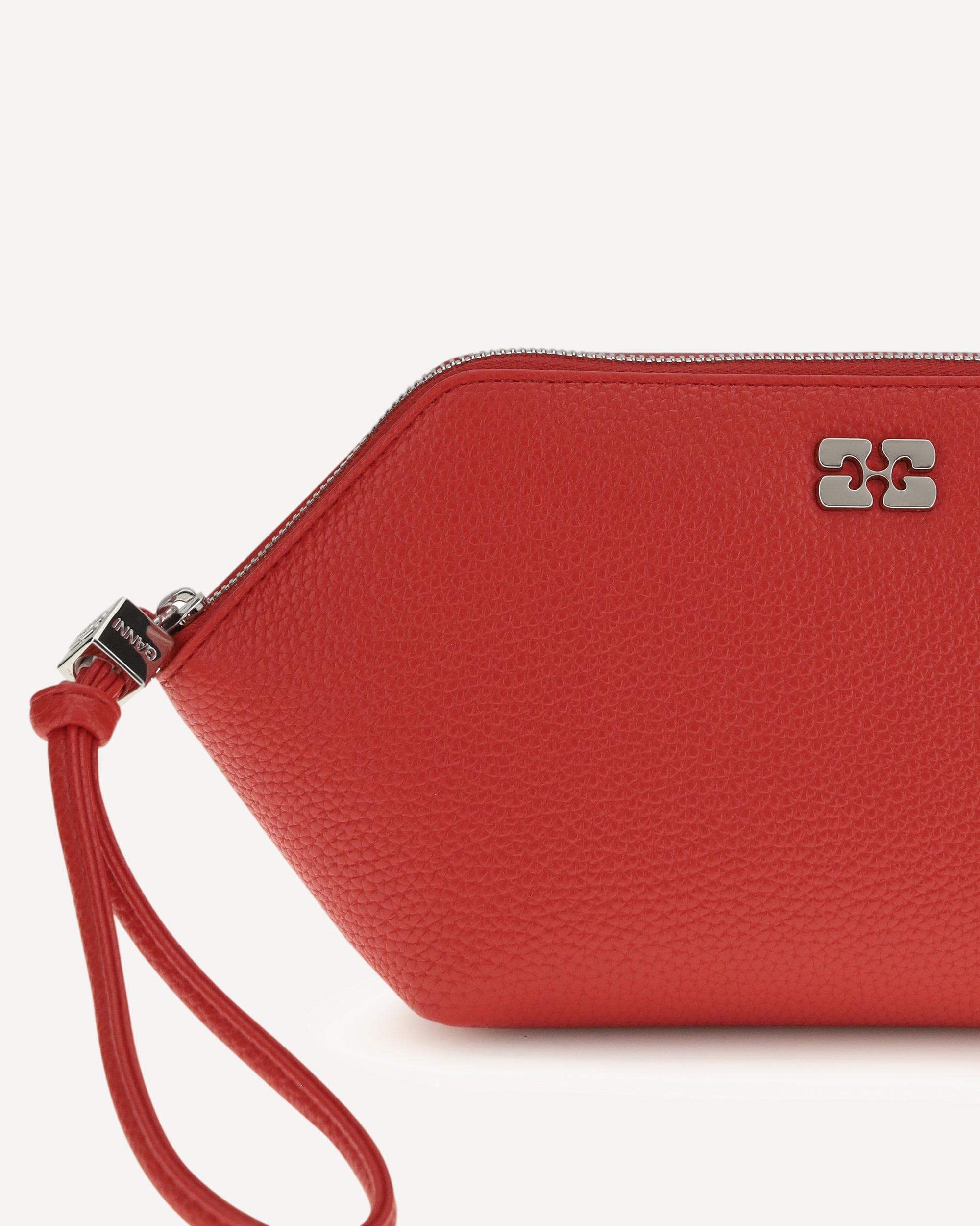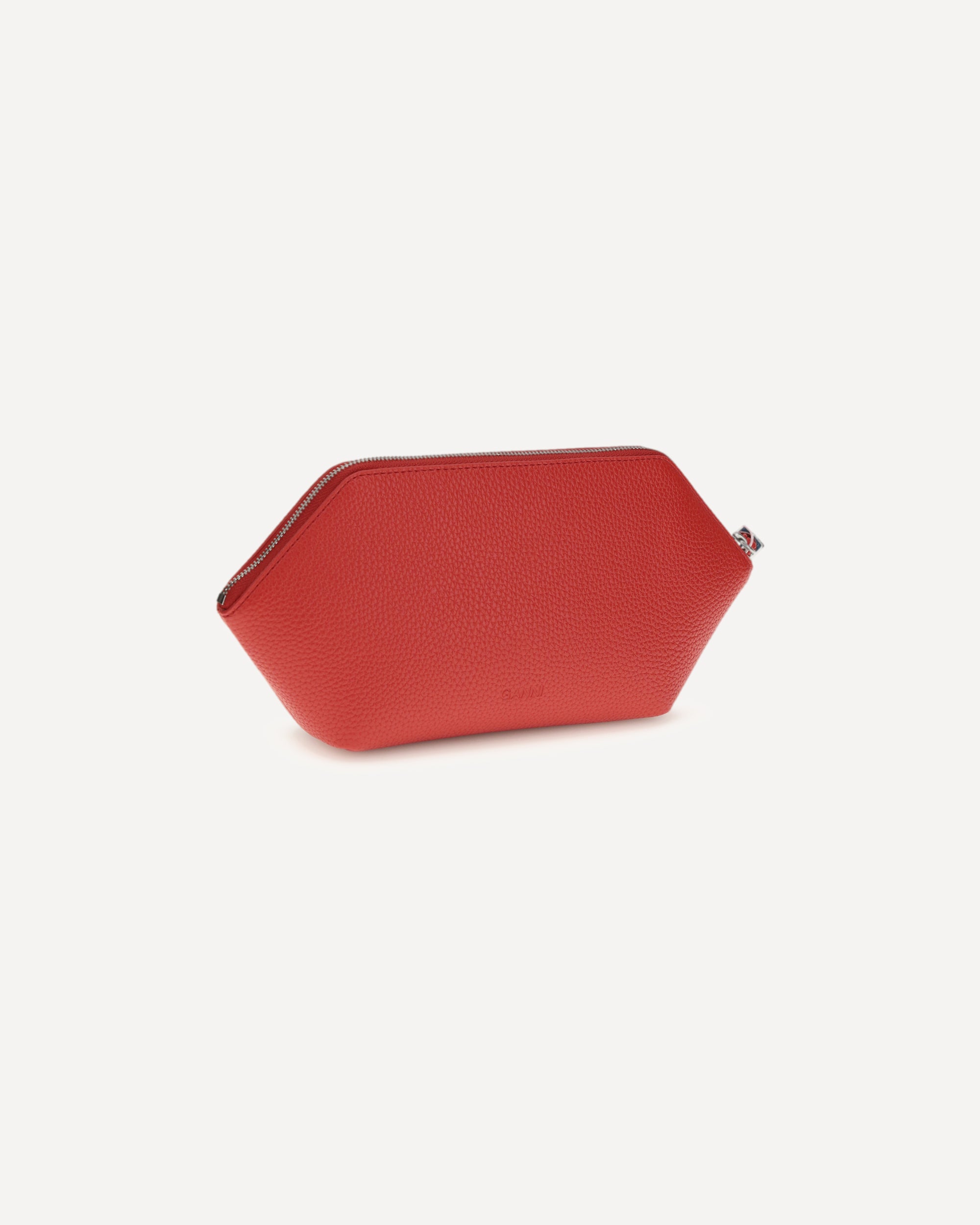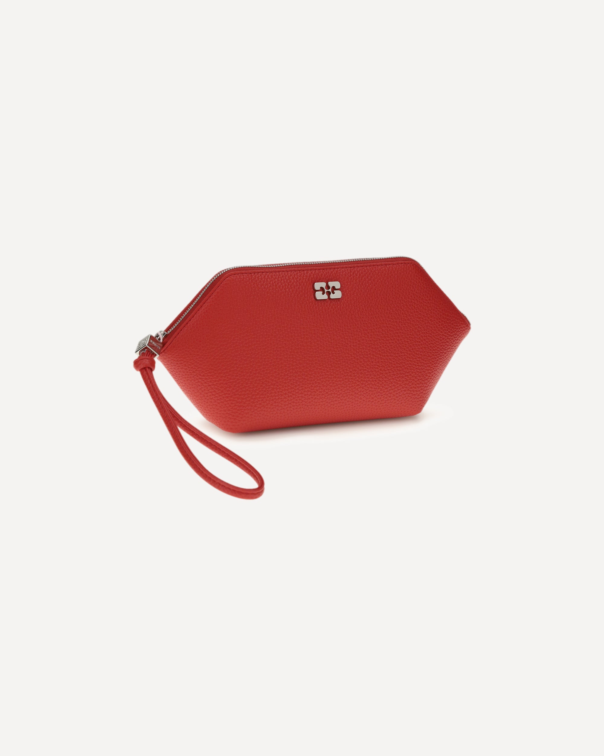The Pouch Bou Make Up by Ganni, ideal for makeup, combines practicality and style in a compact design. Featuring a zipper closure and handle strap, it is embellished with the butterfly logo and metal studs engraved with the Ganni and Butterfly logos, making it an elegant and functional accessory.
