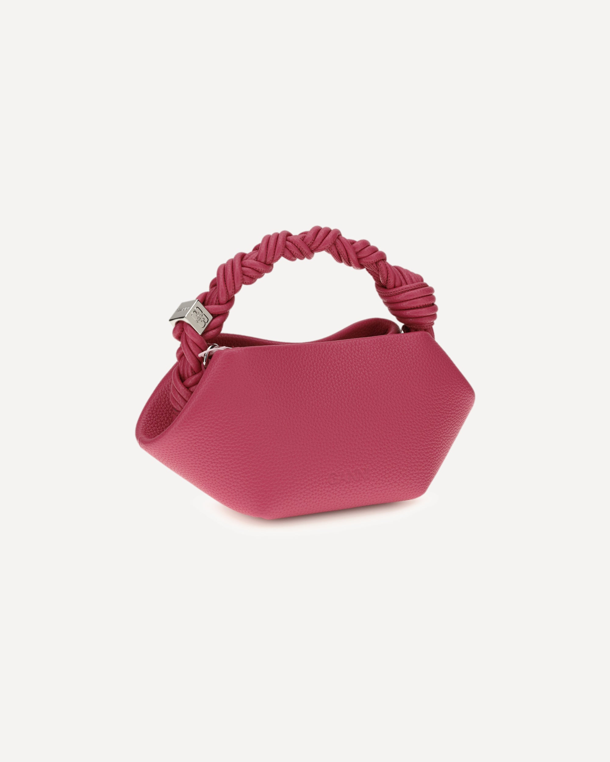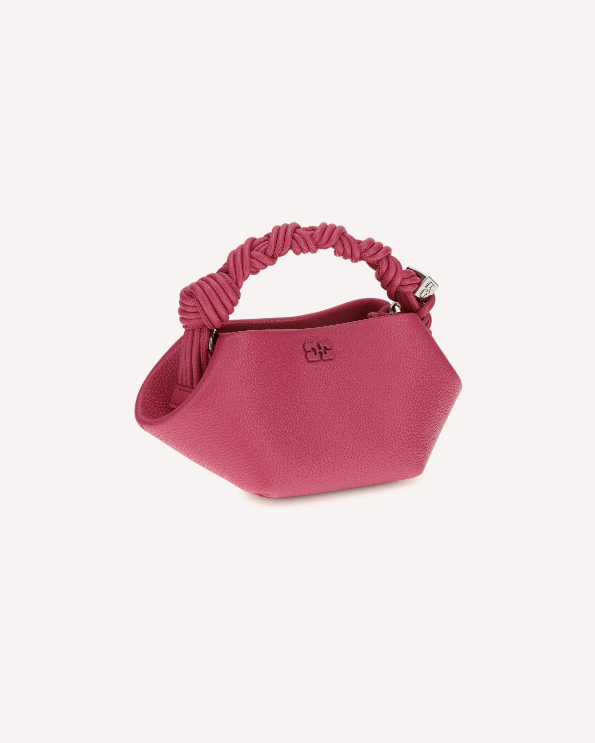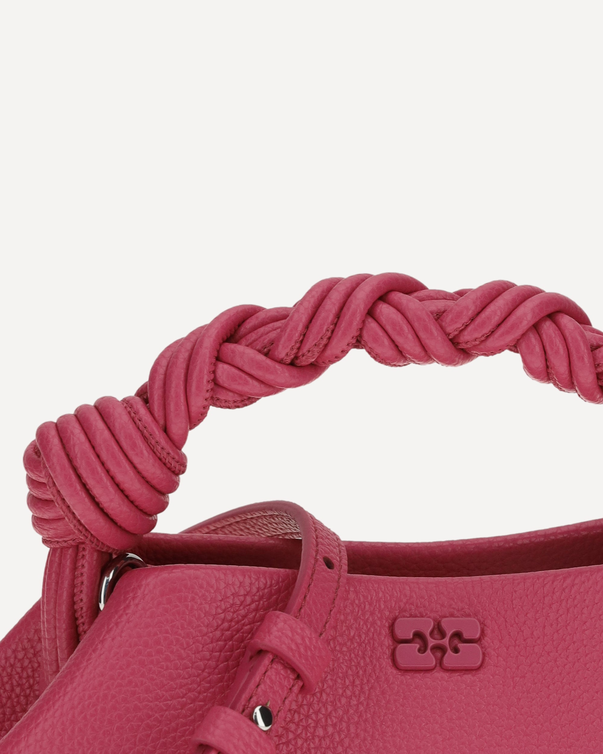 The Bou mini Handbag by Ganni, with its grainy texture, combines elegance and distinctive details in a compact design. Embellished with the tone-on-tone Ganni Butterfly logo and embossed logo on the back, it features a braided top handle with knot, adjustable and removable shoulder strap, and metal nuts engraved with the Ganni and Butterfly logos. The internal magnetic closure, single compartment, and flat card pocket complete the bag, making it practical and refined.