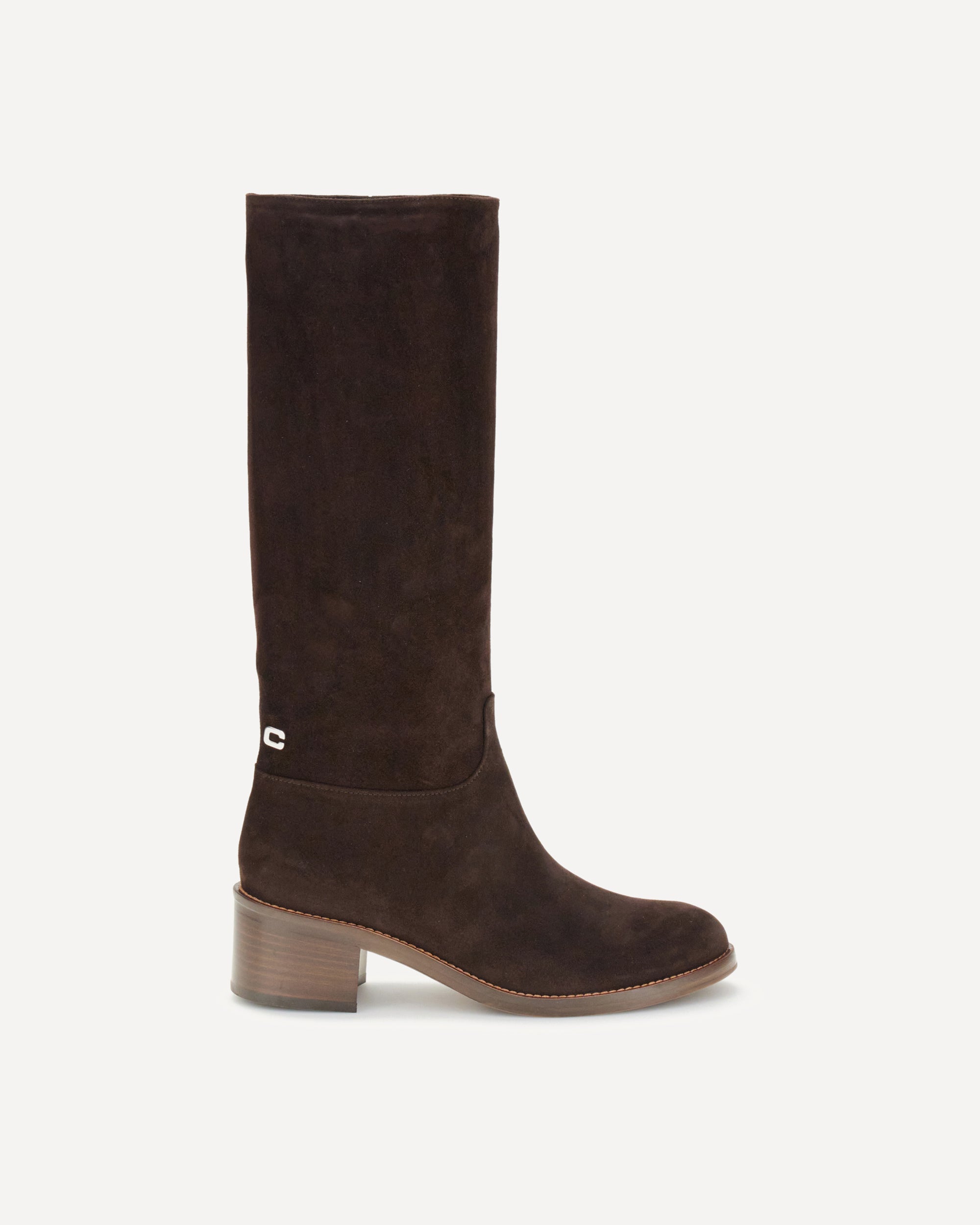 Carel Paris Brighton suede Boots elegantly reinterpret equestrian style with a contemporary twist. Featuring a minimalist and refined tube silhouette, they feature a round toe and a 5 cm heel that adds a touch of elegance without sacrificing comfort. The knee-high design and zip fastening make them practical and versatile, while the iconic C applique on the side adds a distinctive touch.