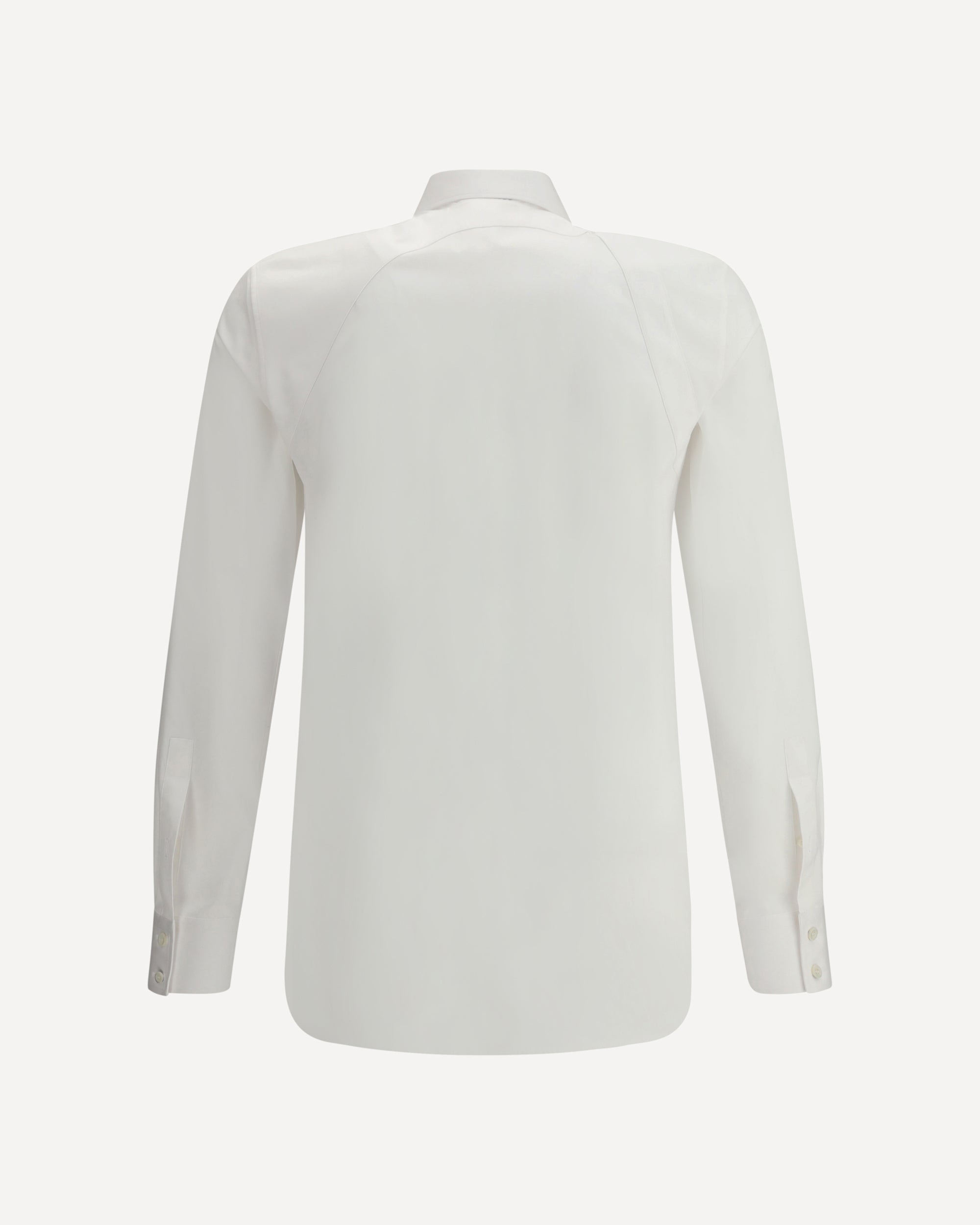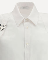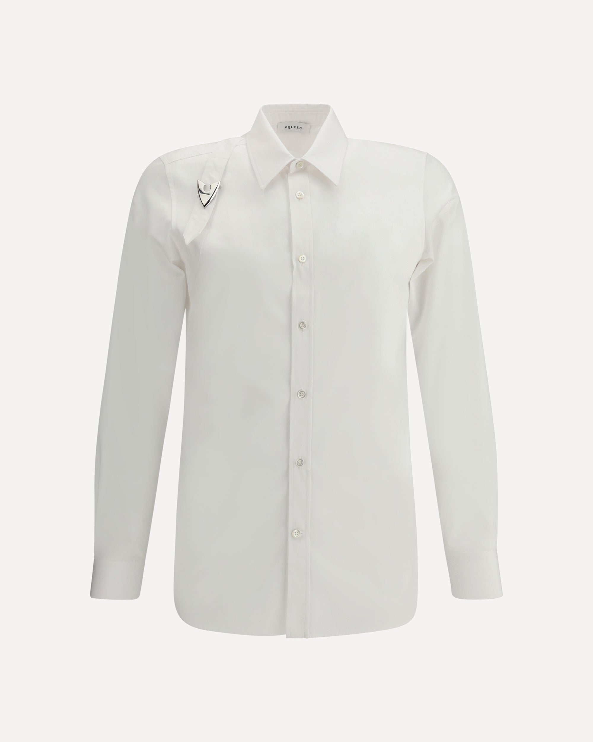 Alexander McQueen's Buckle Shirt is a distinctive and bold piece of clothing, featuring a classic collar and logoed strap detail on the front, accentuating its modern and iconic design. The front button closure and adjustable button cuffs add functionality without sacrificing style. A garment that combines elegance and a touch of originality, typical of the brand.