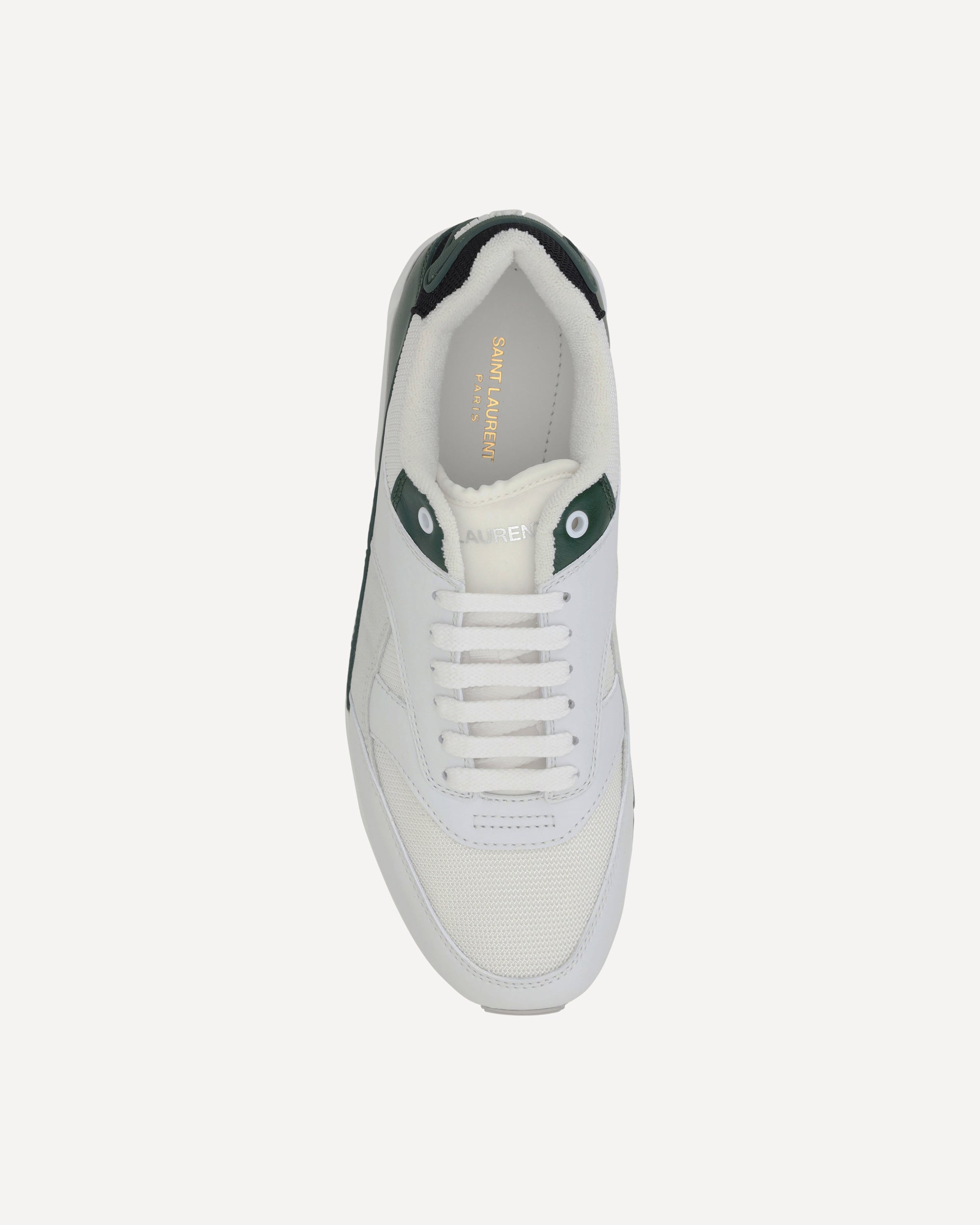 Saint Laurent's Bump 15 Sneakers feature a round toe that ensures comfort and a classic look. The leather and fabric paneled design creates a dynamic and modern effect, while the front lace-up closure ensures a secure and adjustable fit. The iconic, contrasting Saint Laurent monogram is placed on the heel, adding a distinctive and recognizable touch. The textured sole, reinforced at the toe, offers added stability and durability, while the logoed insole completes the design, enhancing the brand's high quality. A perfect blend of elegance and functionality.