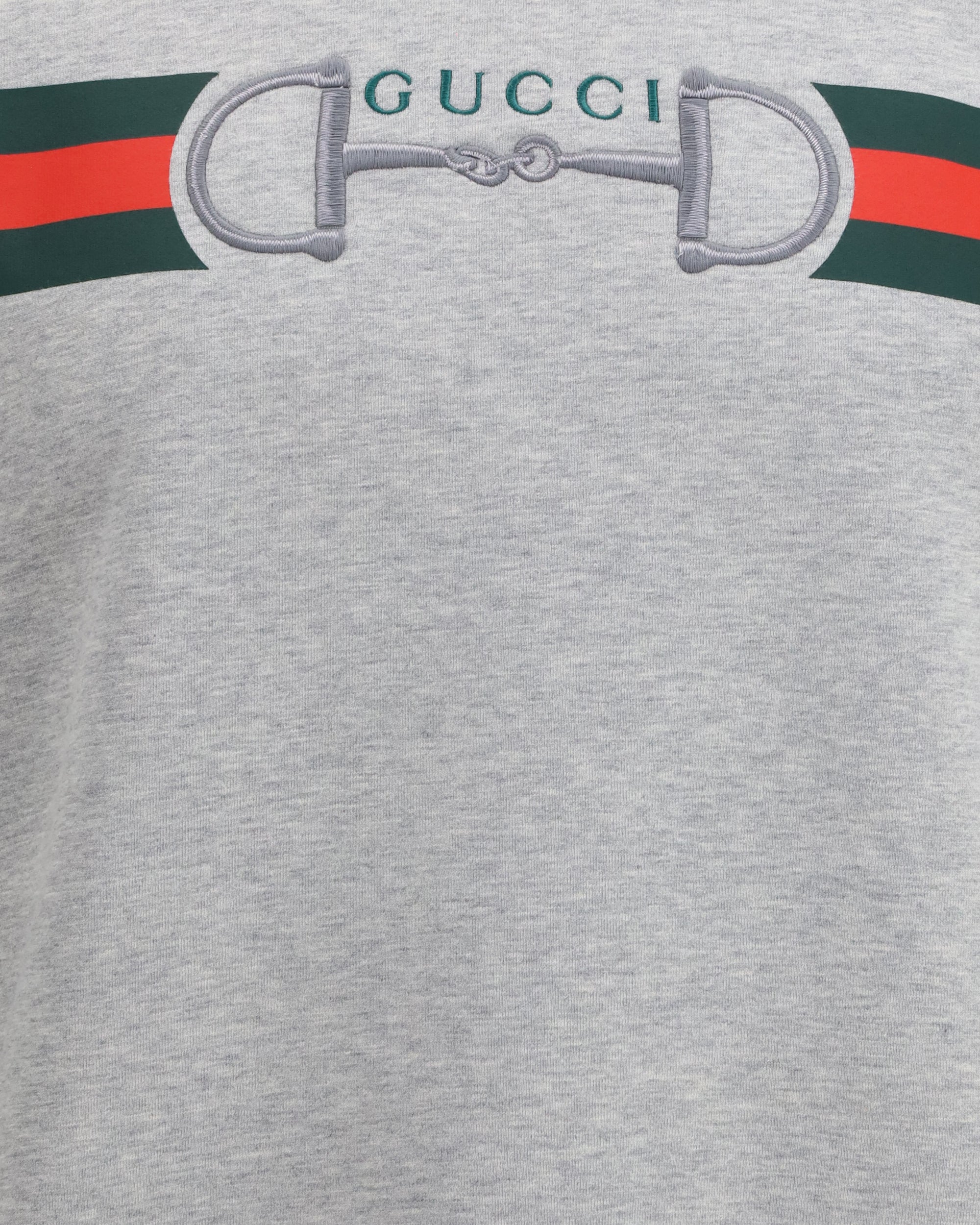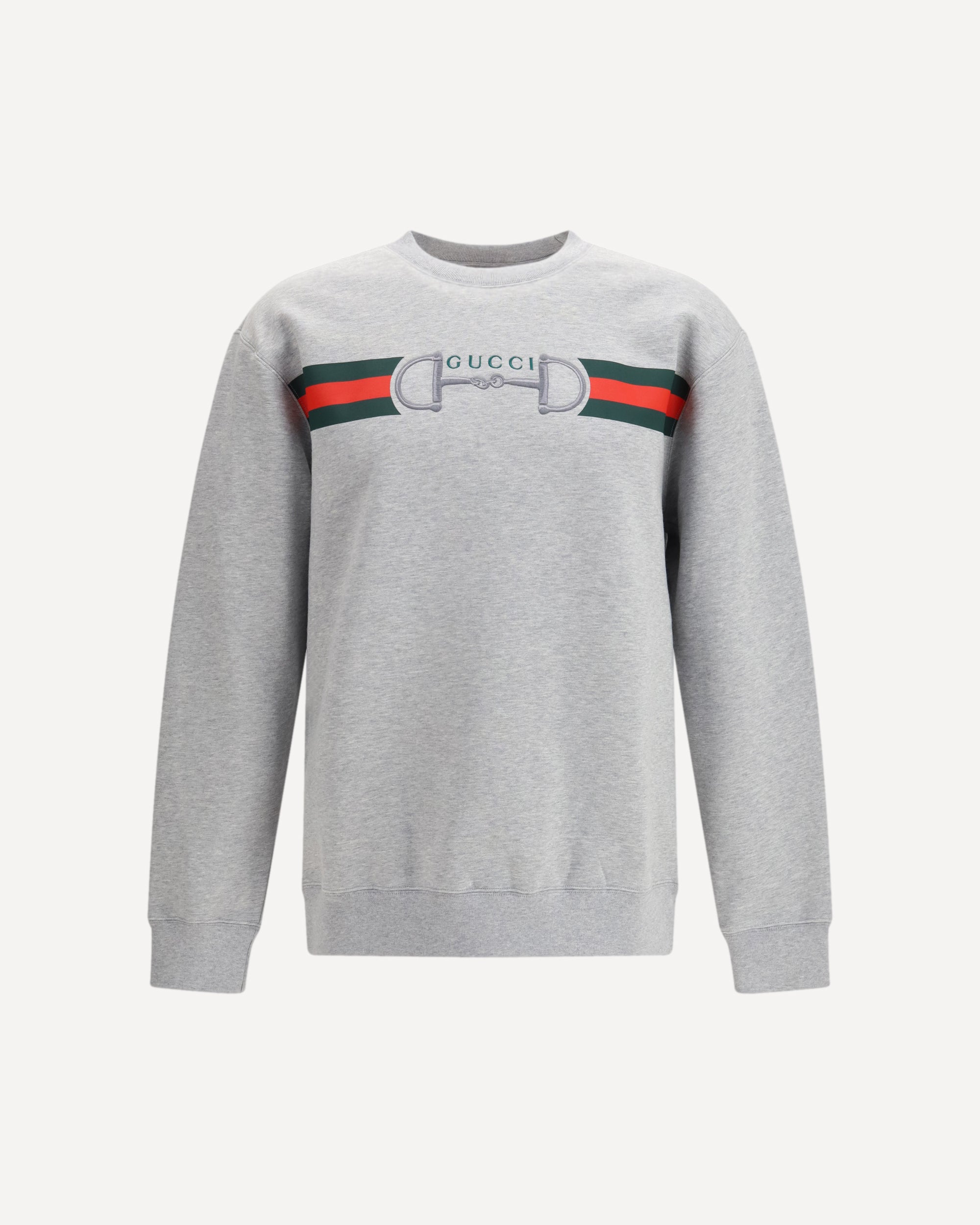 The cotton jersey Sweatshirt by Gucci blends everyday comfort with the Maison’s iconic codes in a contemporary interpretation. Crafted from brushed cotton jersey in grey mélange, it features a Web print paired with a Gucci Horsebit embroidery, creating a distinctive balance between graphic elements and refined detail. The crew neck, long sleeves and ribbed collar, cuffs and hem define a clean construction, finished with a regular fit signed by Gucci.