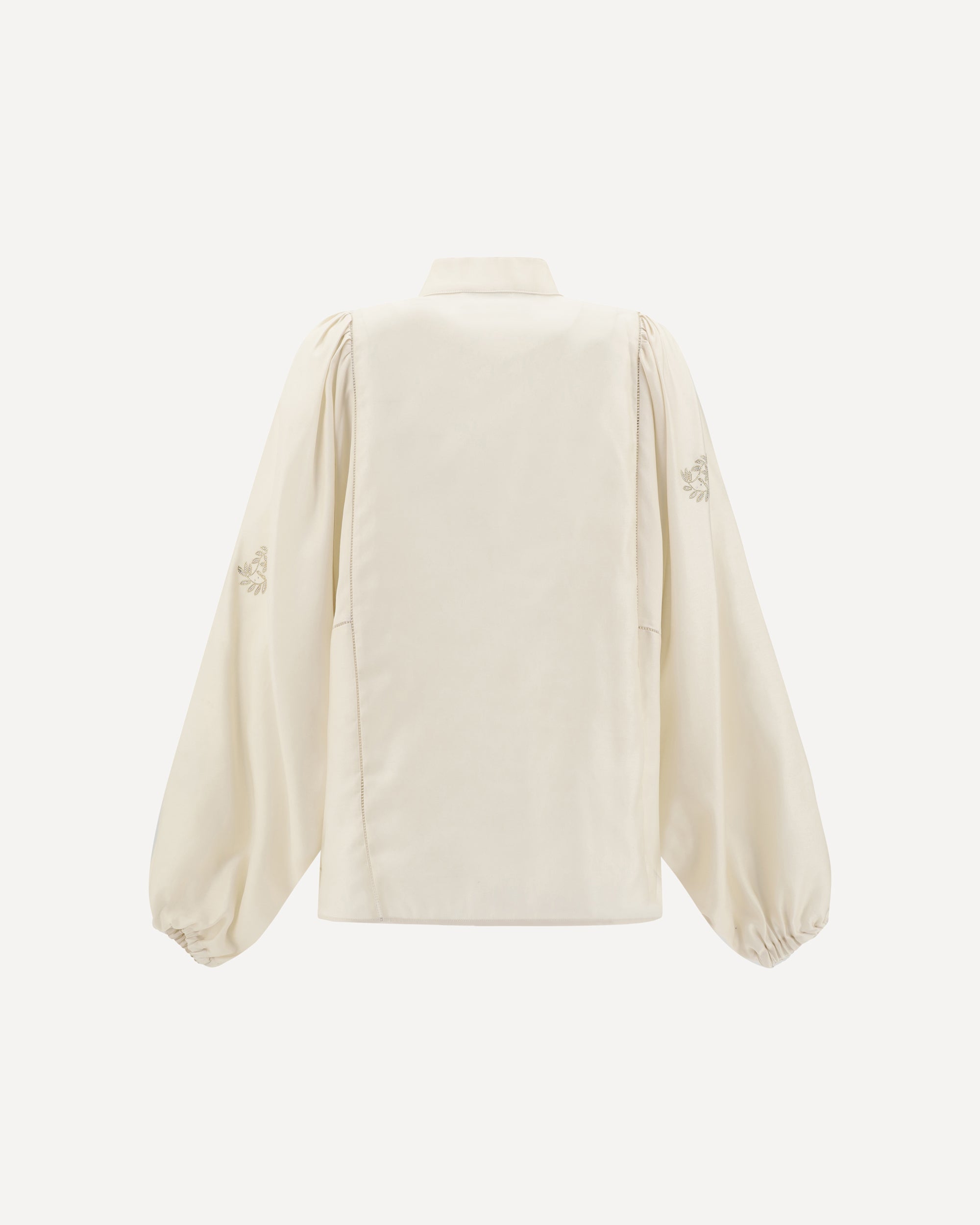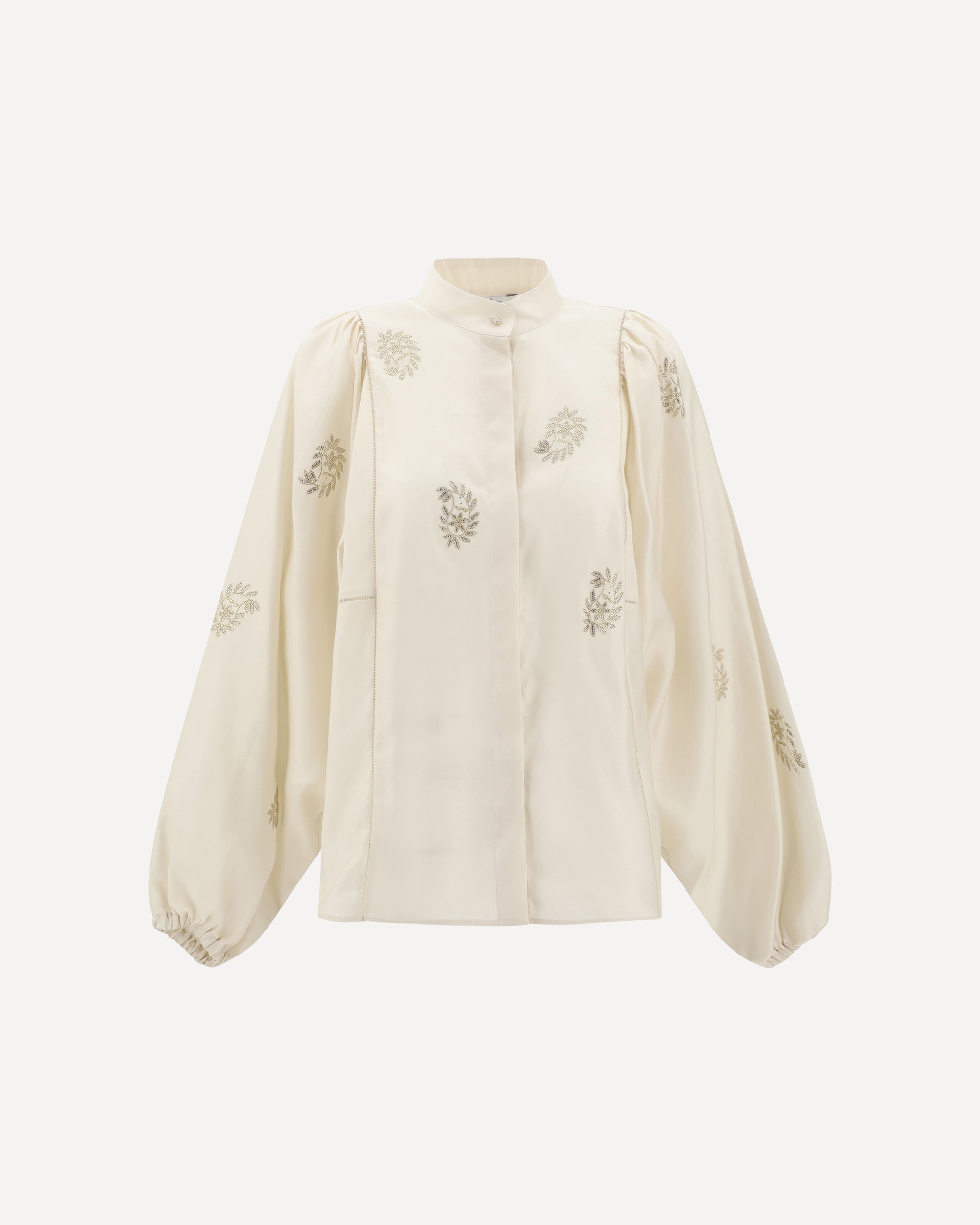 Max Mara's Caladio Shirt is a refined and feminine piece, featuring a front closure with concealed buttons that enhances its elegant simplicity. The mandarin collar and puff sleeves add a touch of originality, while the elasticized cuffs ensure comfort and a perfect fit. The floral pattern, embellished with applied rhinestones, gives brightness and a sophisticated effect.