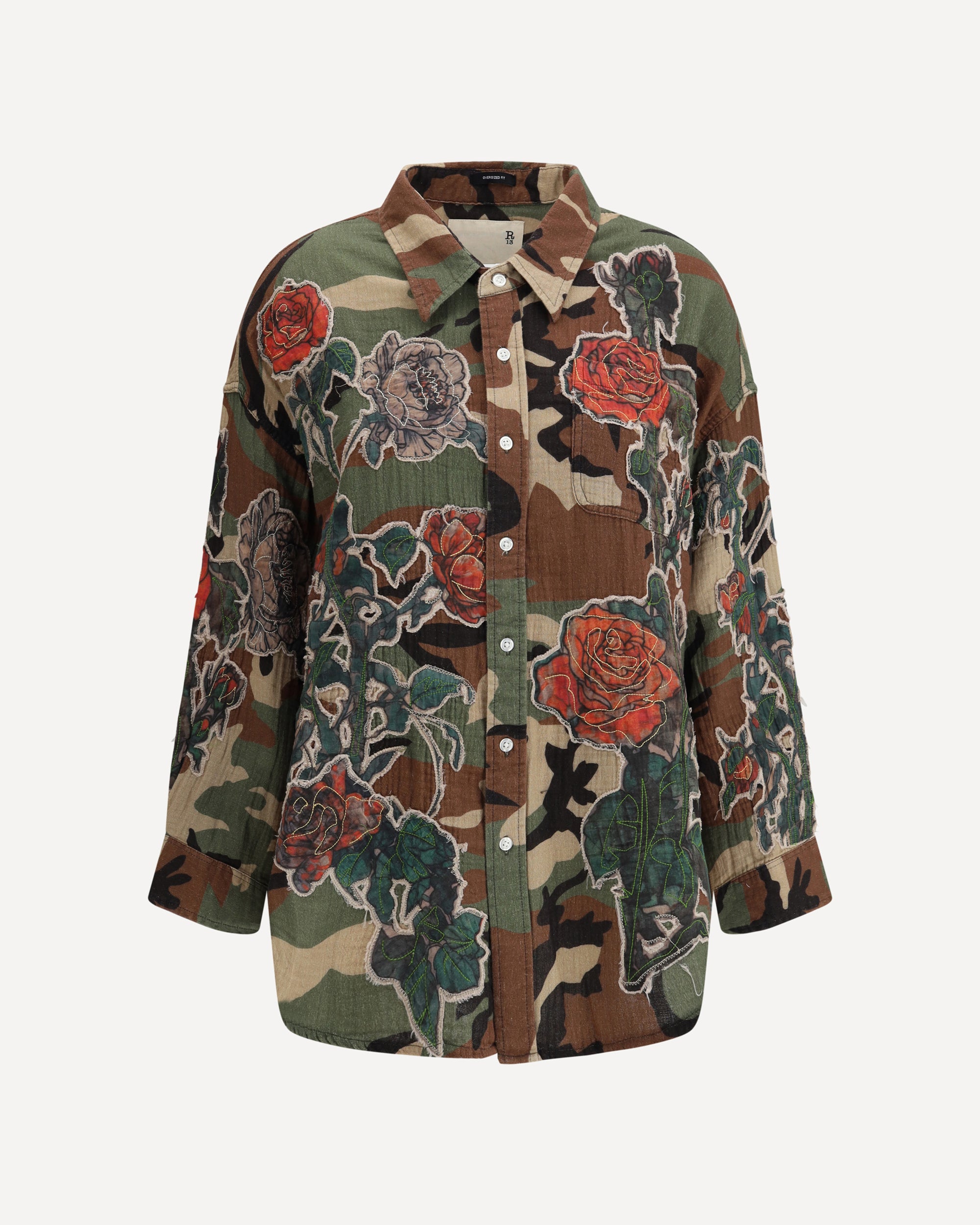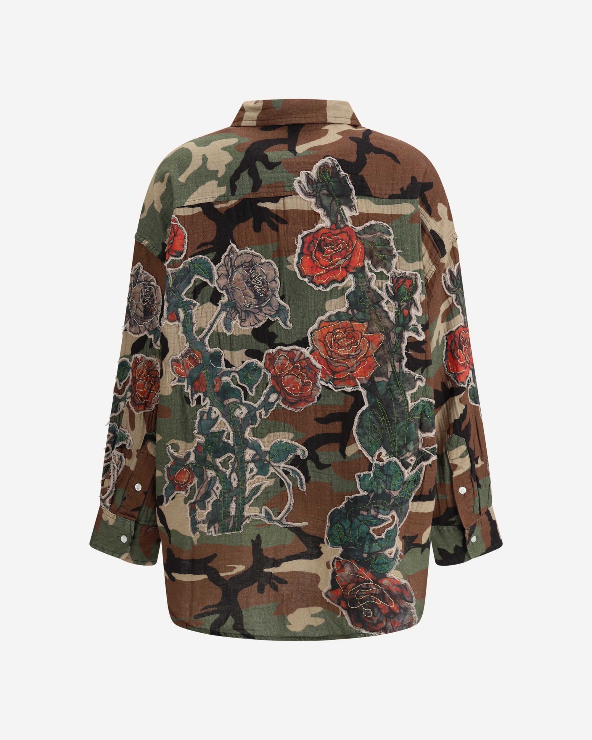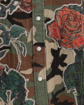 The R13 Camouflage Shirt is a bold and characterful piece that combines the energy of camouflage with a touch of sophisticated femininity. The front button closure and asymmetric hem give the shirt a modern and dynamic cut, while the patch pocket on the front adds a functional and stylish detail. The camouflage pattern, already bold and original in itself, is enriched by embroidered roses on the front, creating an interesting contrast between the masculine motif and the delicate floral touch.