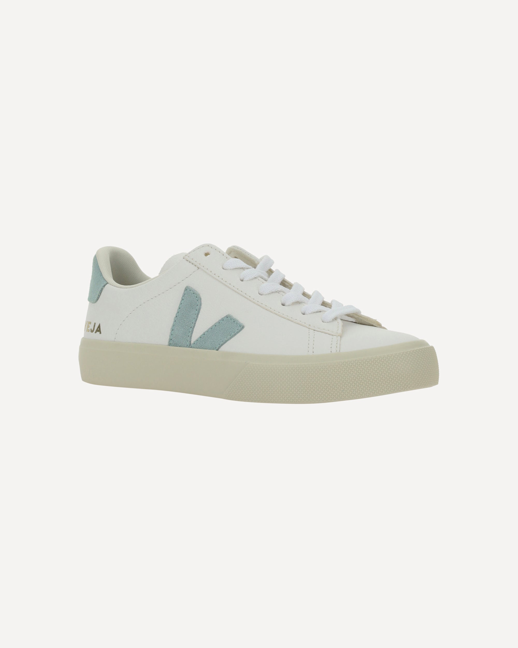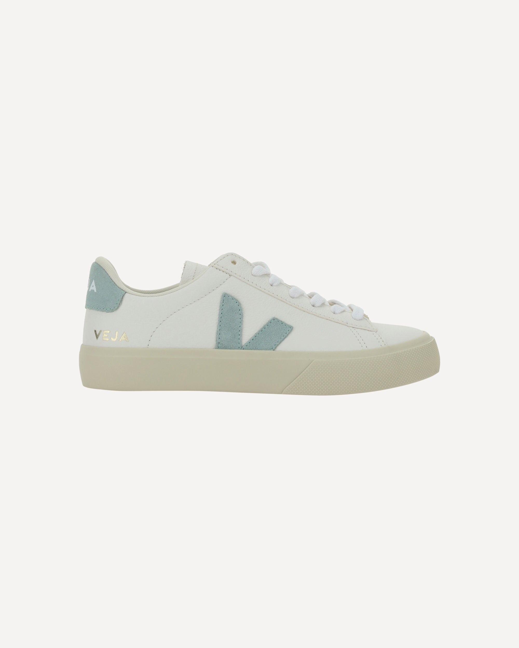 Calfskin Campo Chrome Sneakers by Veja, round toe, contrasting panel detailing, contrasting iconic brand logo appliqué on side panels, lace-up front fastening, embossed logo tab, logo appliqué on tongue, contrasting heel reinforcement.