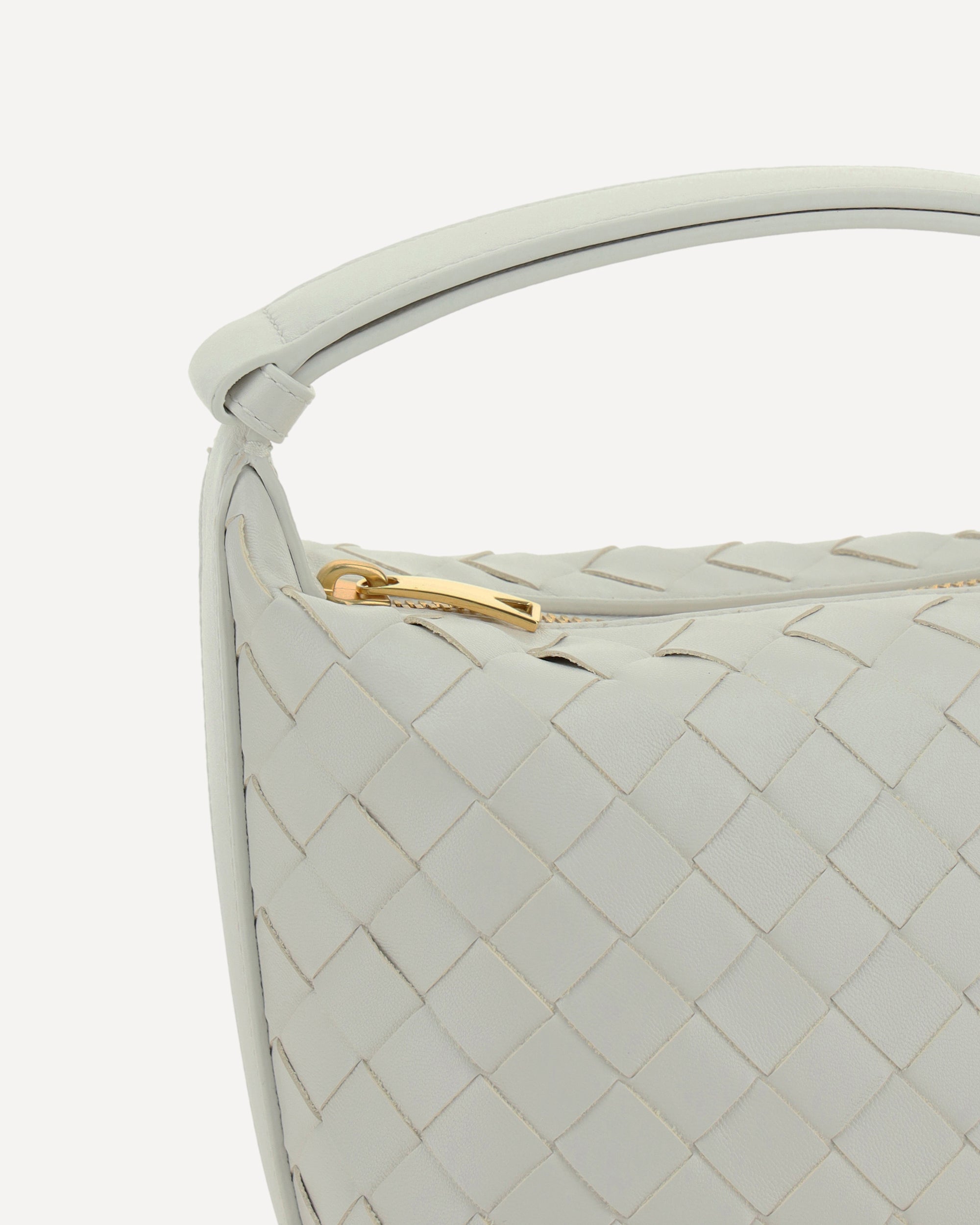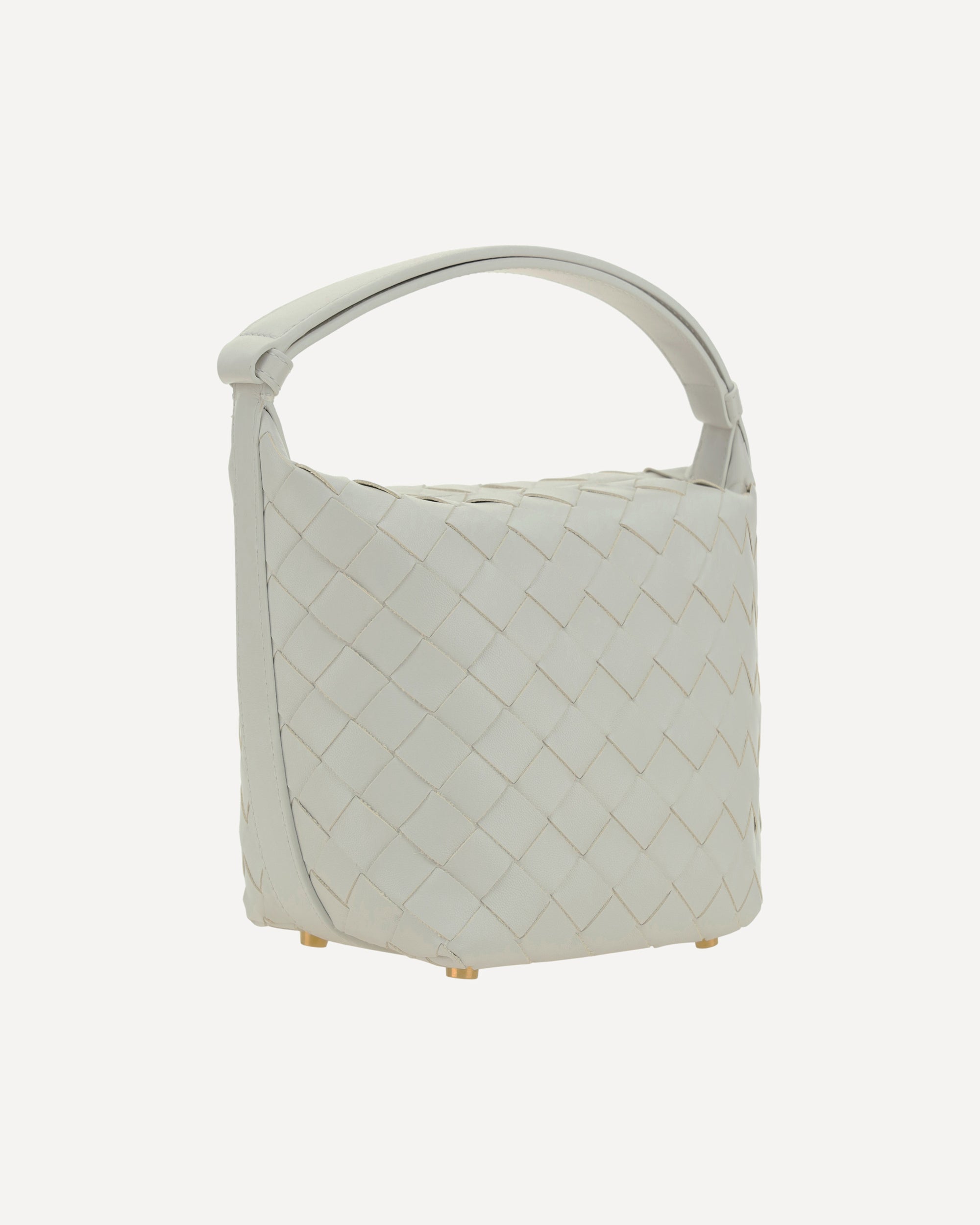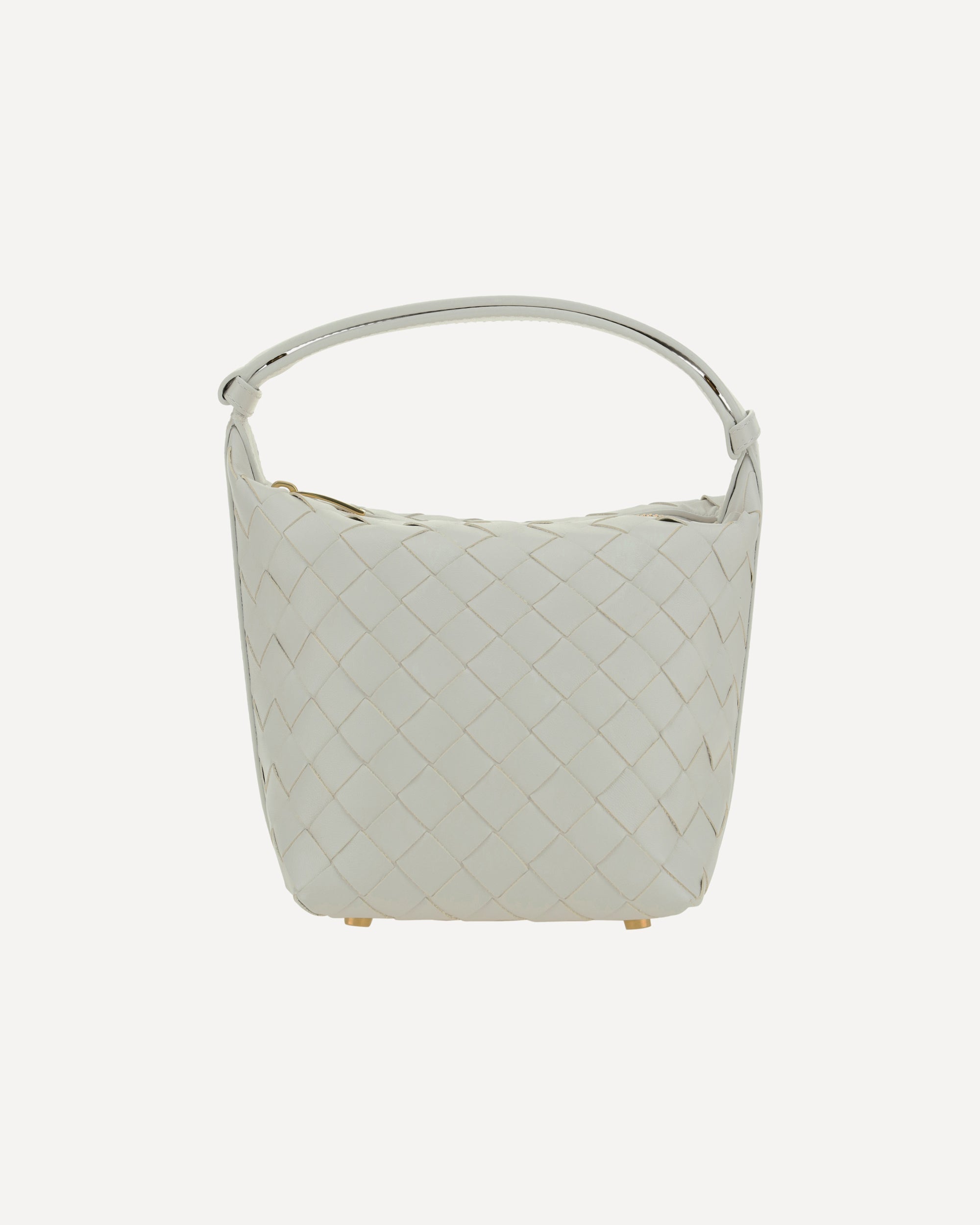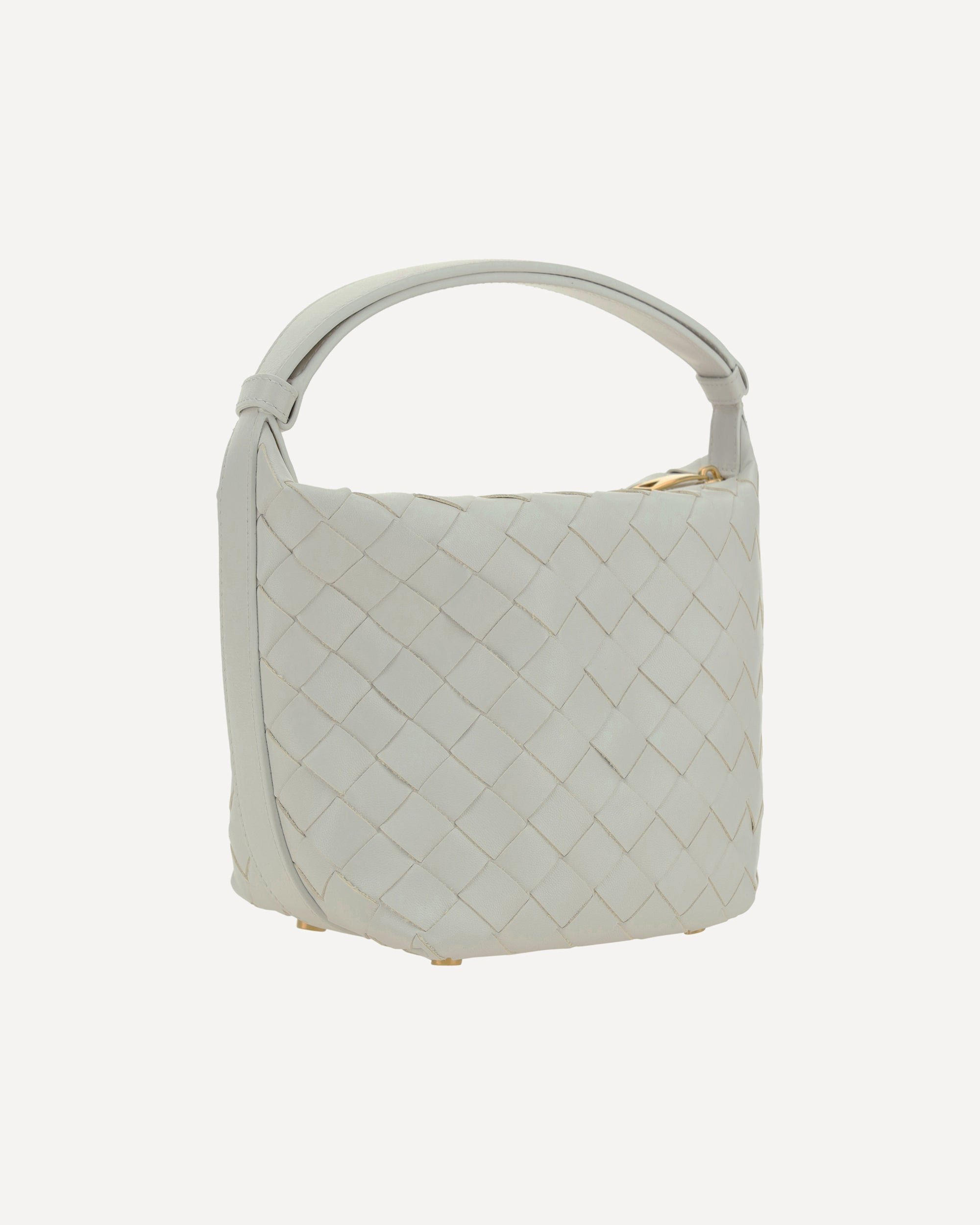 Candy Wallace Handbag by Bottega Veneta is made of leather with the iconic Intrecciato design applied across the surface, a true symbol of elegance. It has an adjustable single handle via a sliding mechanism, allowing you to adjust it to your needs. The top closure is zippered, while metal feet at the base offer added stability and protection. A sophisticated and functional accessory, perfect for any occasion.