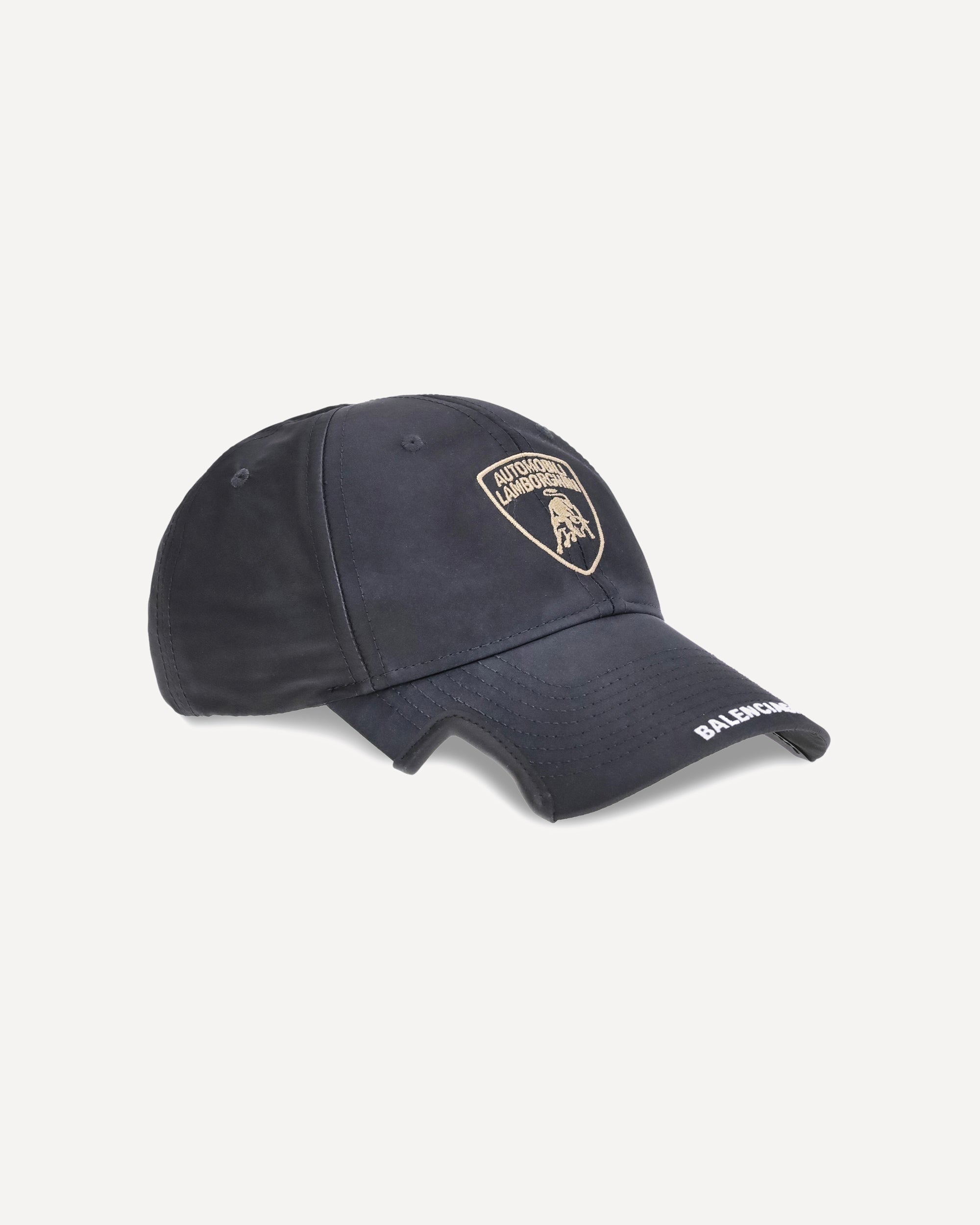 The Lamborghini x Balenciaga Baseball Cap is a bold accessory born from the collaboration between two icons of luxury and design. Featuring embroidered ventilation eyelets on the top, it has a distinctive cut-out visor on both sides and an adjustable tongue with hook-and-loop closure on the back. The Lamborghini Shield motif embroidered on the front completes the look, designed by Balenciaga for Automobili Lamborghini, a symbol of a sporty and exclusive style.