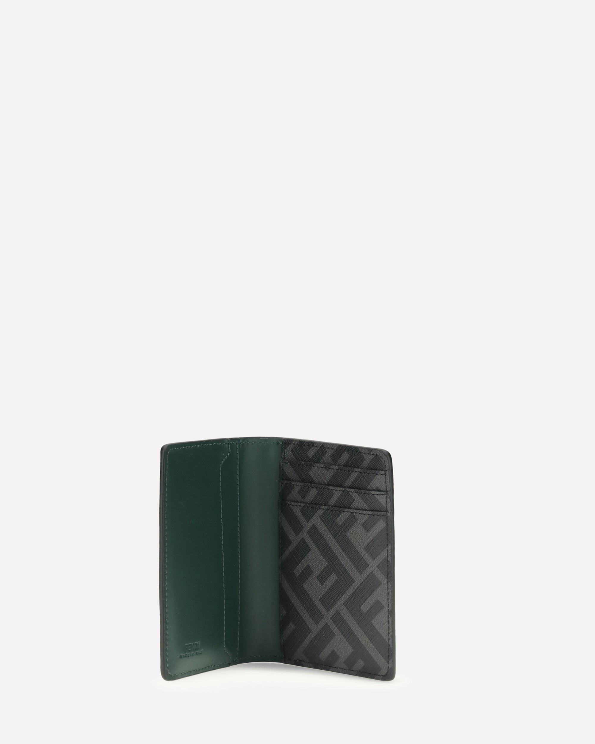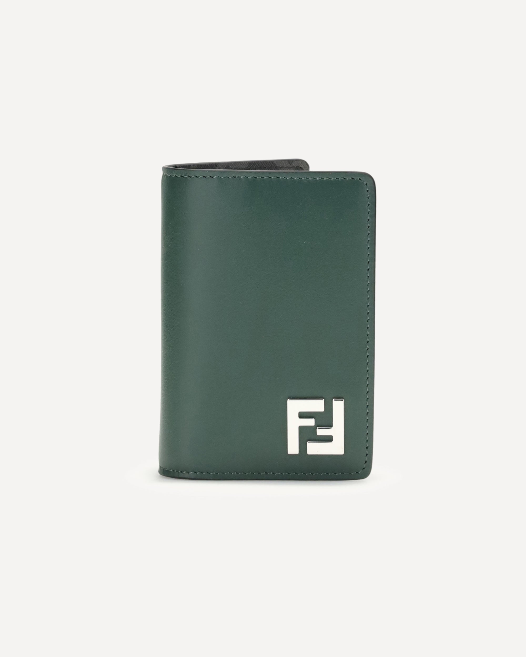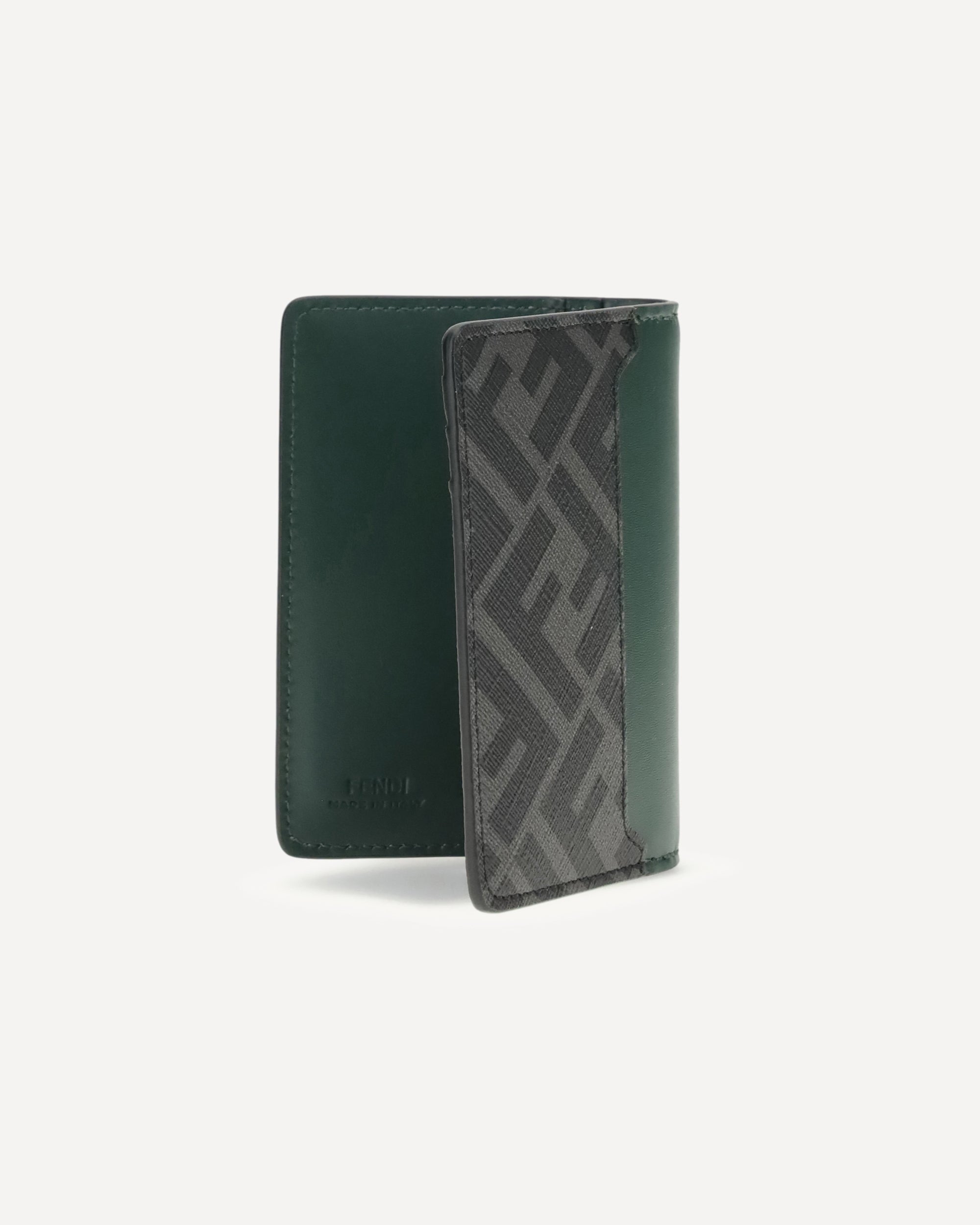 Leather Card Holder by Fendi is a compact and refined accessory, offered in a billfold model. The front features a three-dimensional plaque with the iconic FF logo, the distinctive symbol of the maison. The interior is organized with card slots, while the back panel is embellished with a jacquard fabric detail featuring the repeated FF logo for an instantly recognizable touch of style.