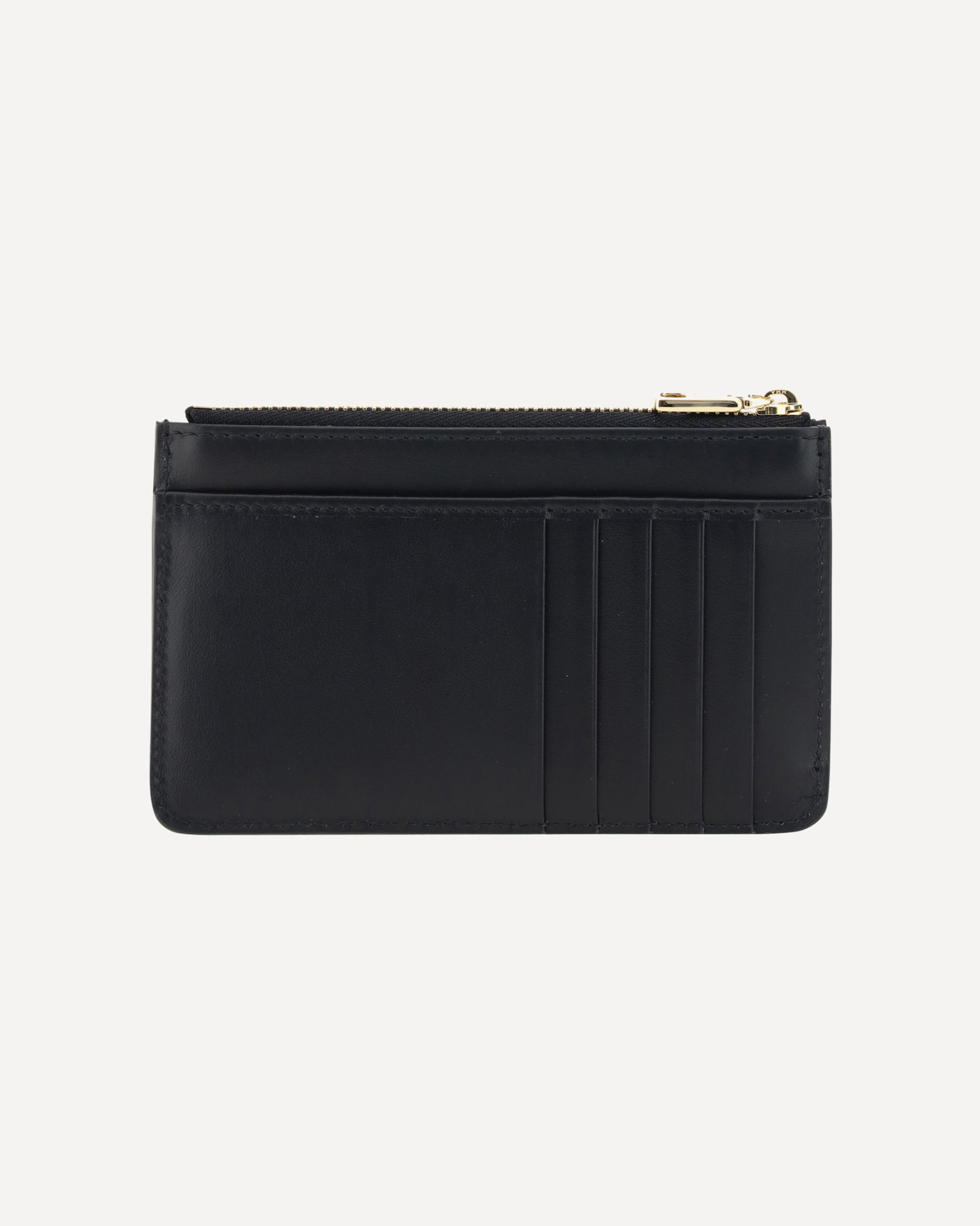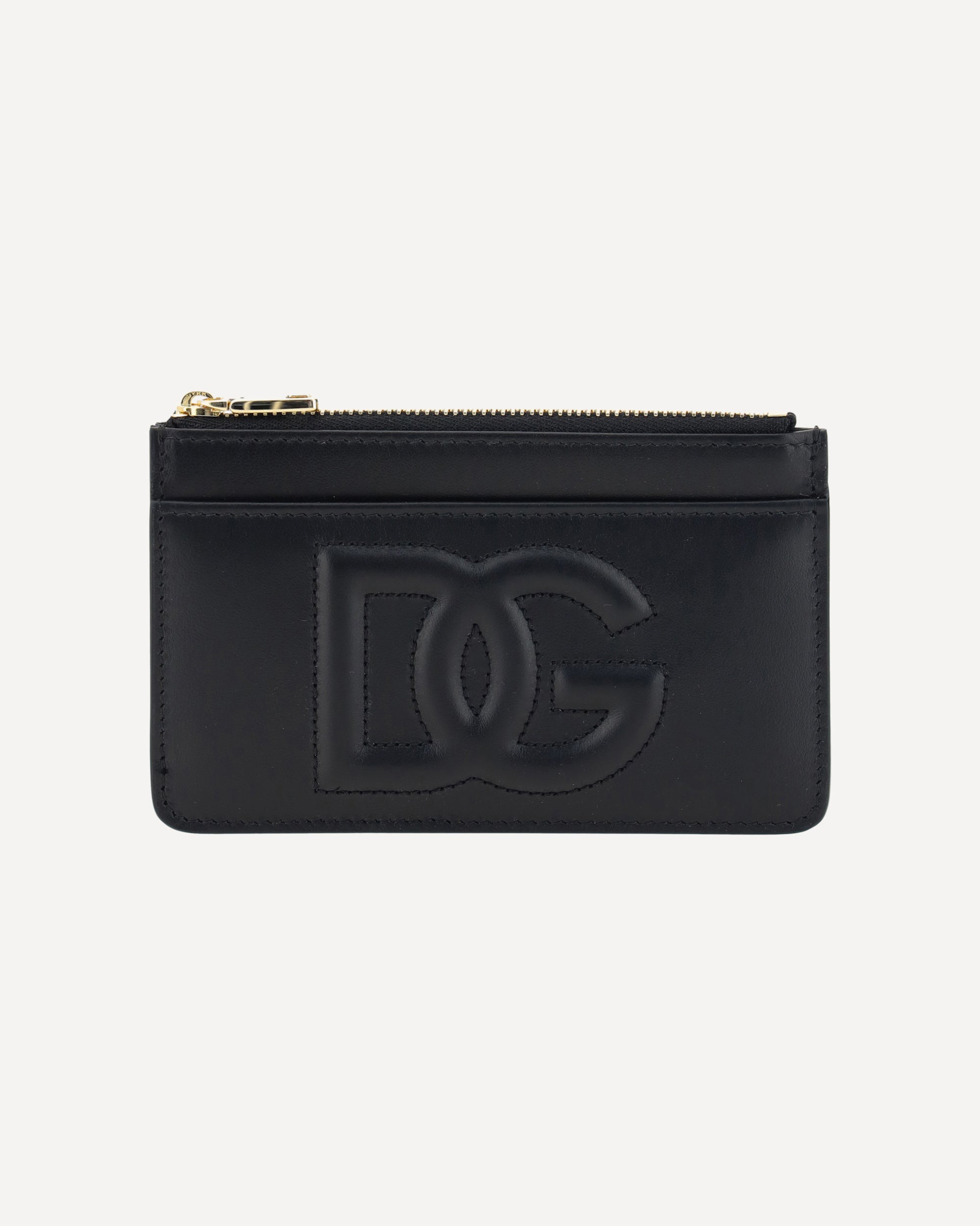 Calfskin Card Case by Dolce&Gabbana, top zipper closure, card slot on back, iconic embossed D&G logo on front, smooth leather design.