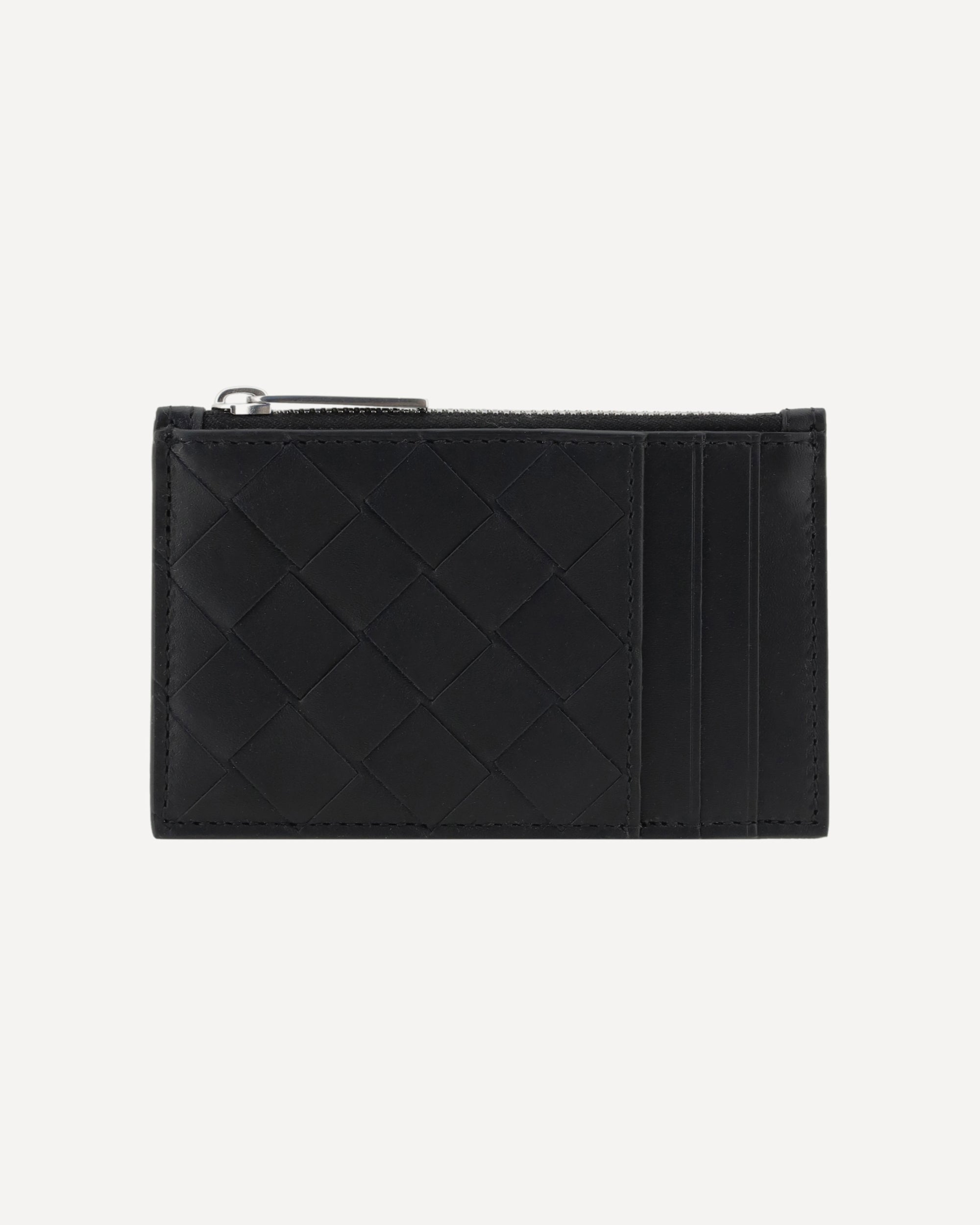 Leather Card Holder by Bottega Veneta, card slots on front and back, iconic all-over braided design, coin compartment at top.