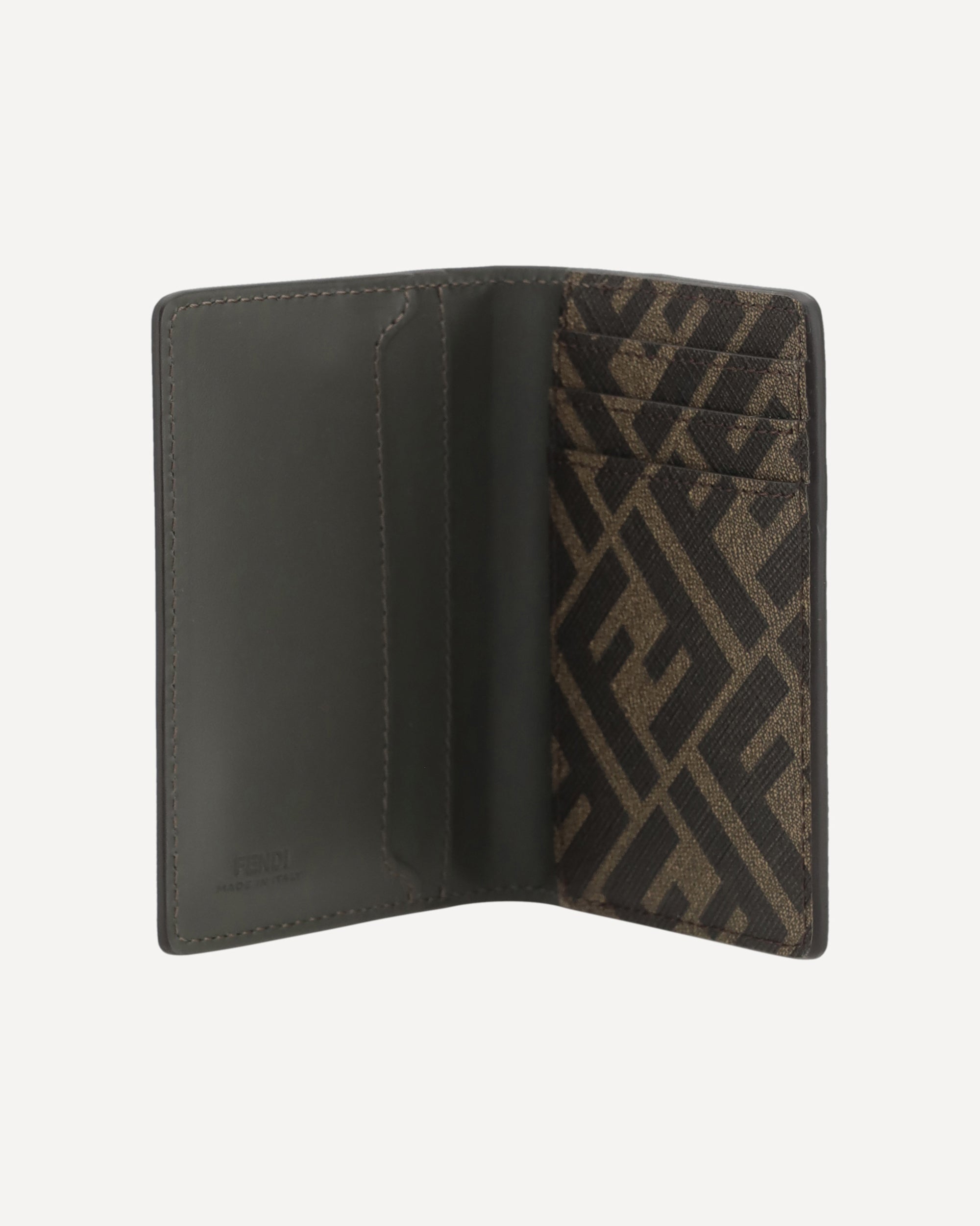 Leather Card Holder by Fendi is a compact and refined accessory, offered in a billfold model. The front features a three-dimensional plaque with the iconic FF logo, the distinctive symbol of the maison. The interior is organized with card slots, while the back panel is embellished with a jacquard fabric detail featuring the repeated FF logo for an instantly recognizable touch of style.