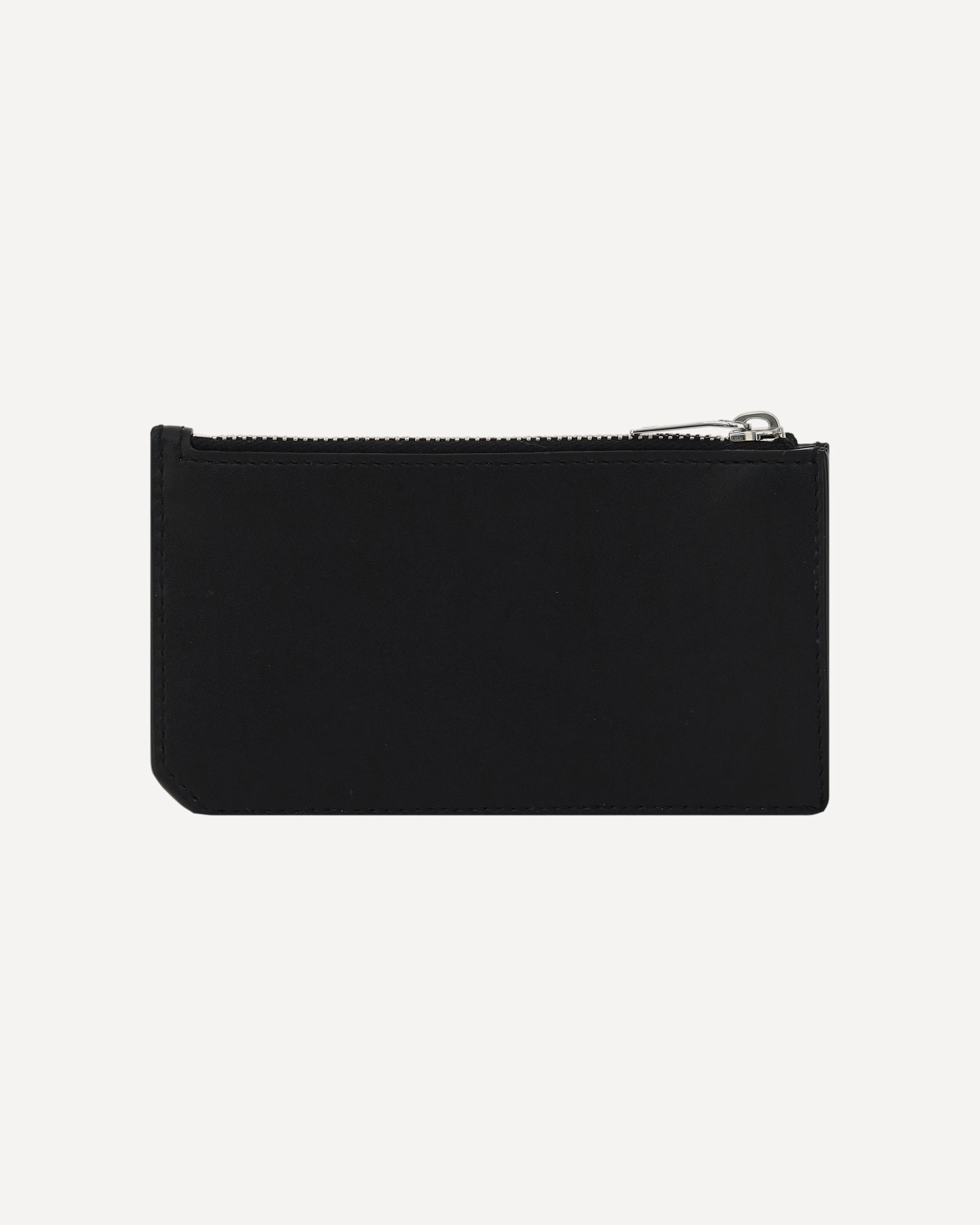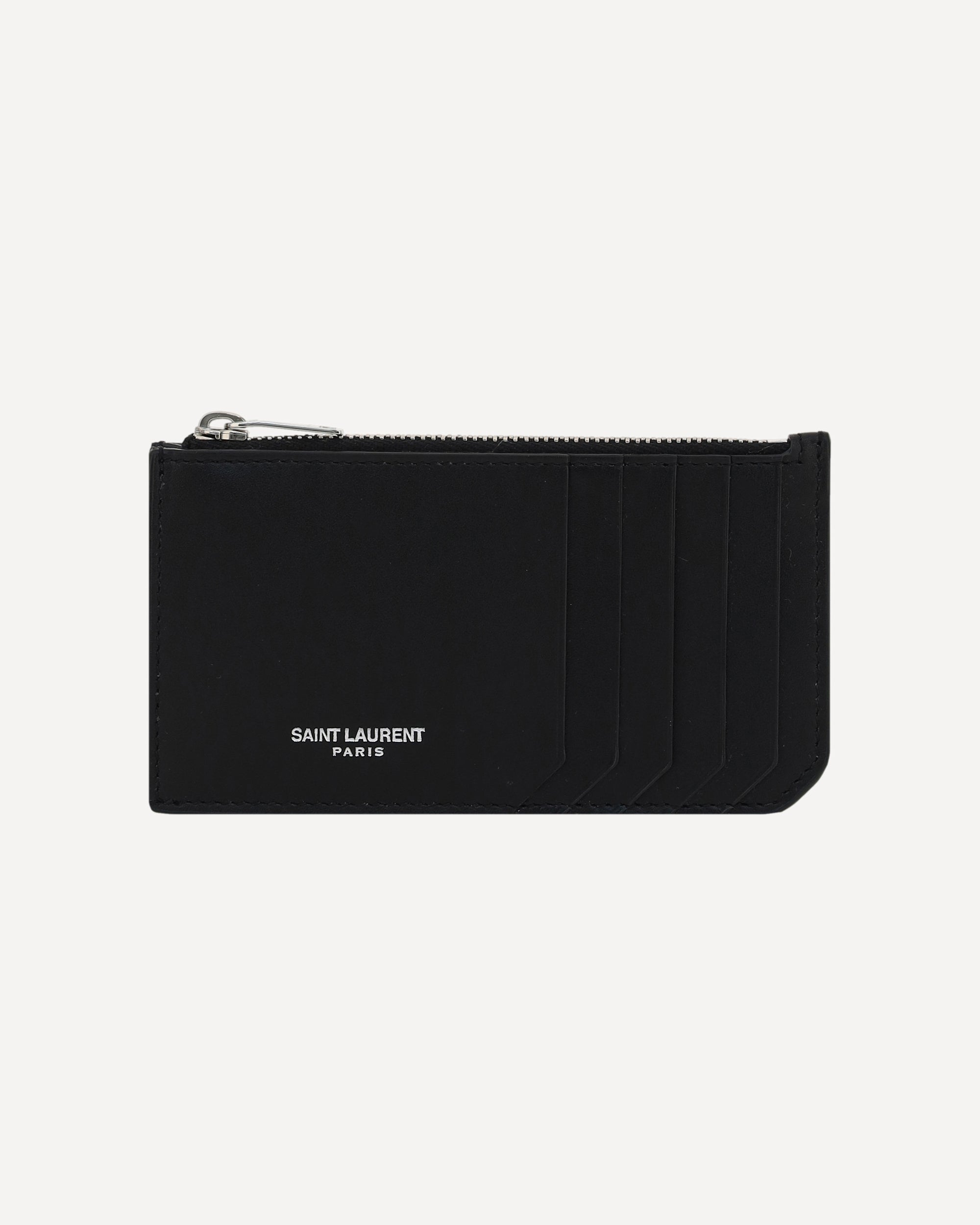 Calfskin Card Holder by Saint Laurent, card slots on front, zippered pocket at top, contrasting logo on front.