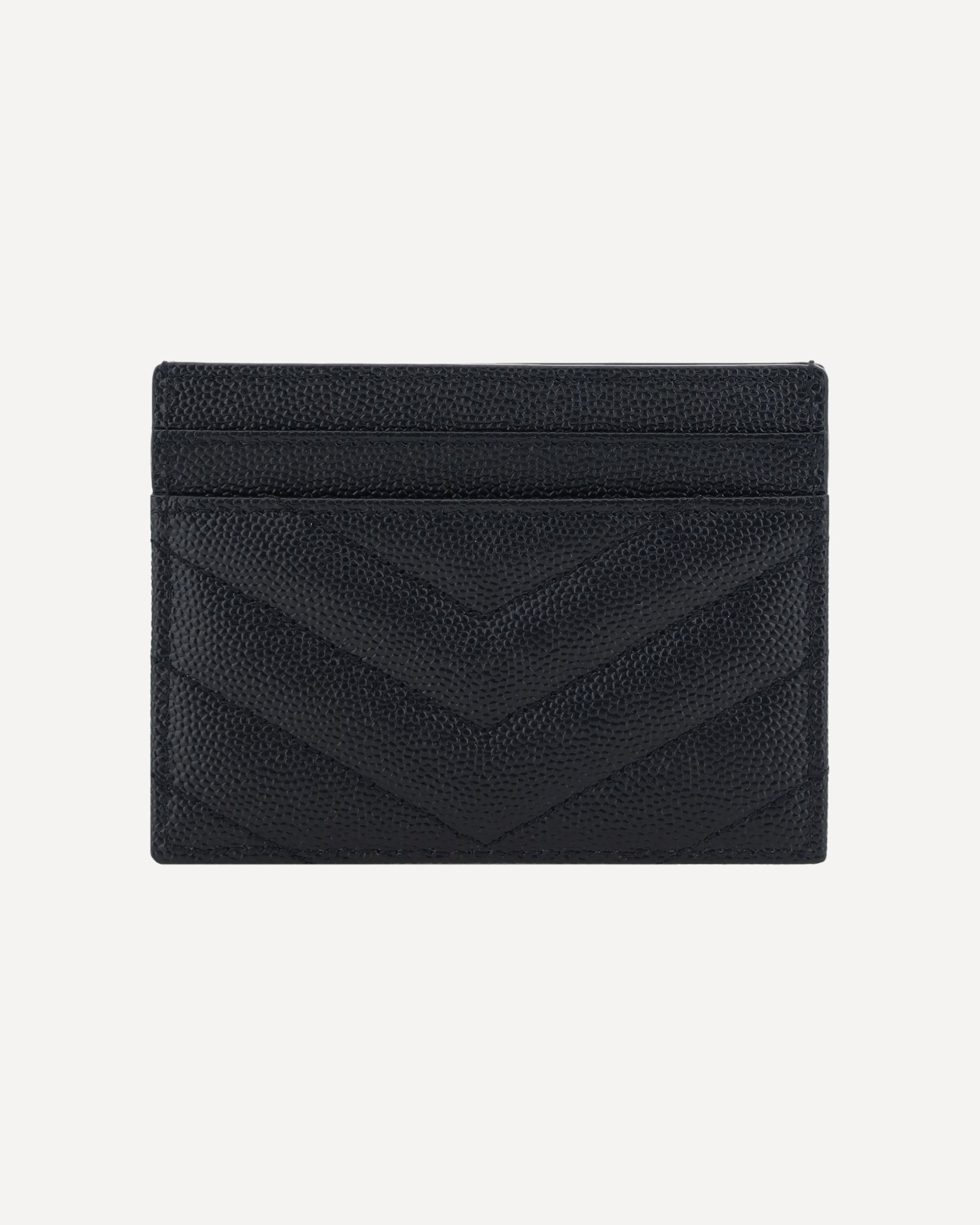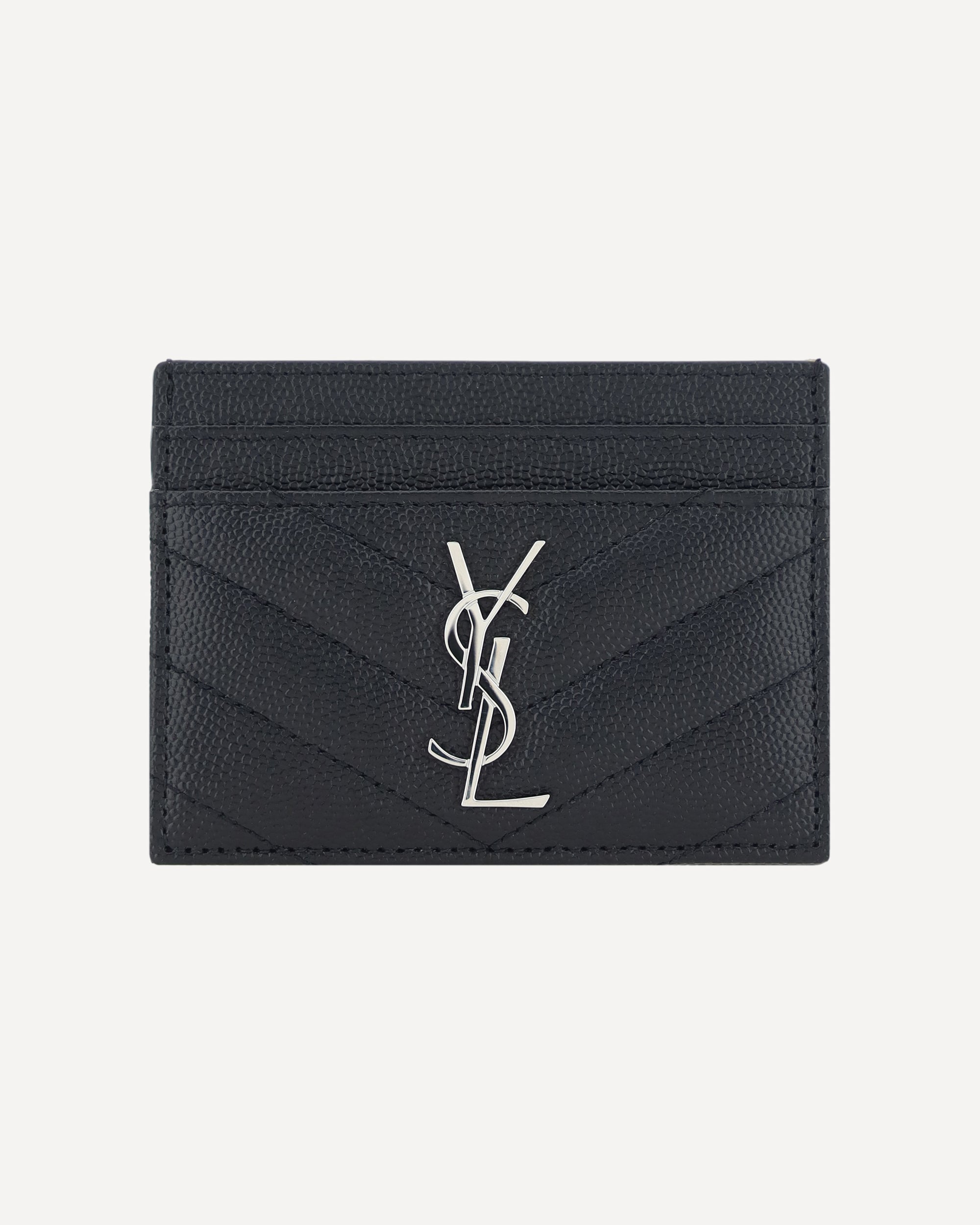 Calfskin Card Holder by Saint Laurent, iconic metal logo plaque applied on front, card slots on front and back, quilted design, bill compartment on top.