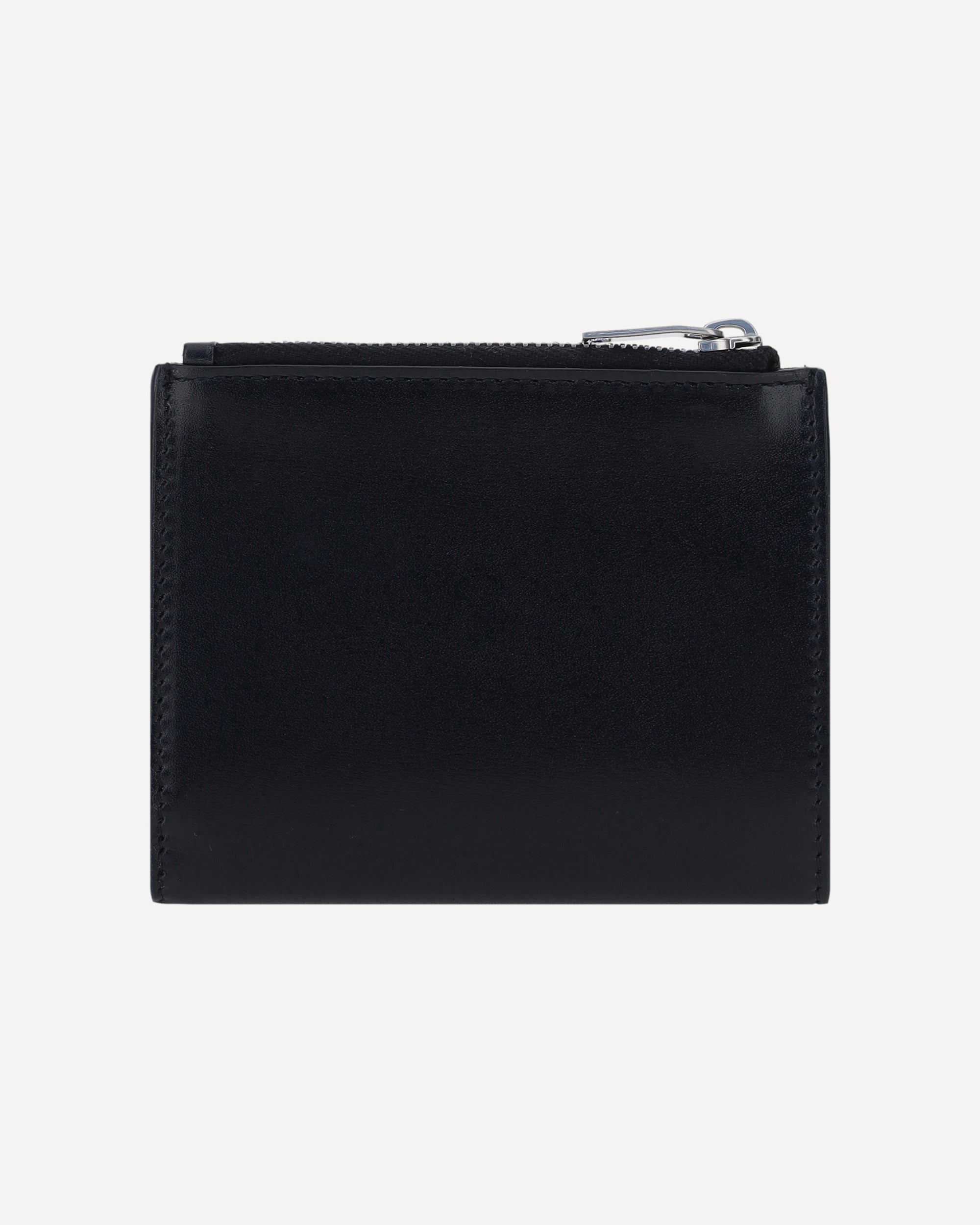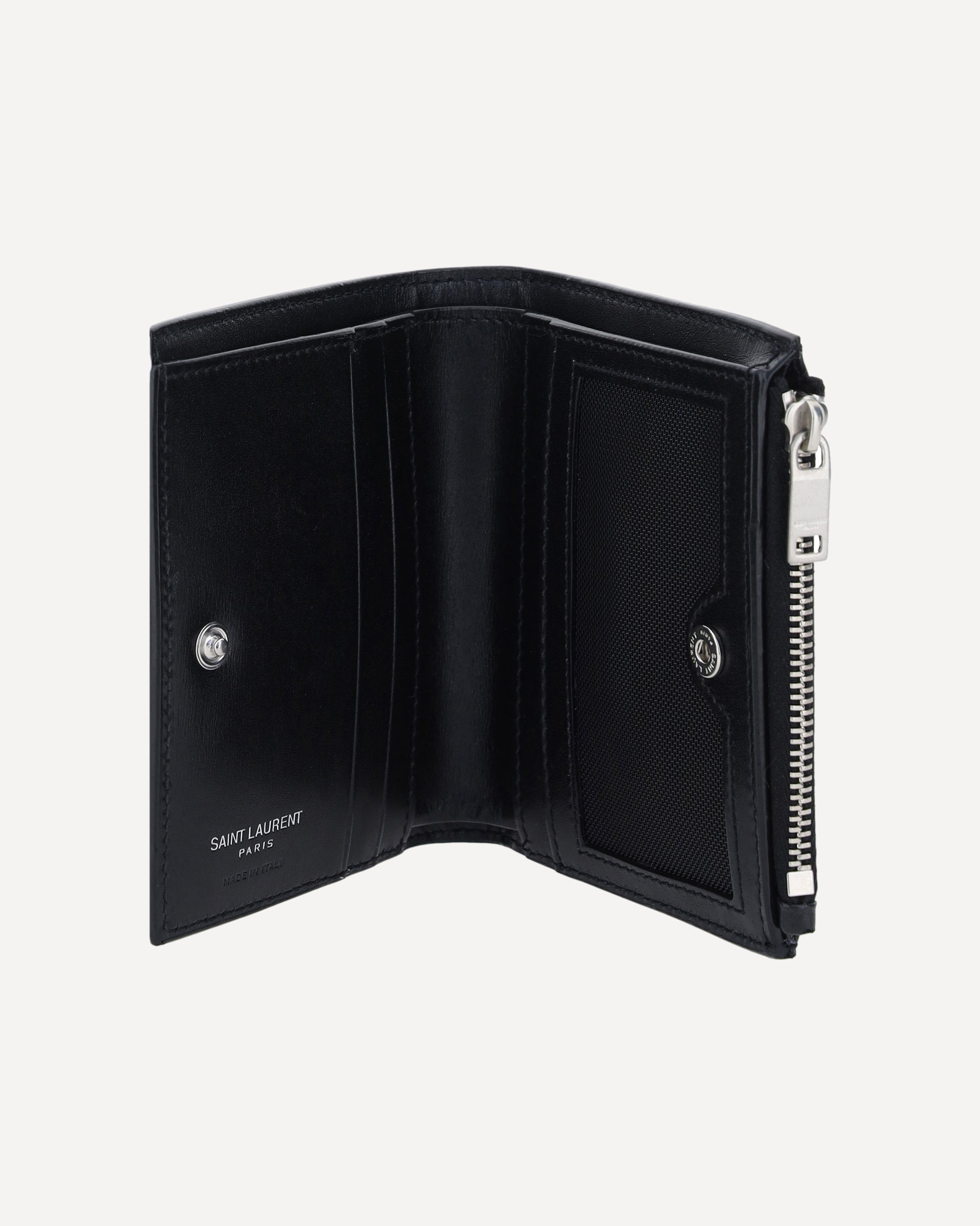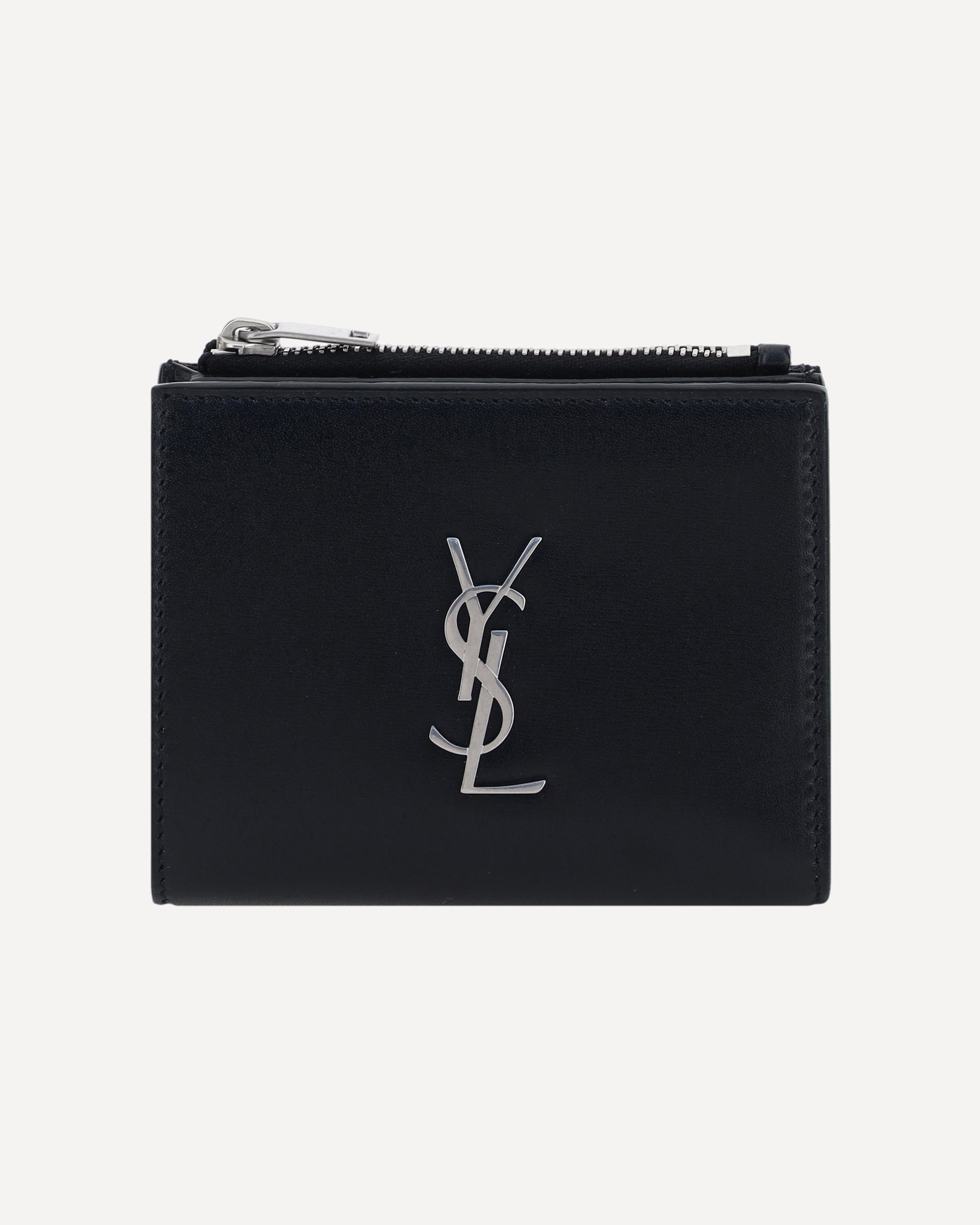 Calfskin Card Holder by Saint Laurent, card slots inside, embossed iconic brand logo plaque on front, coin compartment with top zipper closure, billfold design with snap button.