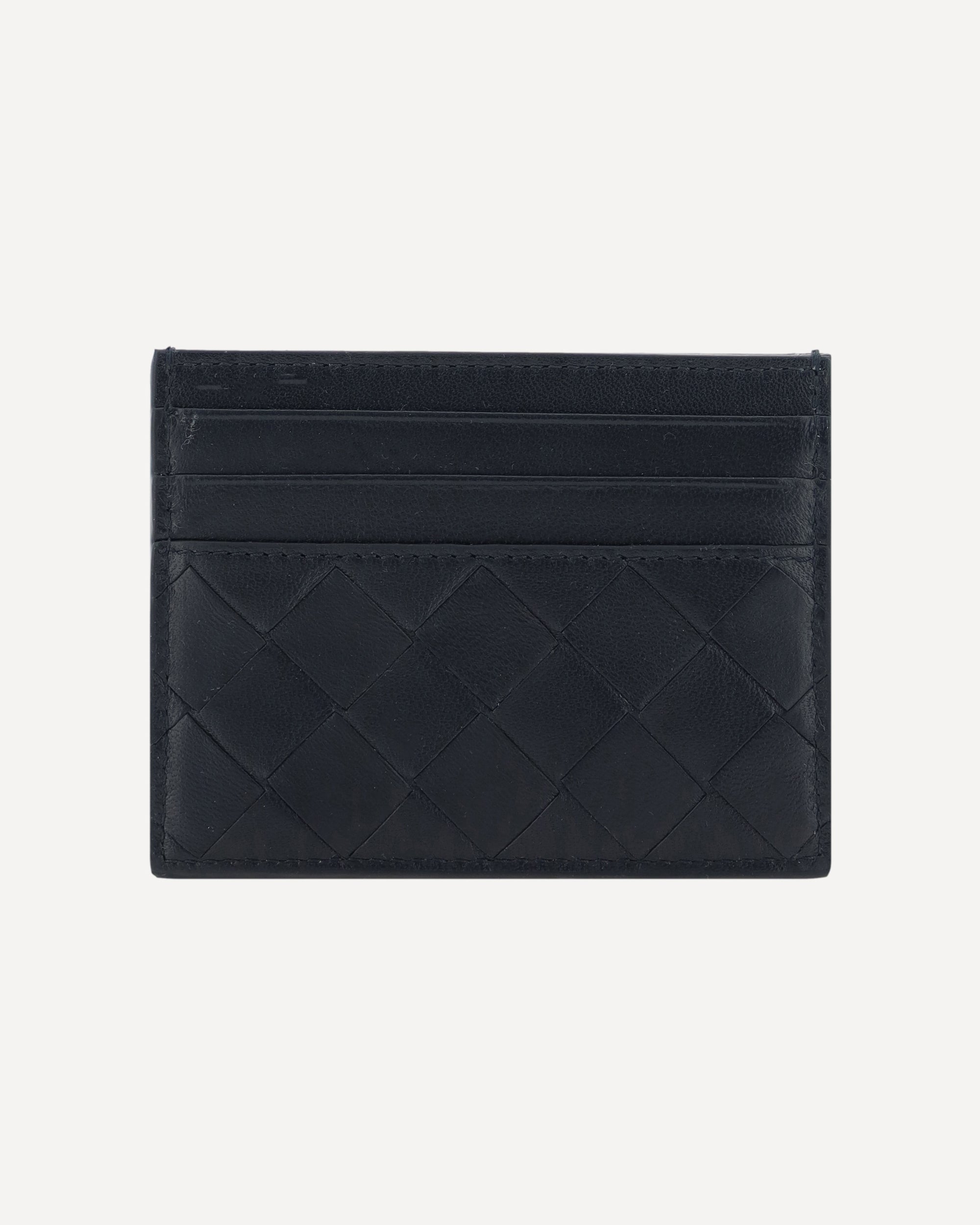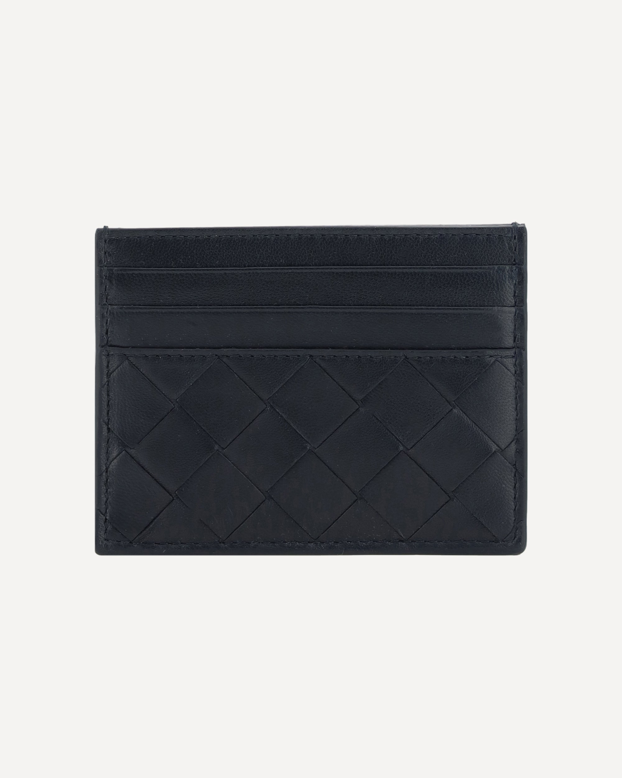 Lambskin Card Holder by Bottega Veneta, card slots on front and back, iconic all-over brand woven design, tone-on-tone stitching.