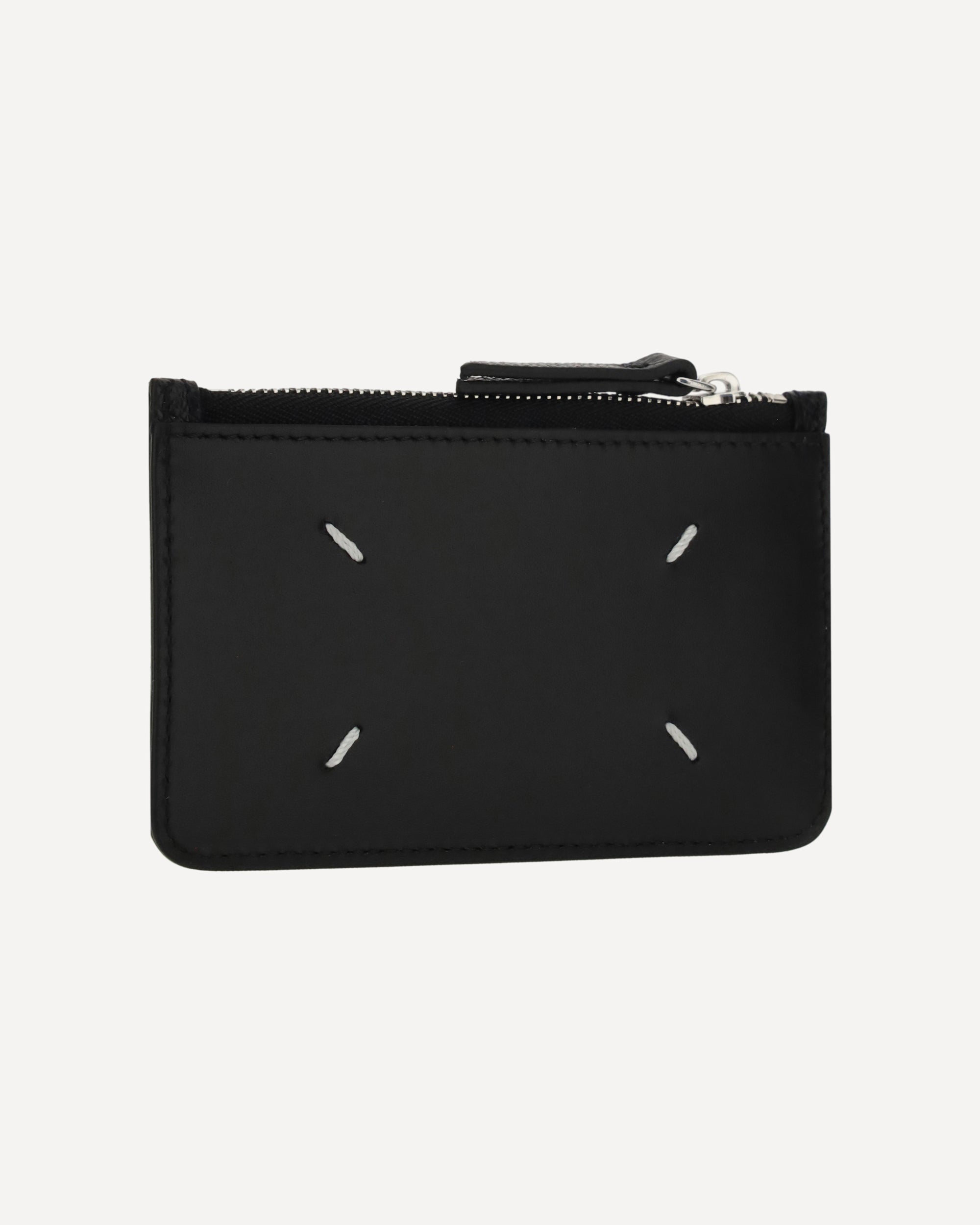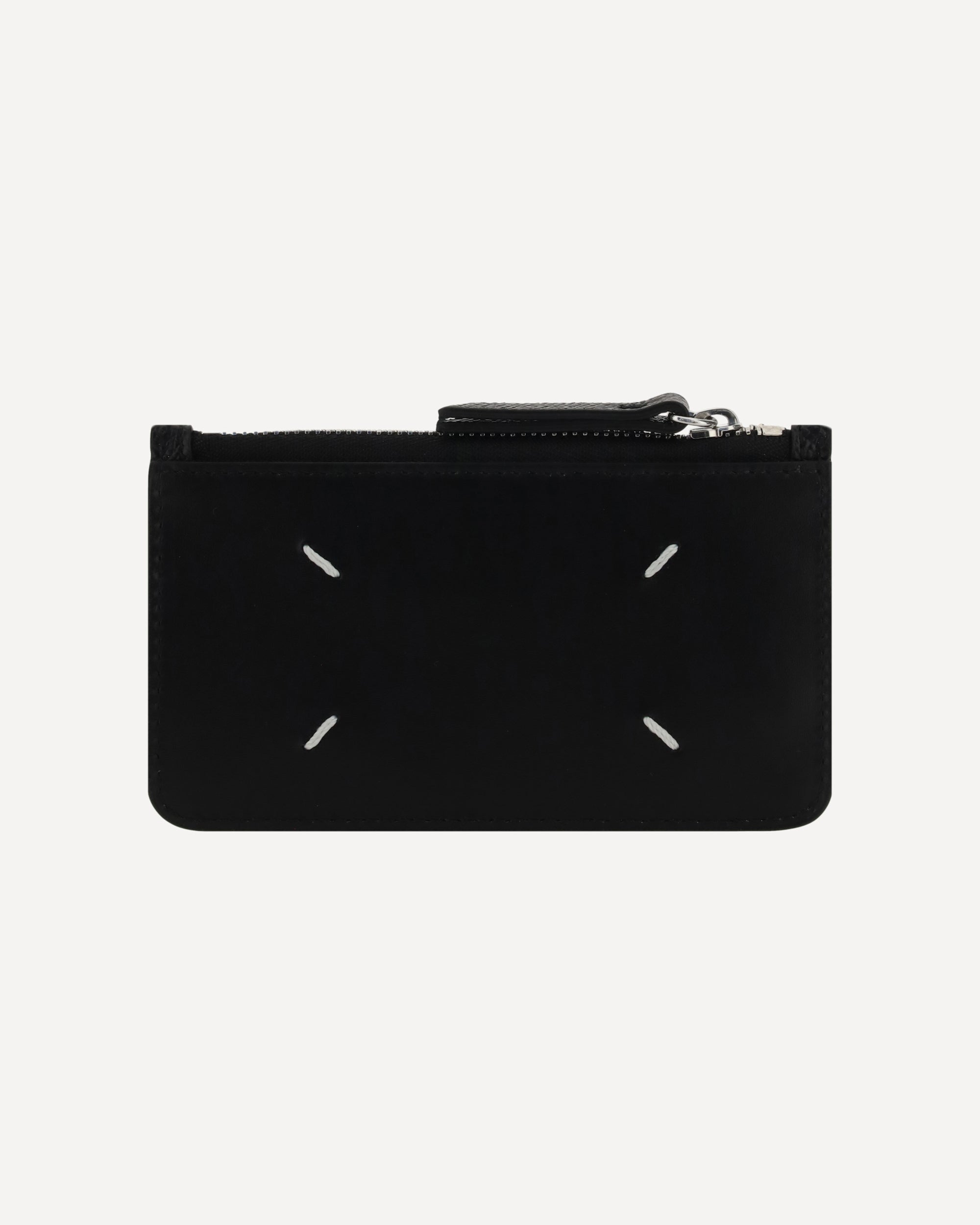 Calfskin Card Holder by Maison Margiela, top zipper closure, grained leather front, smooth leather back with iconic contrasting brand embroidery, card slot on front.