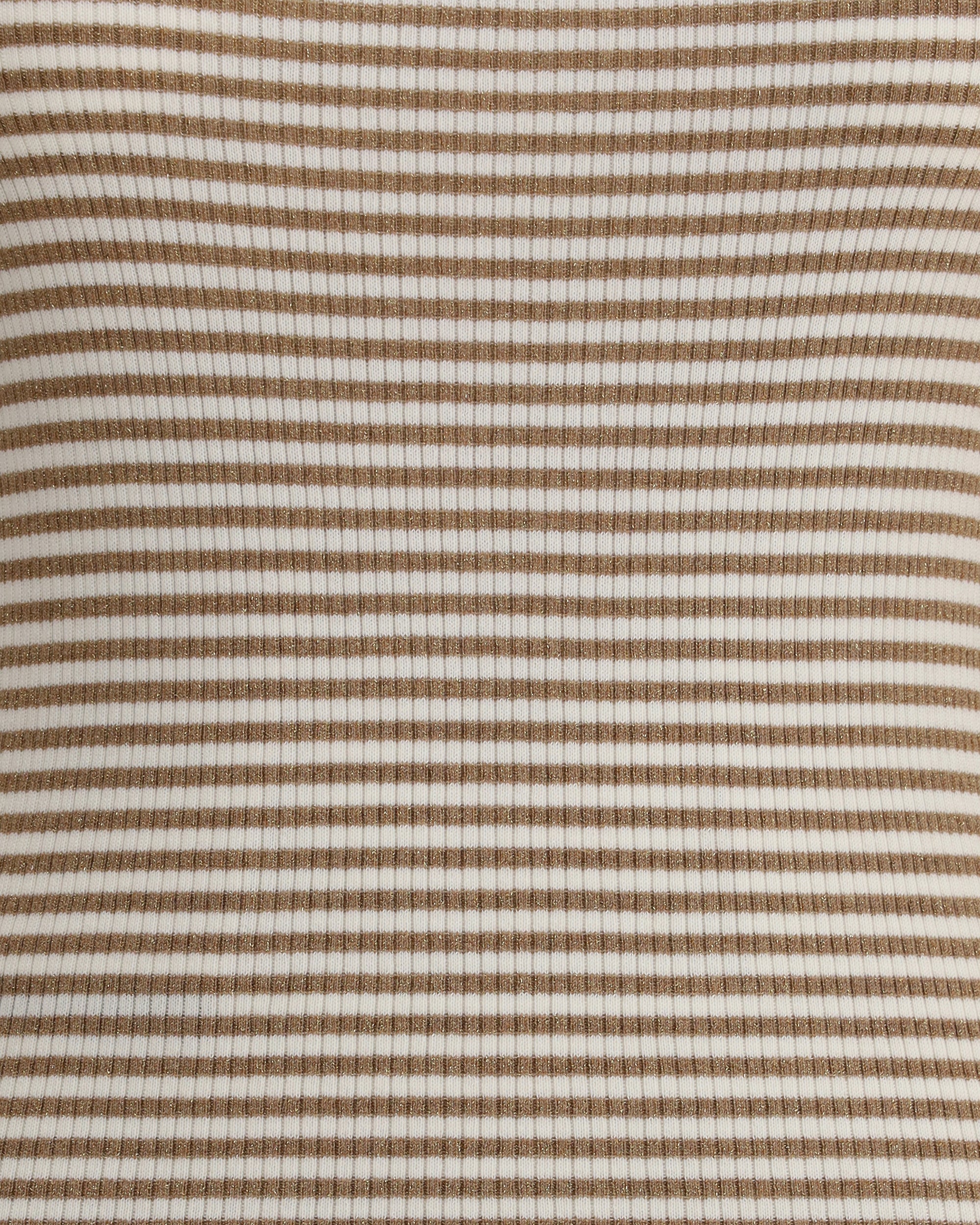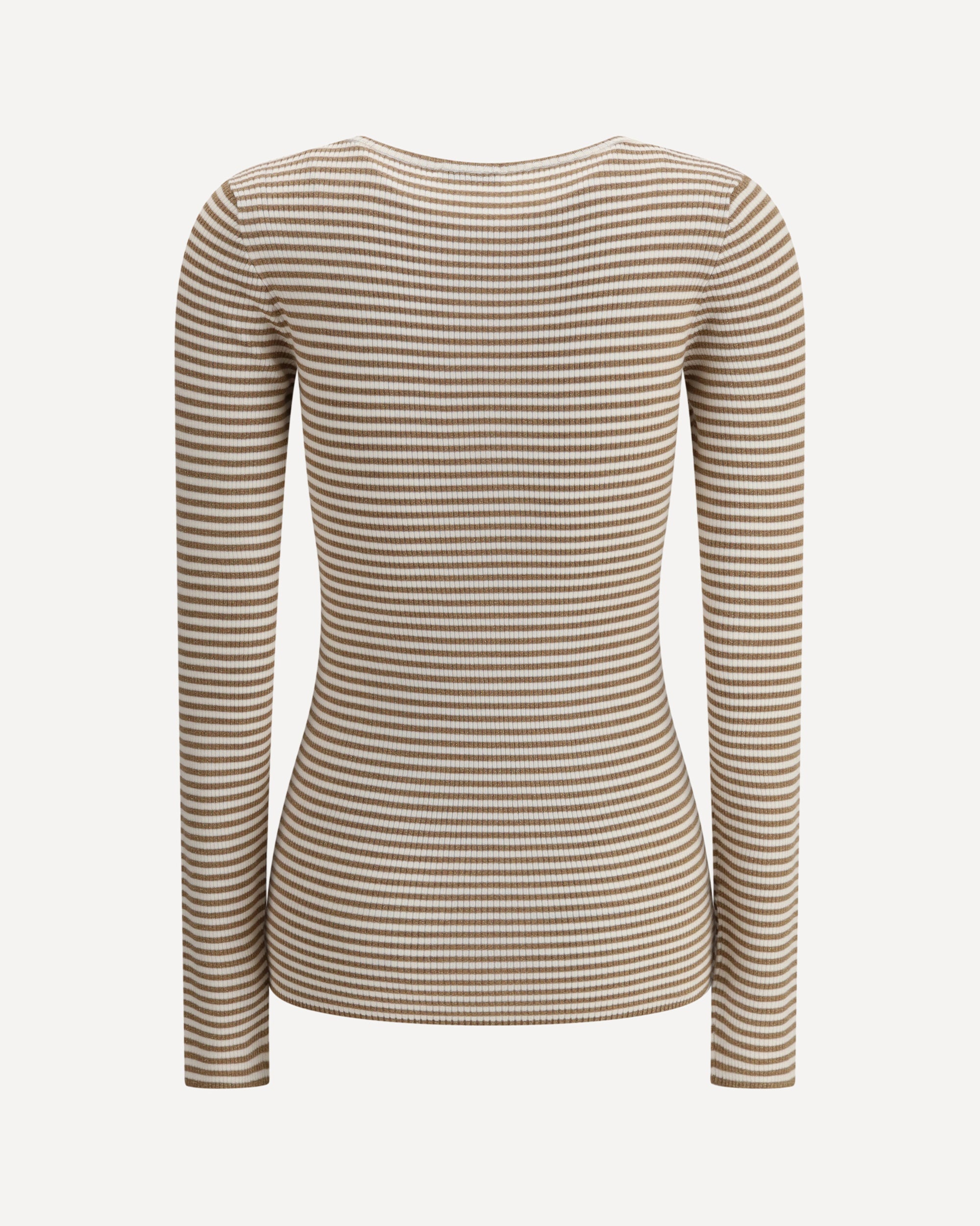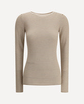 Cashmere Long Sleeve Jersey by Brunello Cucinelli is an elegant and luxurious garment. The crew neck offers a classic silhouette, while the ribbed design adds refined texture. The two-tone striped pattern lends a modern, dynamic touch, and the slim fit elegantly accentuates the figure.