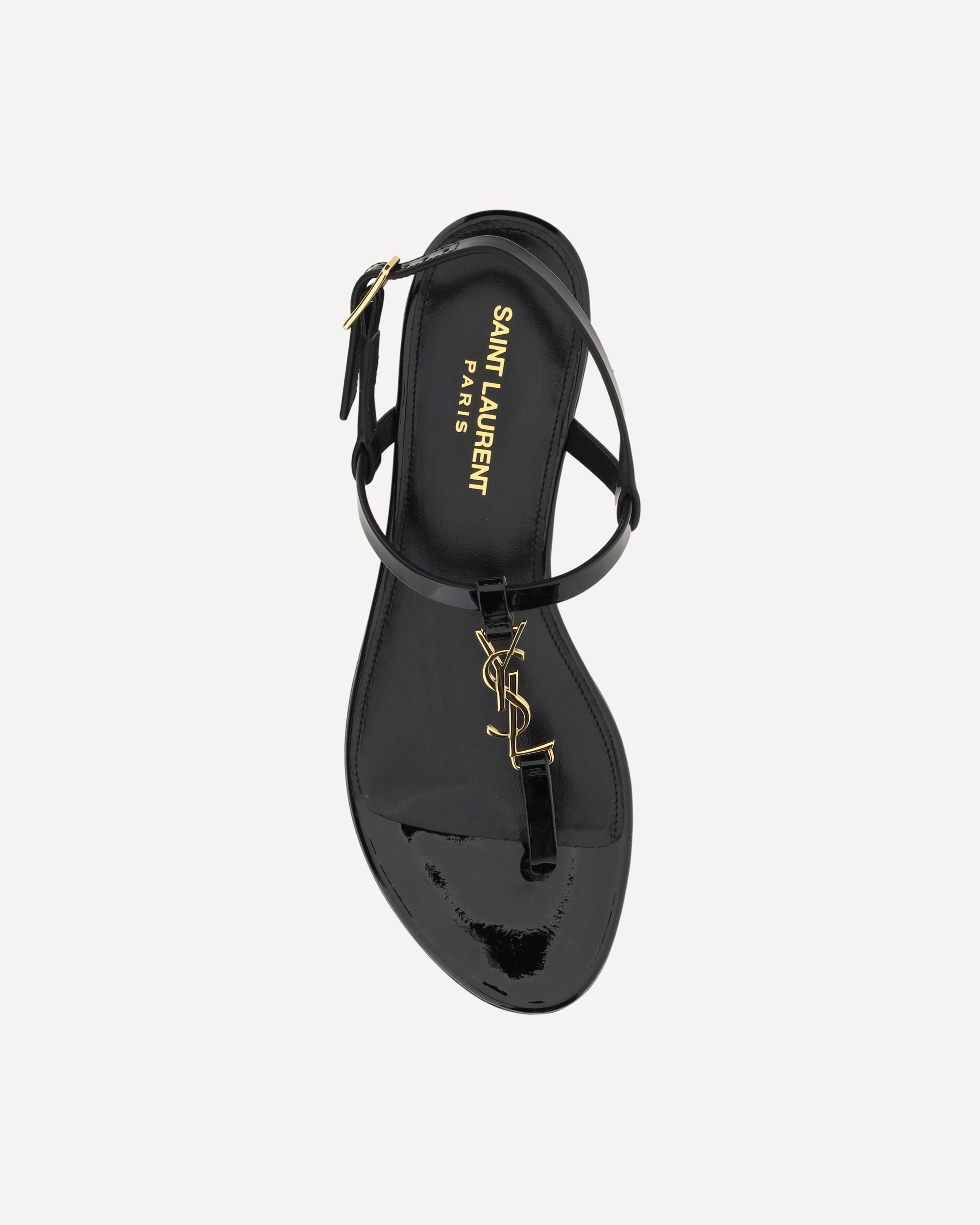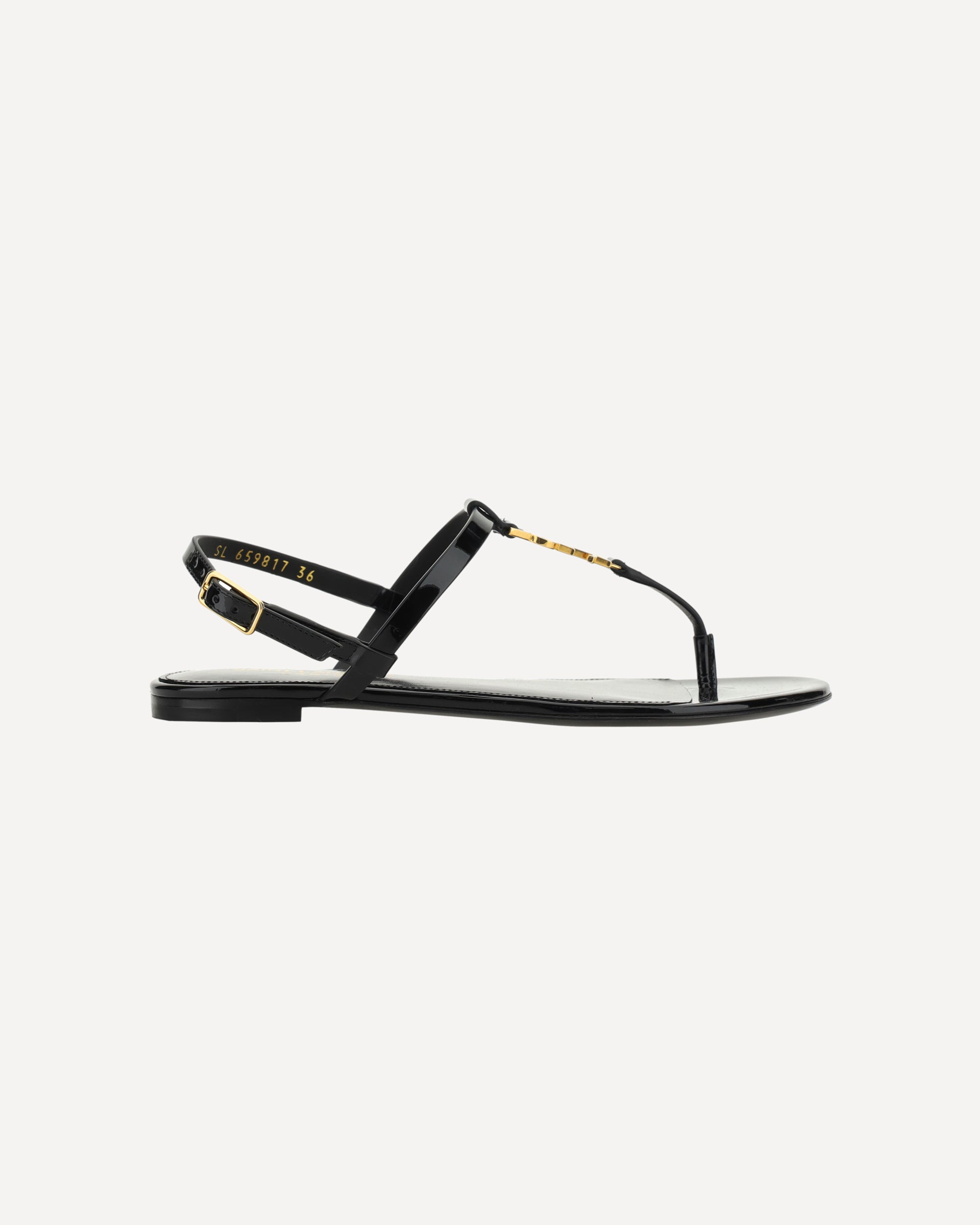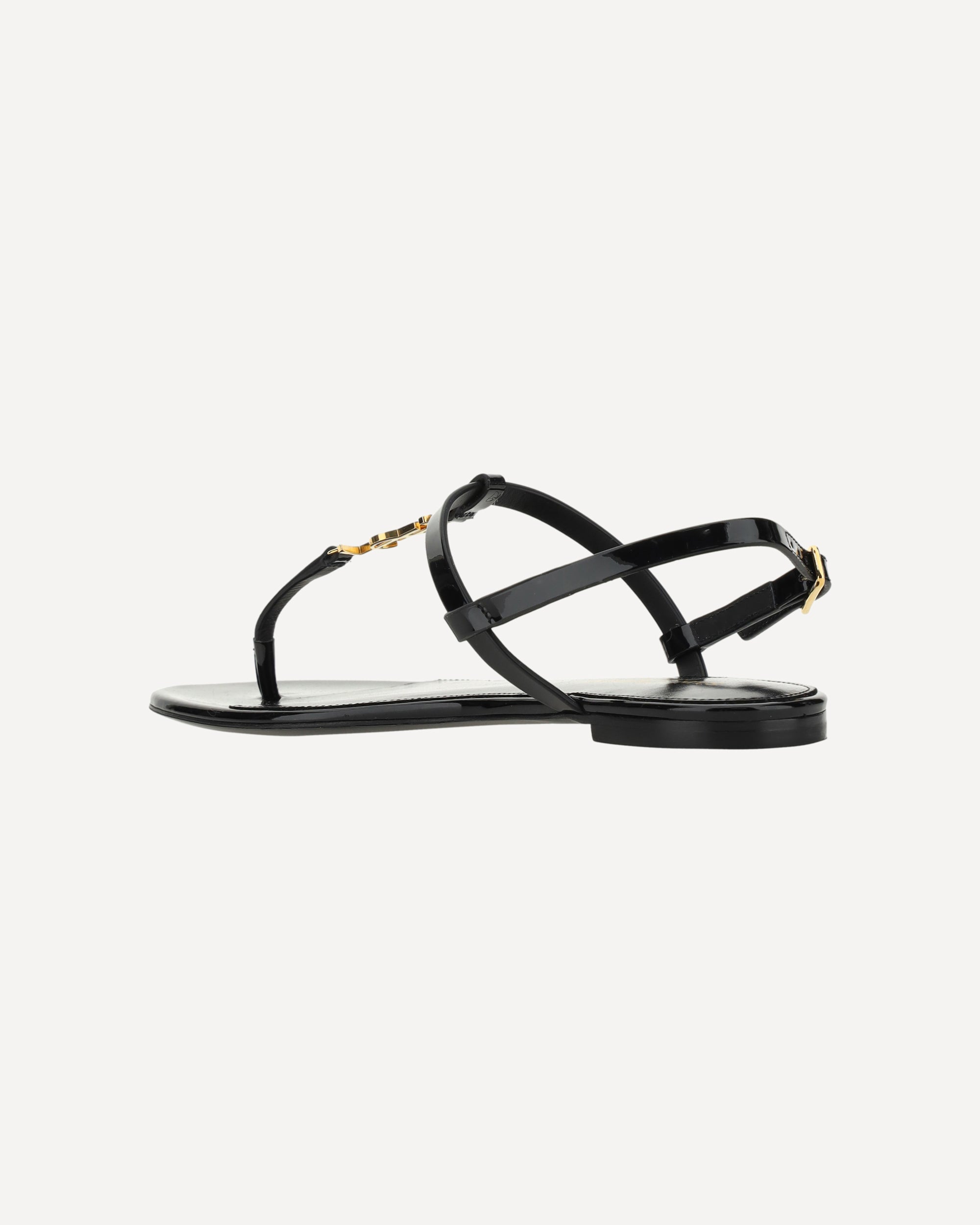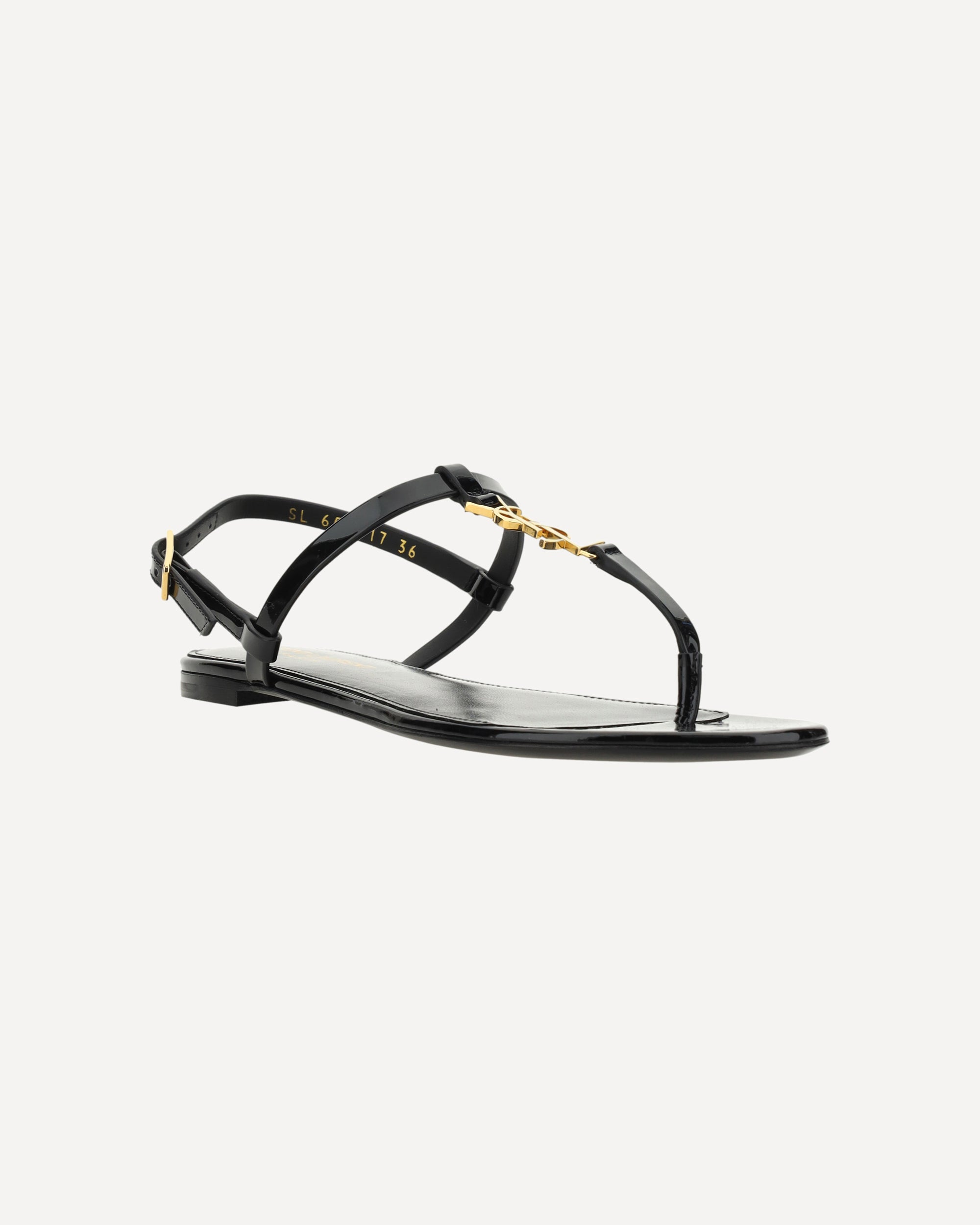 Calfskin Cassandra Sandals by Saint Laurent, flip-flop style, ankle strap closure with side buckle, iconic brand monogram detail embossed on front, logoed insole.