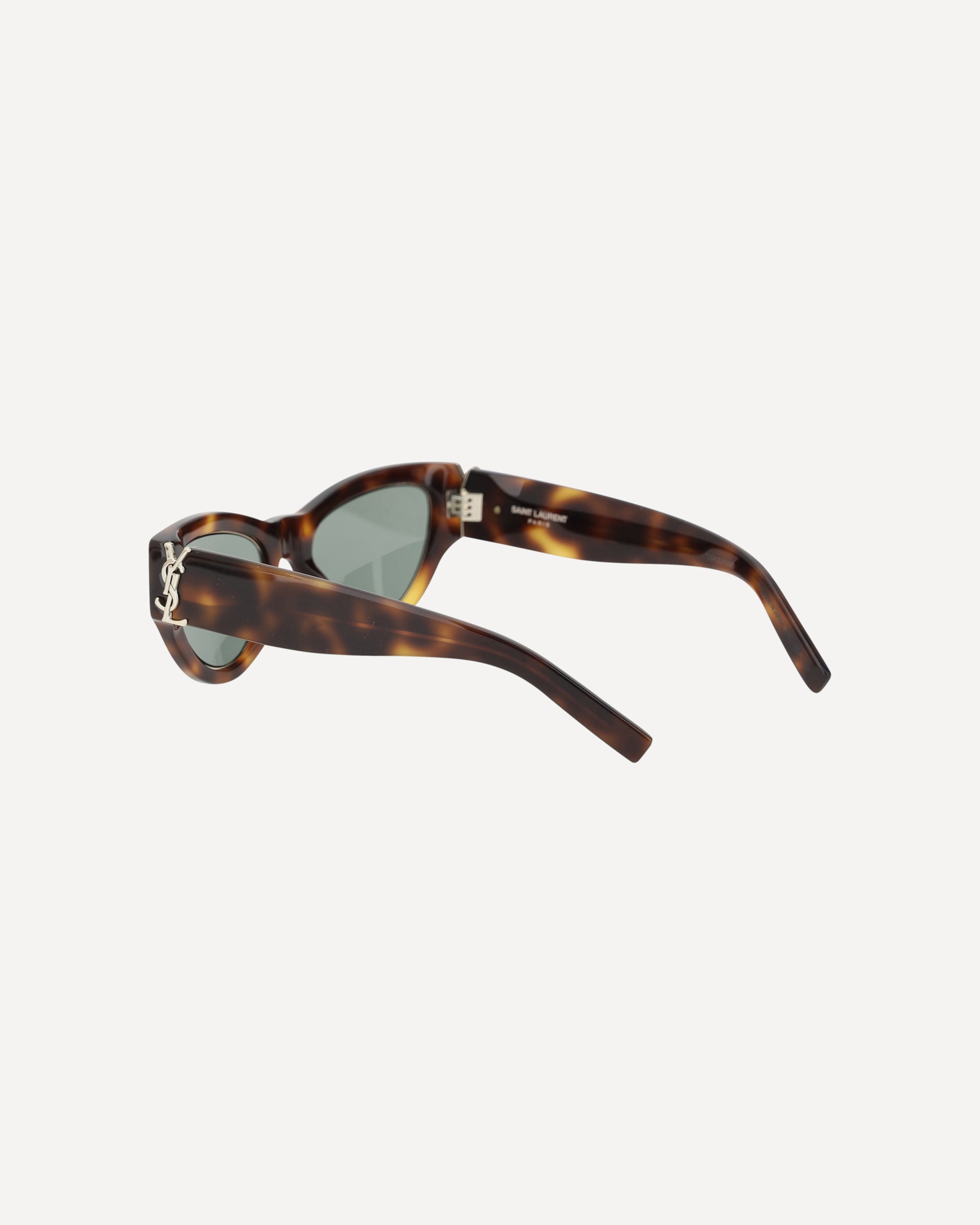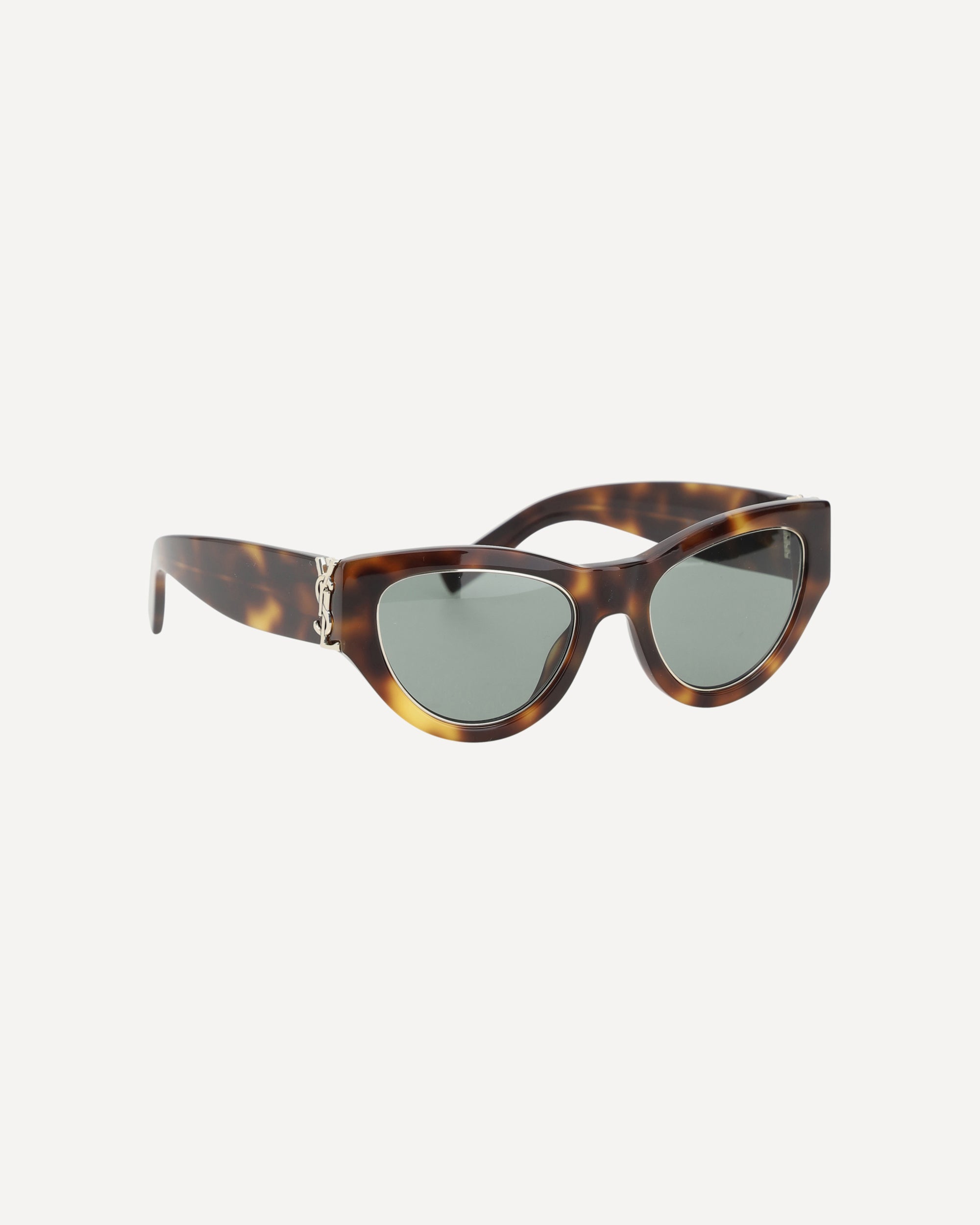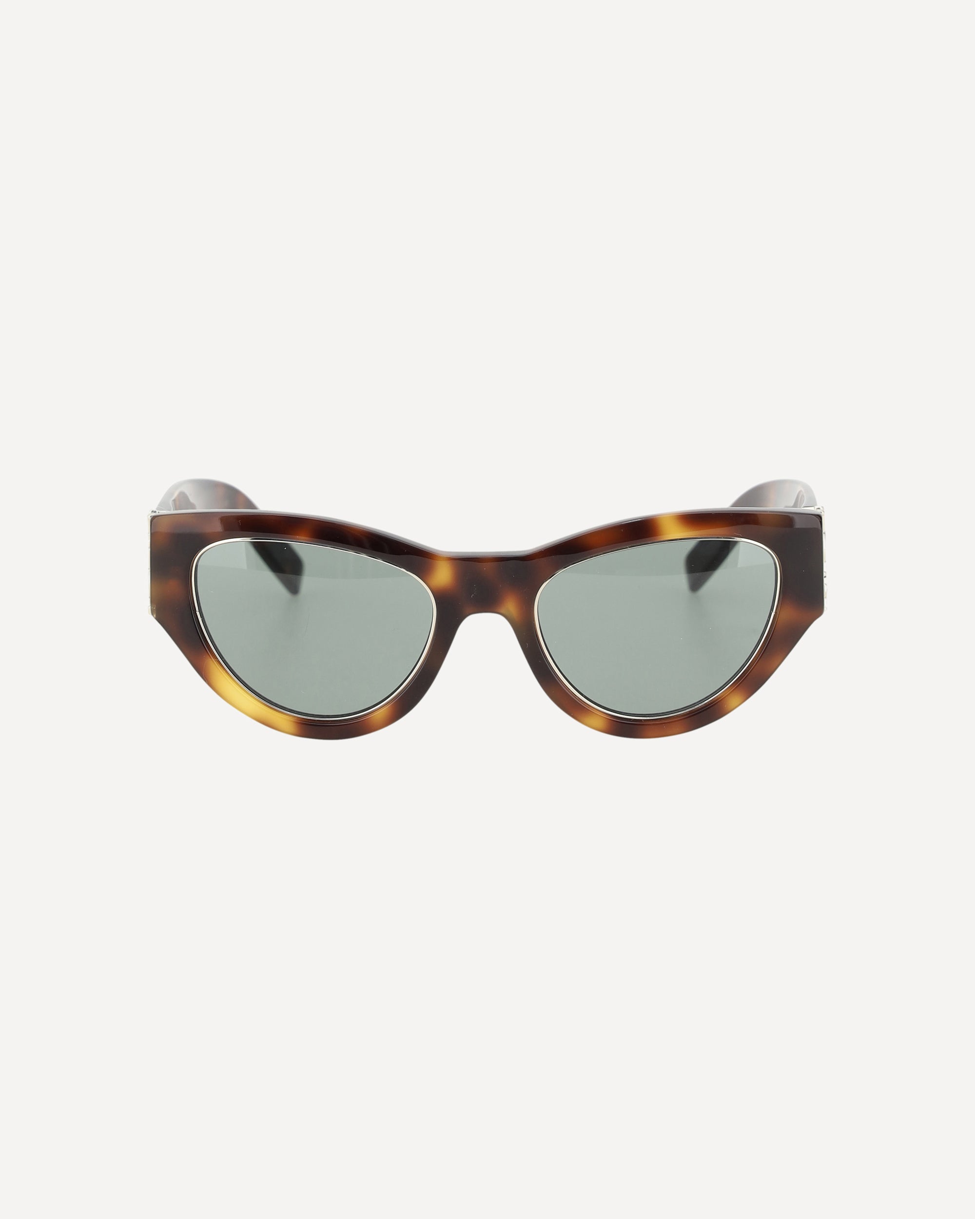 The Saint Laurent cat-eye Sunglasses are a sophisticated accessory that combines vintage style and modernity. Featuring a tortoiseshell patterned frame, these glasses capture attention thanks to the cat-eye shape, which gives a touch of elegance and femininity to the wearer. The plaque with the iconic logo of the brand, applied on the side, adds a distinctive detail that underlines the quality and luxury of the brand.