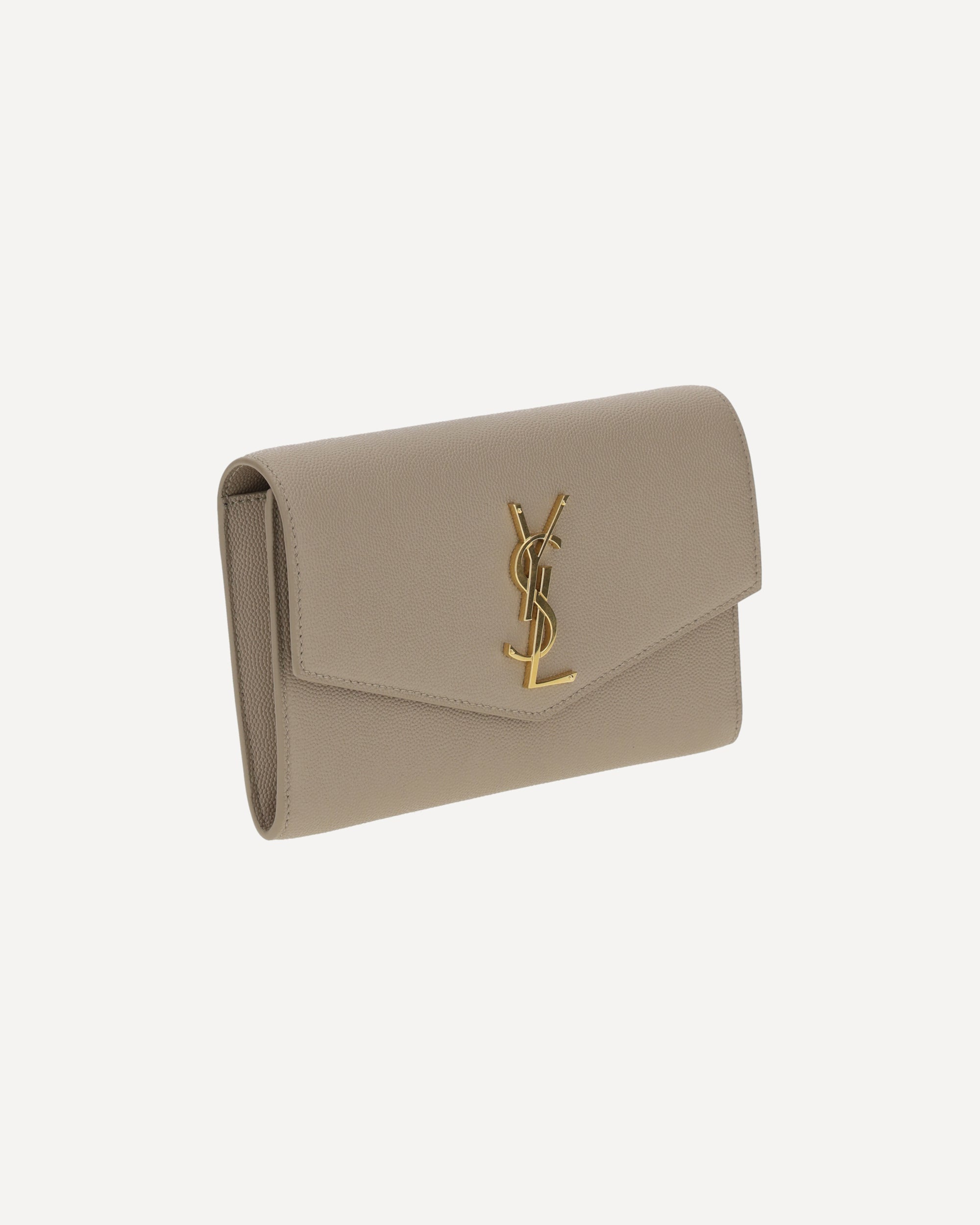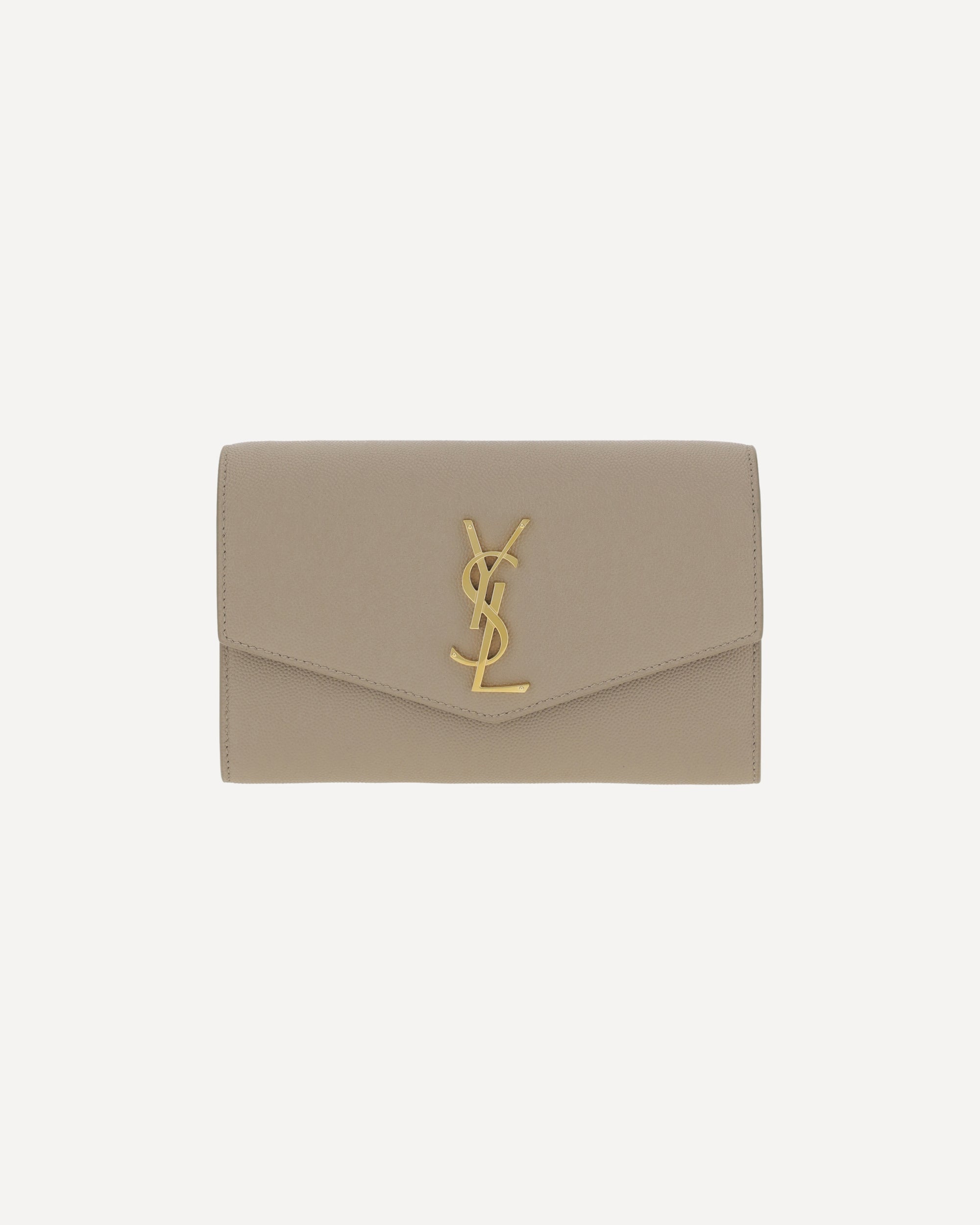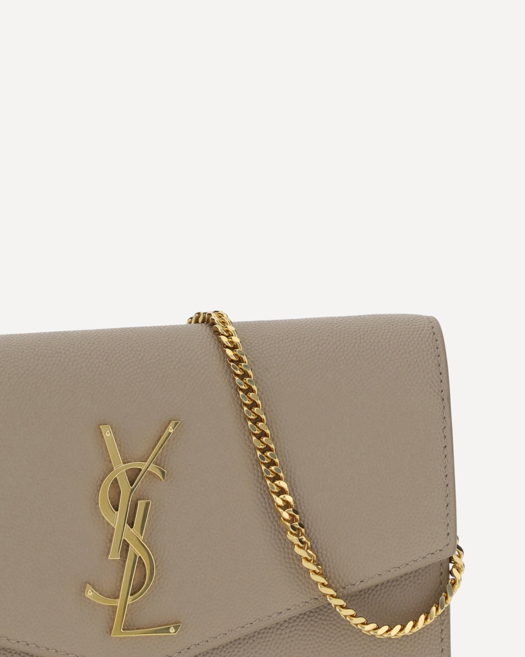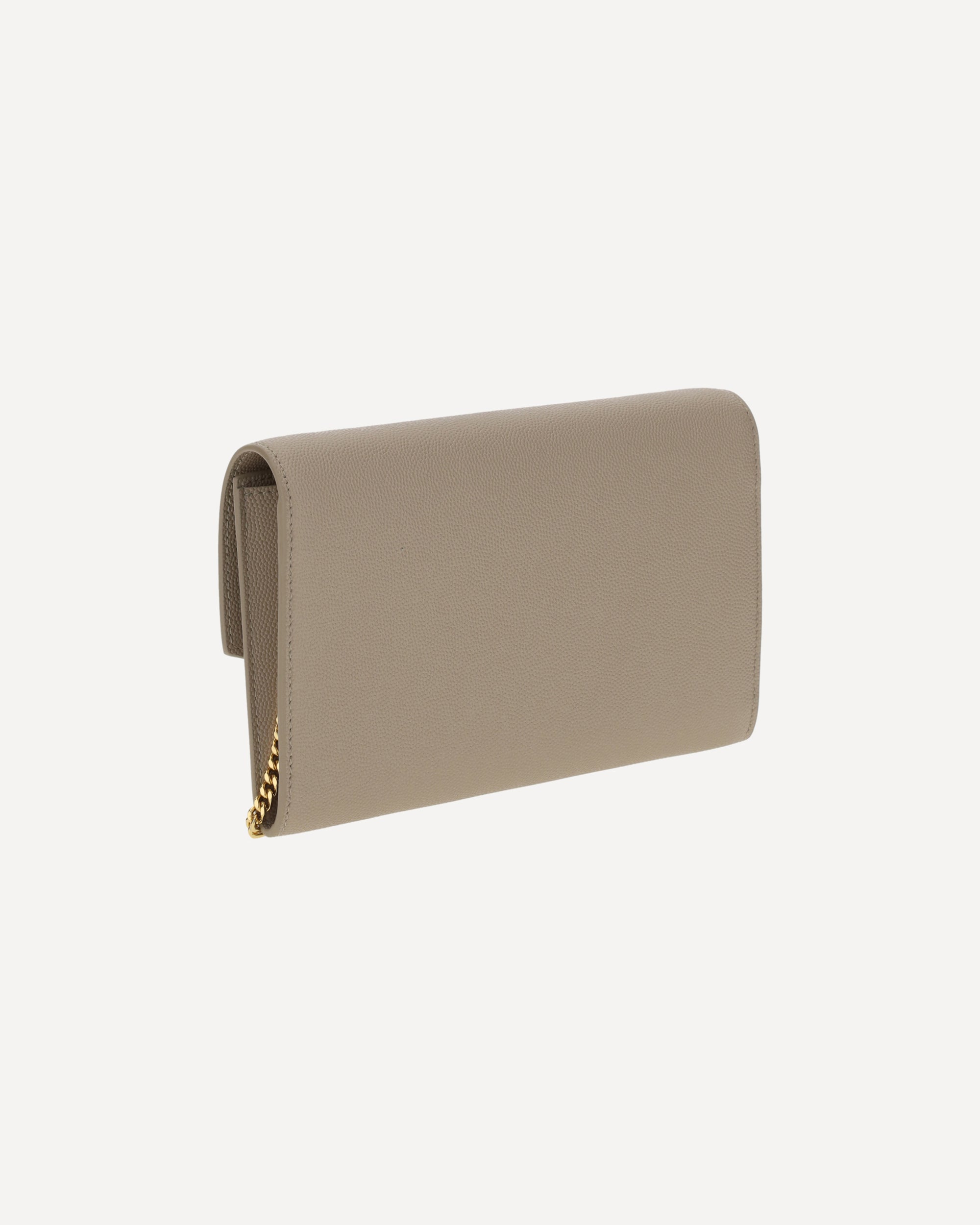 Saint Laurent's leather chain Wallet is a compact and sophisticated accessory, perfect for hand-held or worn on the shoulder. Crafted from smooth leather, it features a magnetic button closure and a removable chain strap for uncompromising versatility. The gold-tone embossed logo applied on the front adds an iconic and refined touch. The carefully organized interior includes a main compartment and a handy removable card holder, ideal for keeping everything in order in style.
