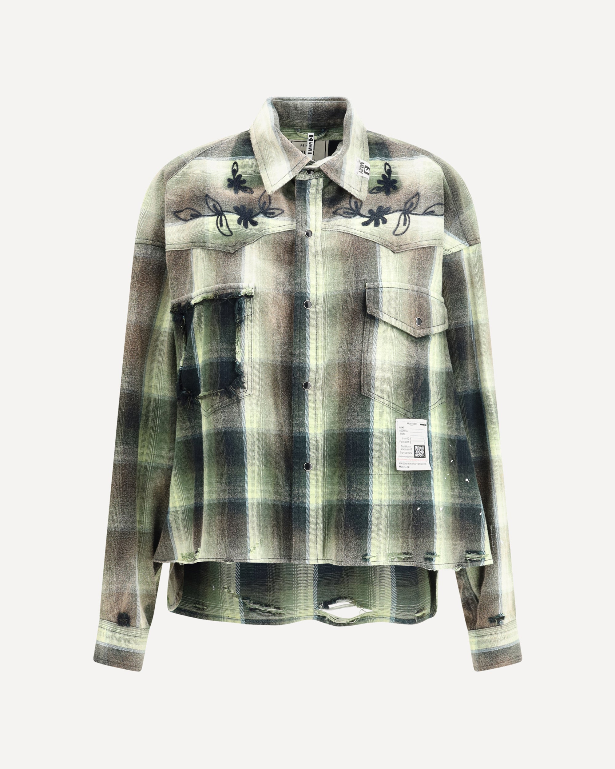 Maison Mihara's check Shirt reinterprets a classic with an original, lived-in twist. Featuring a front button closure, it has a buttoned chest pocket and cuffs that are also buttoned. The design is enriched with floral embroidery and a worn effect that gives character to the garment. Completing the look are two patch pockets on the front with a flap and snap button, for an edgy and sophisticated style.