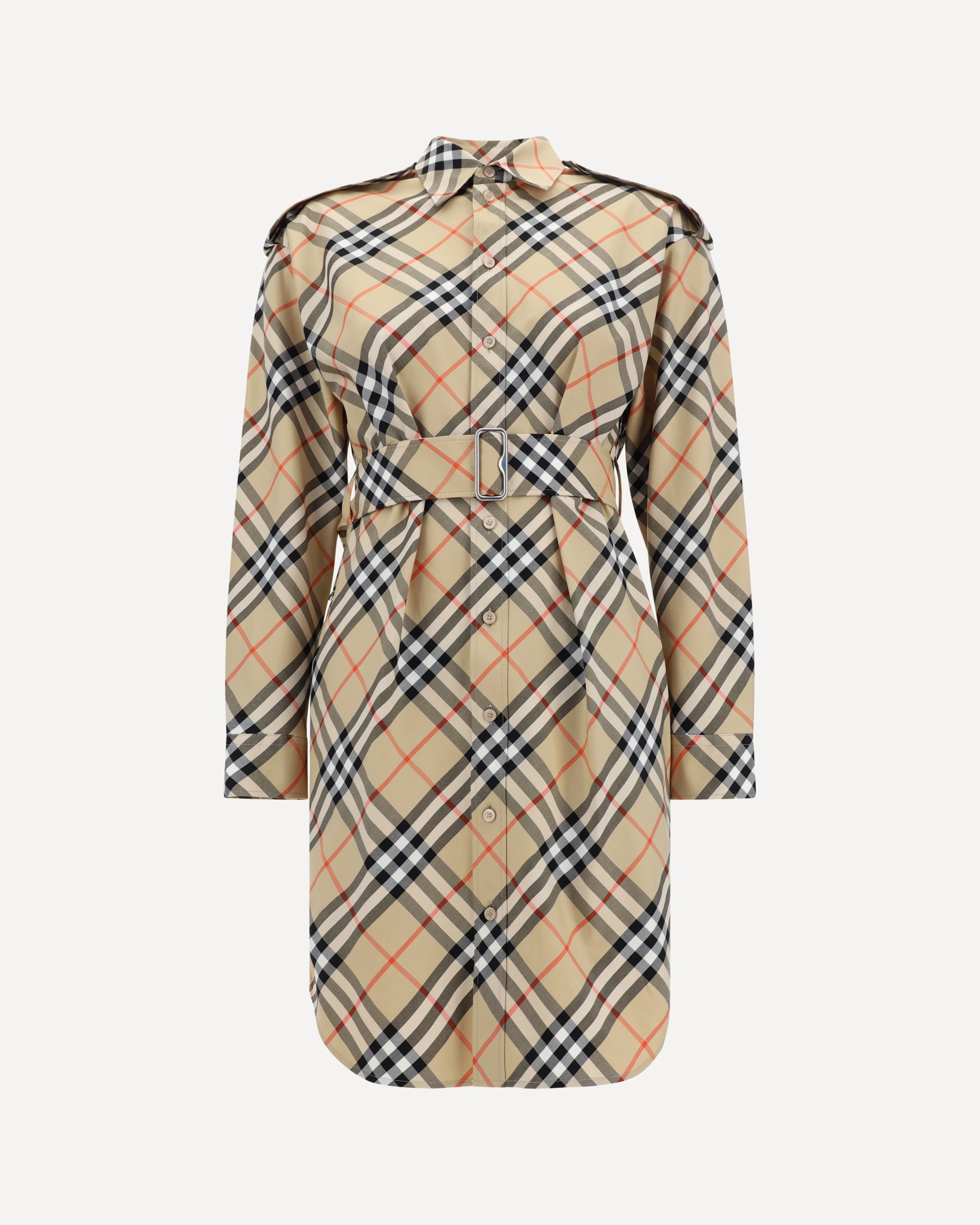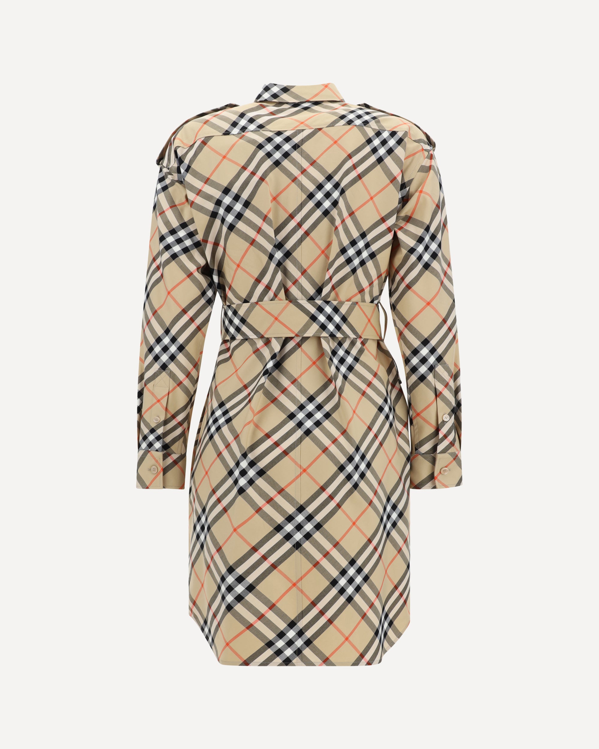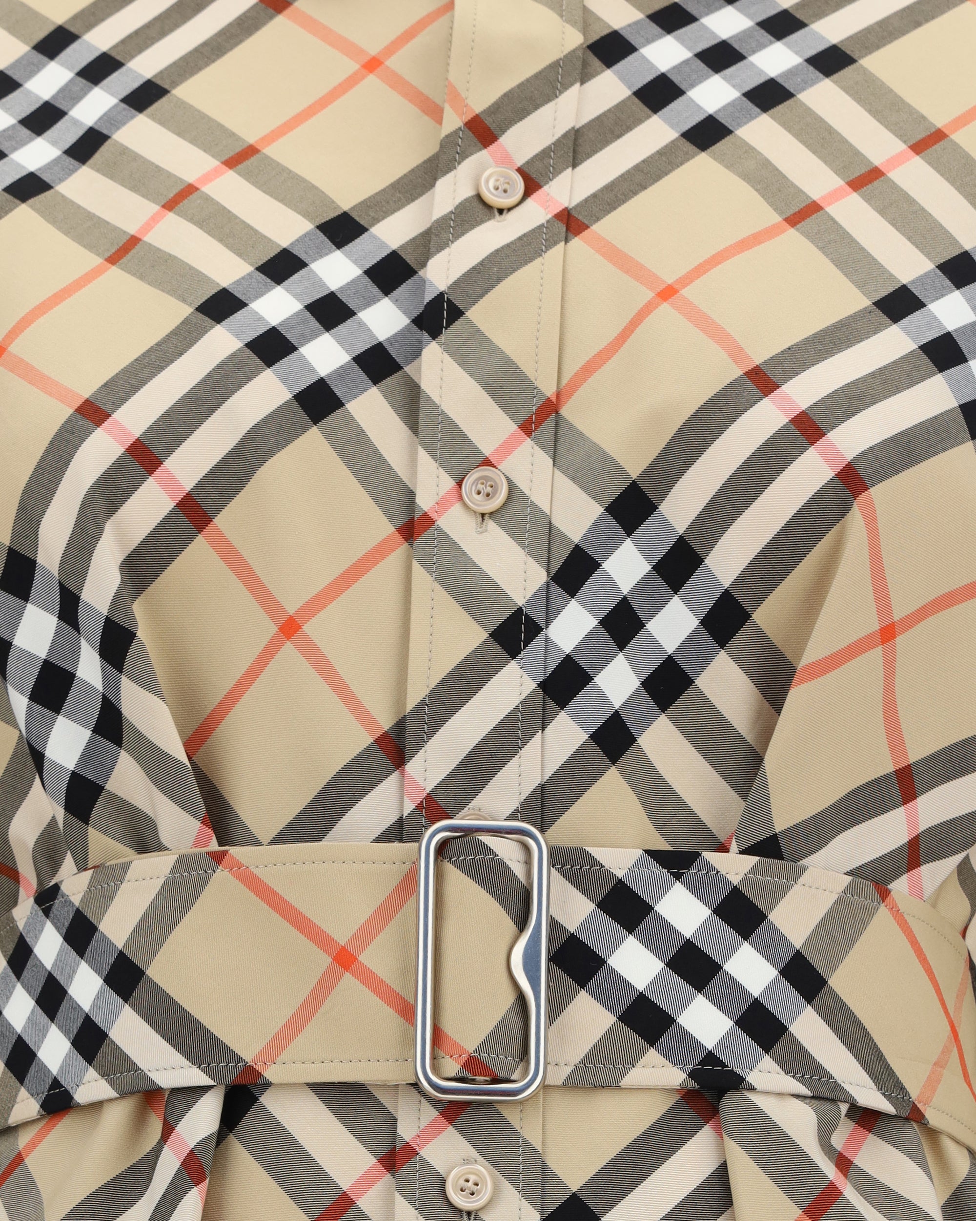 Burberry's cotton chemisier Dress is an iconic and versatile piece featuring a classic collar and front button closure. The two side welt pockets add a practical touch, while the matching adjustable and removable belt defines the waist. Belt loops, positioned at three heights, allow you to customize the fit. Complemented by the historic all-over Check Archivio pattern, this suit expresses timeless elegance and style.