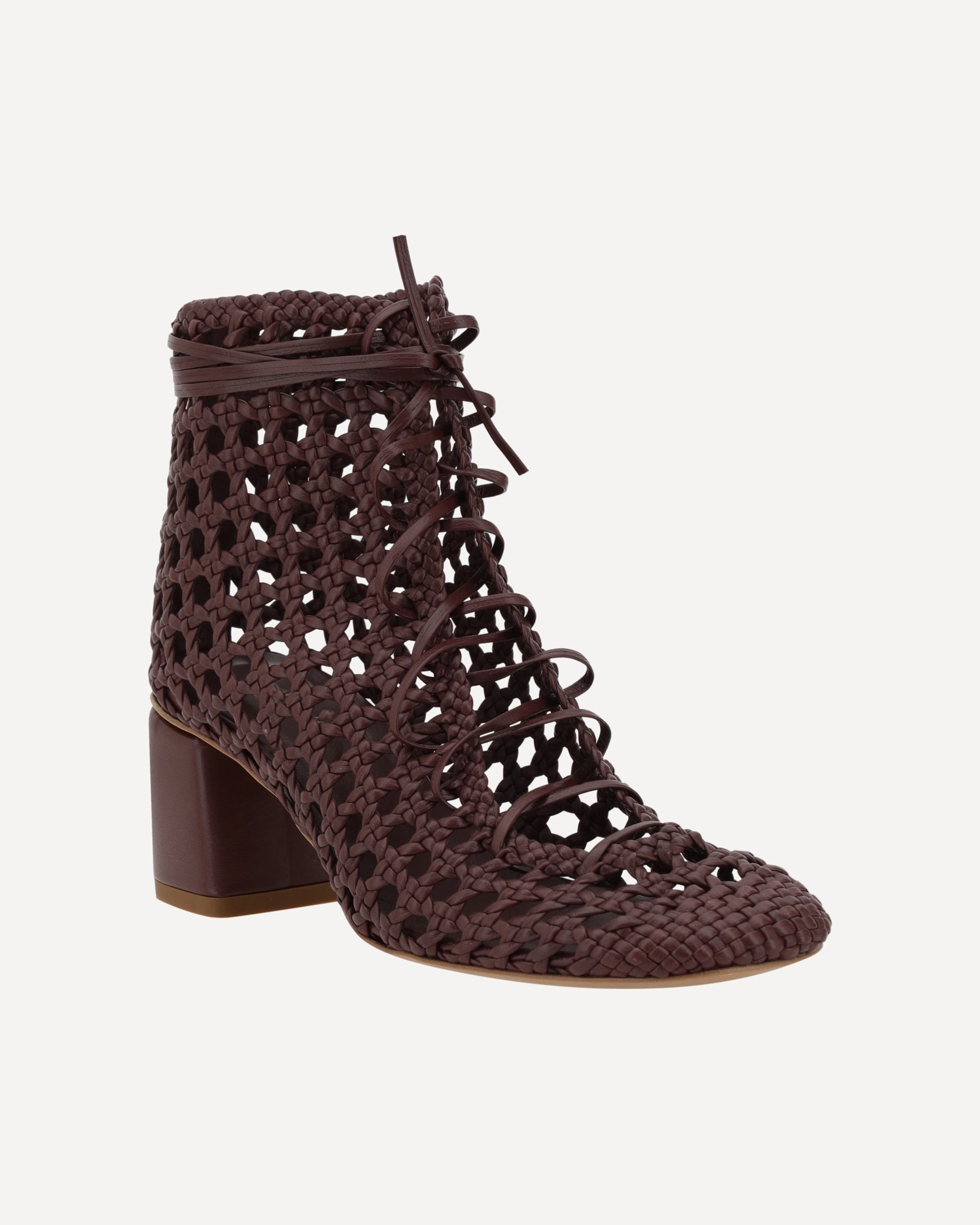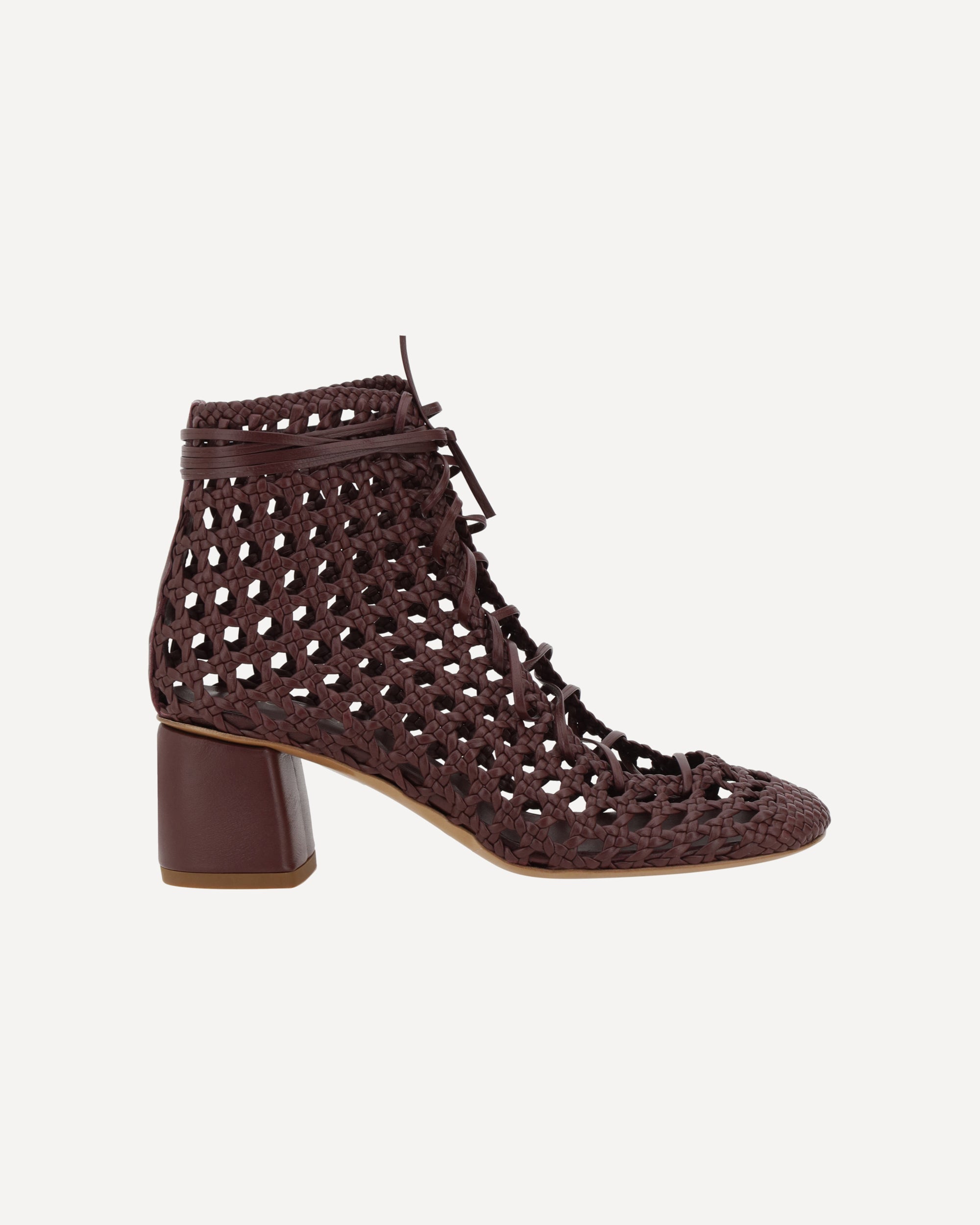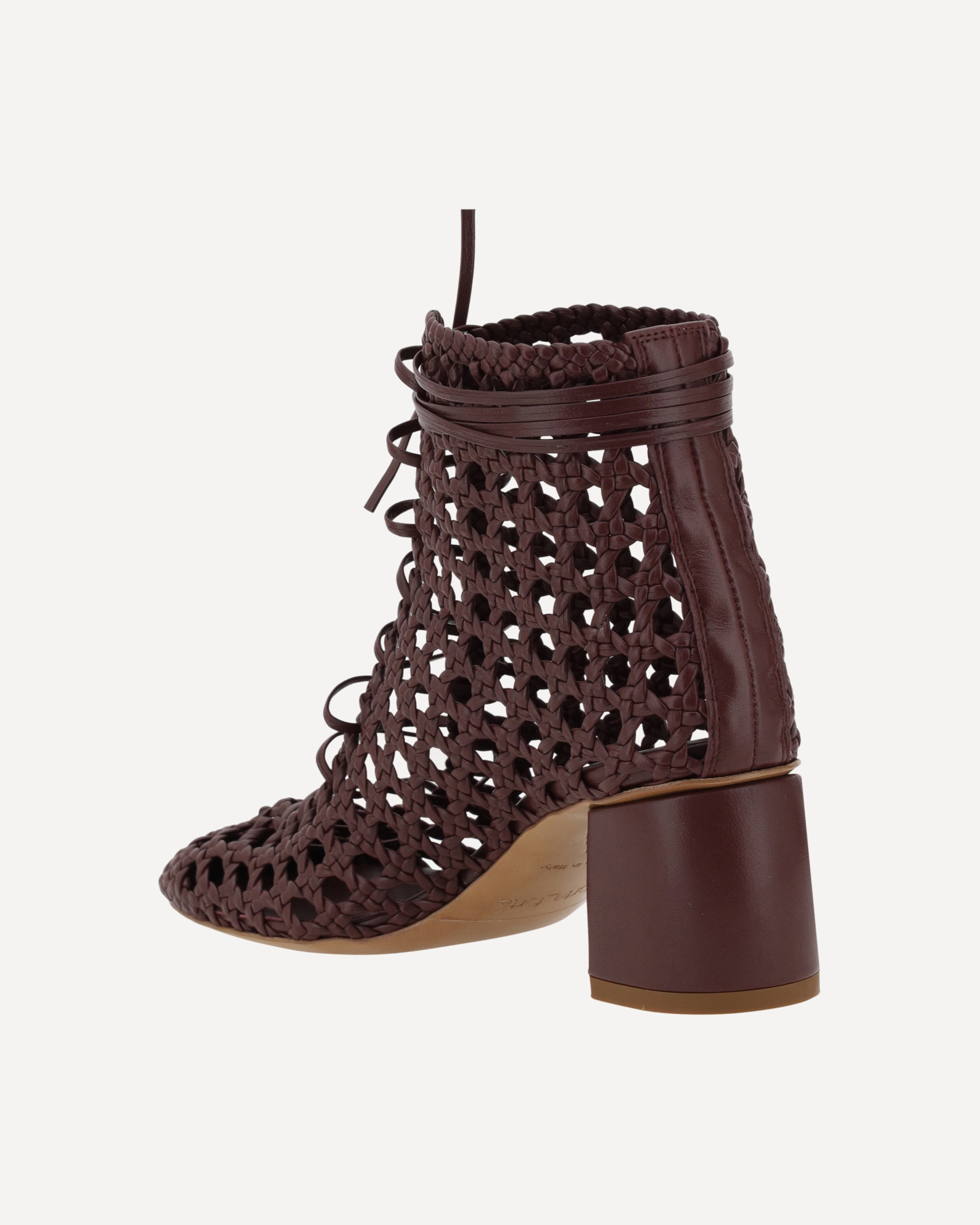 Forte_Forte's Chic leather Ankle Boots are a perfect blend of elegance and modernity. The round toe gives a classic look, while the mesh design adds a light and original touch. The front closure with crossed laces ensures an adjustable and secure fit, while the wide leather heel offers stability and comfort. The logoed insole enhances the design with a distinctive brand detail.