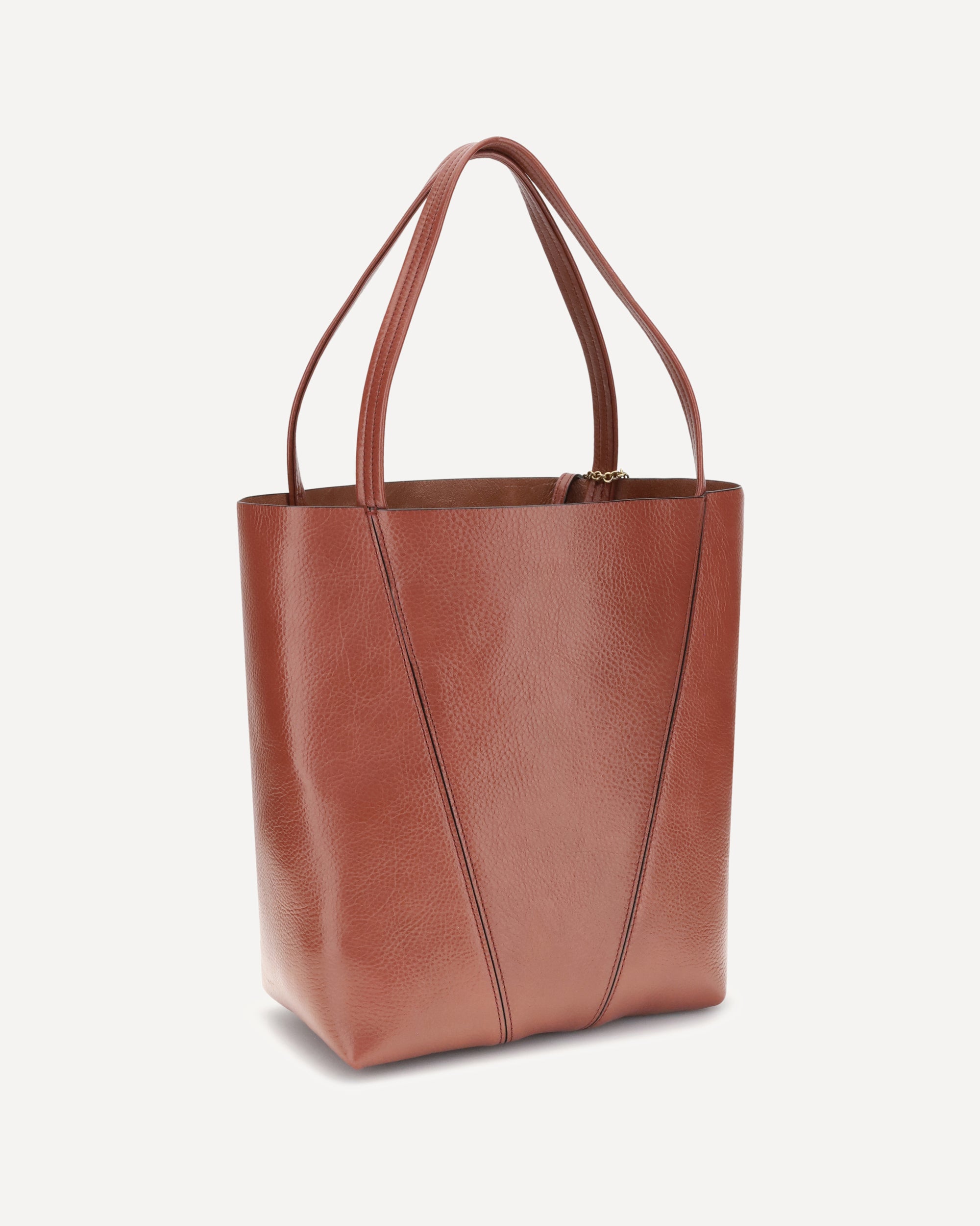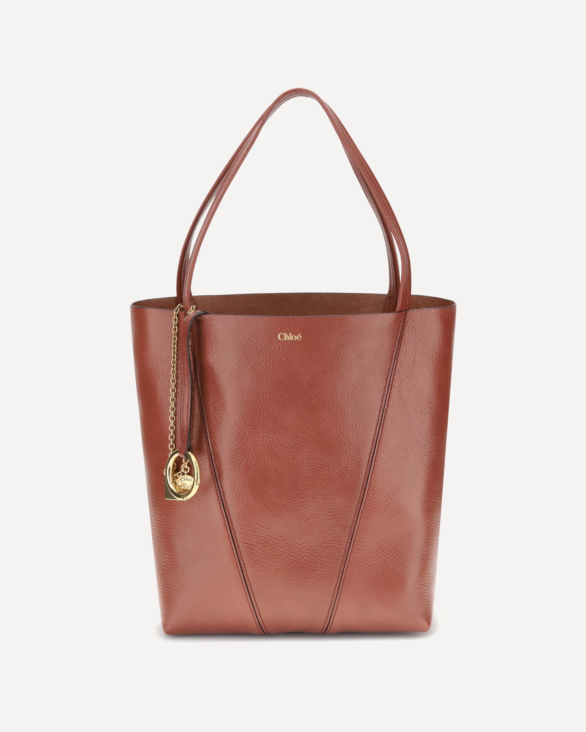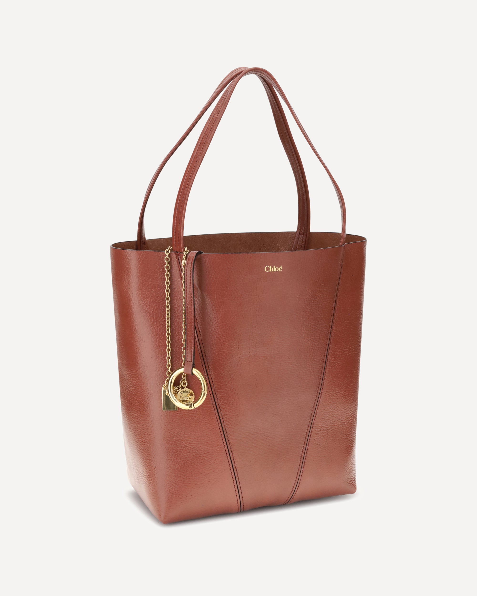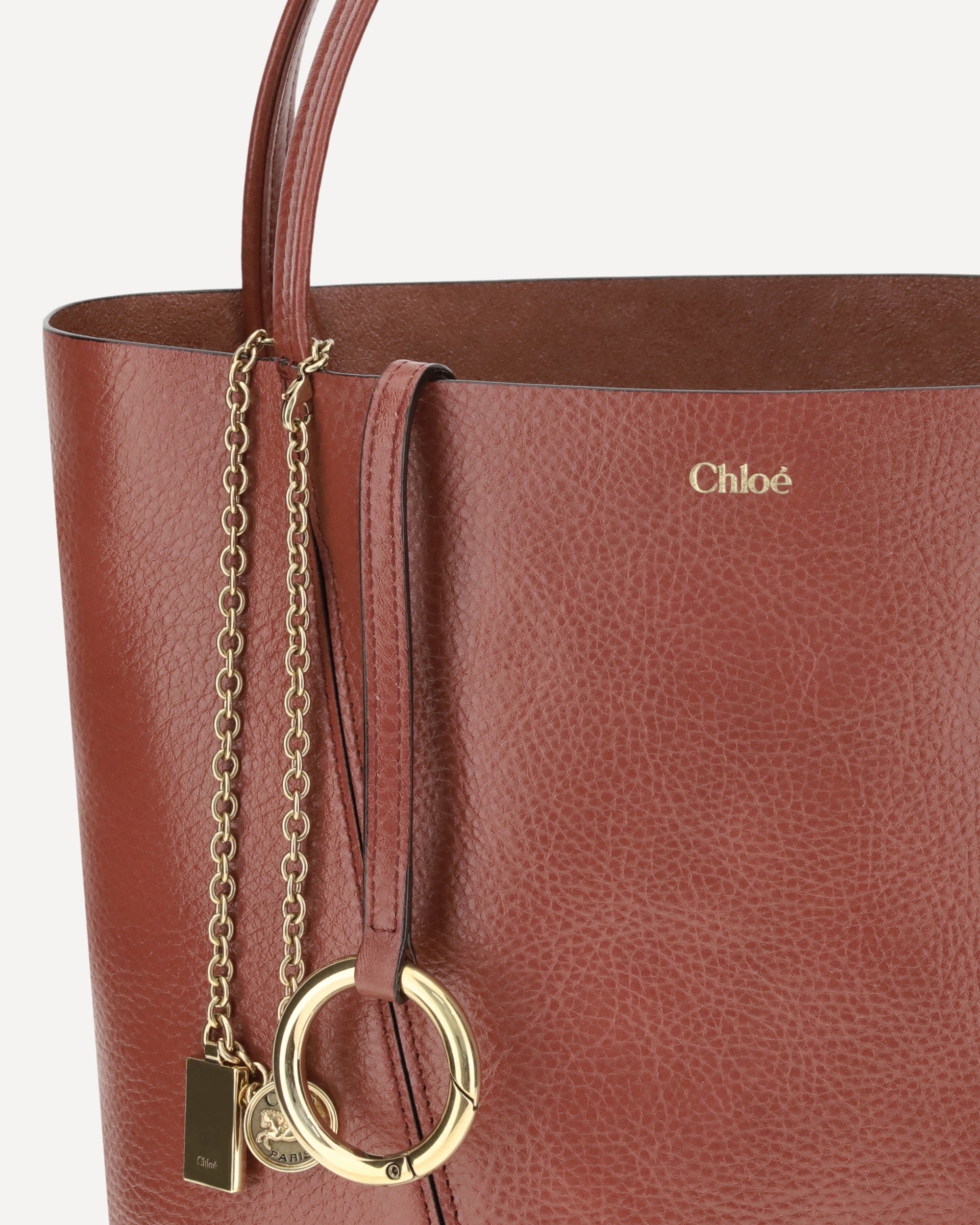 Leather Spin Shoulder Bag by Chloé is a refined and modern accessory featuring a sleek grained leather design. The two flat top handles offer a comfortable and practical grip, while the brand's iconic monogram, press-stamped on the front, adds a distinctive touch of luxury. The closure of the bag is made via a ring that holds the two handles together, an element that gives it a unique and functional look. A fascinating detail is the chain with a pendant bearing the iconic logo applied to the handle. The interior of the bag consists of a single compartment.