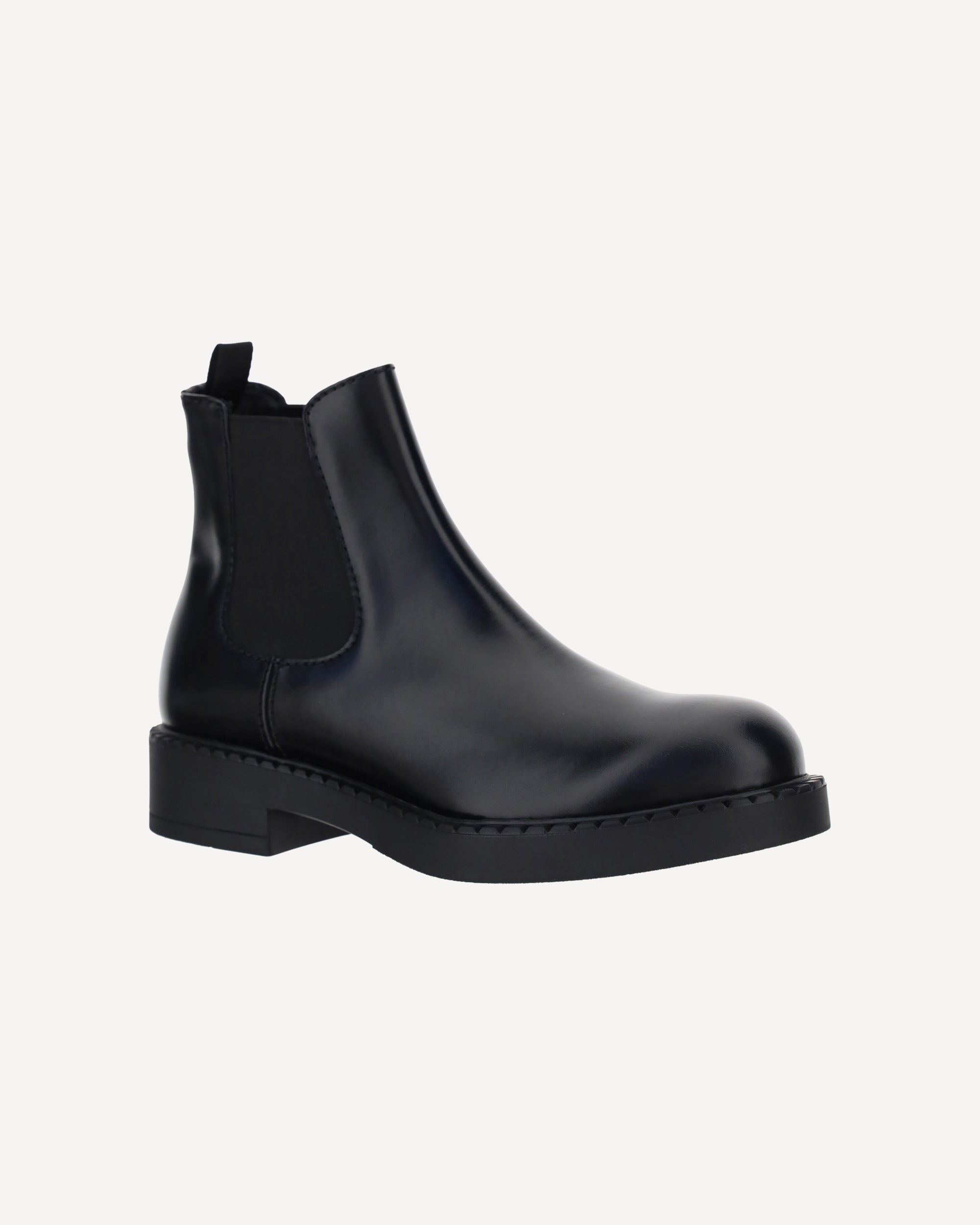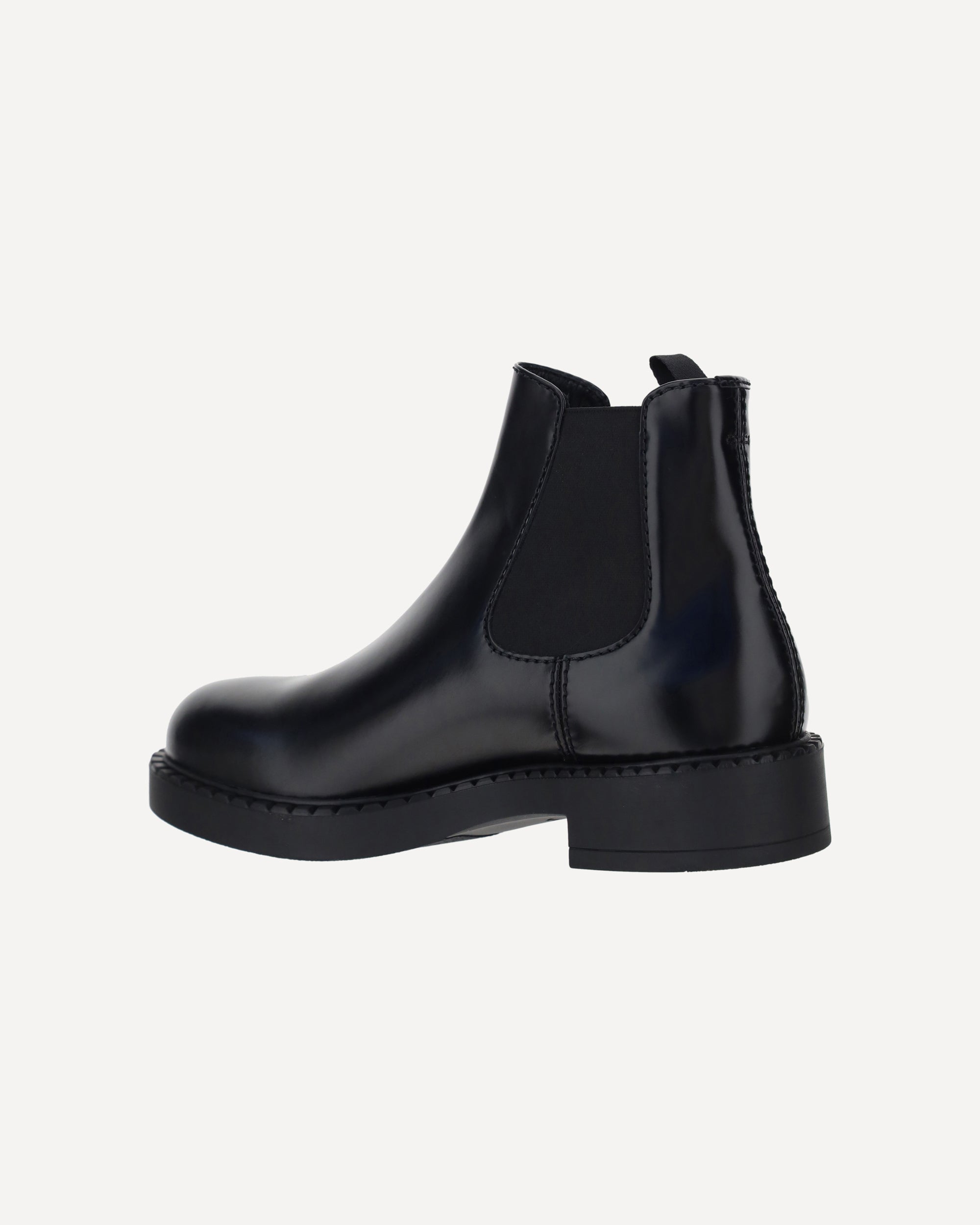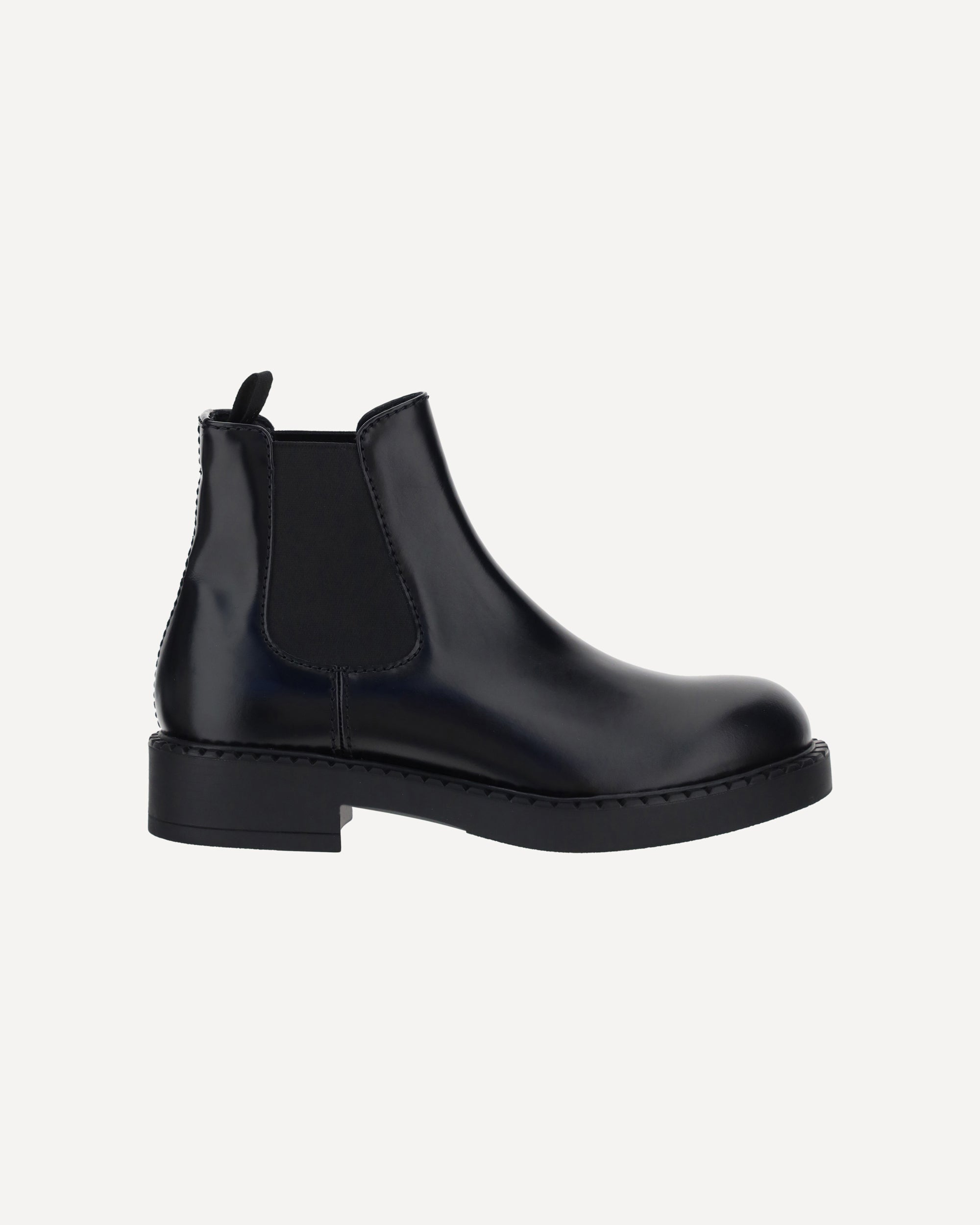 Calfskin Chocolate Boots by Prada, ankle-length model, shiny leather design, elongated toe, slight block heel.
