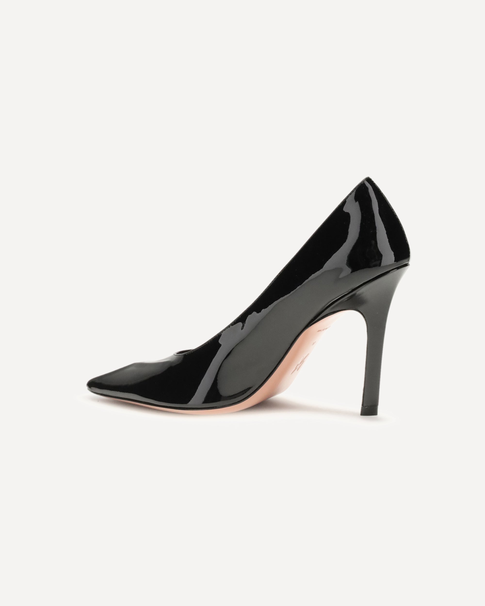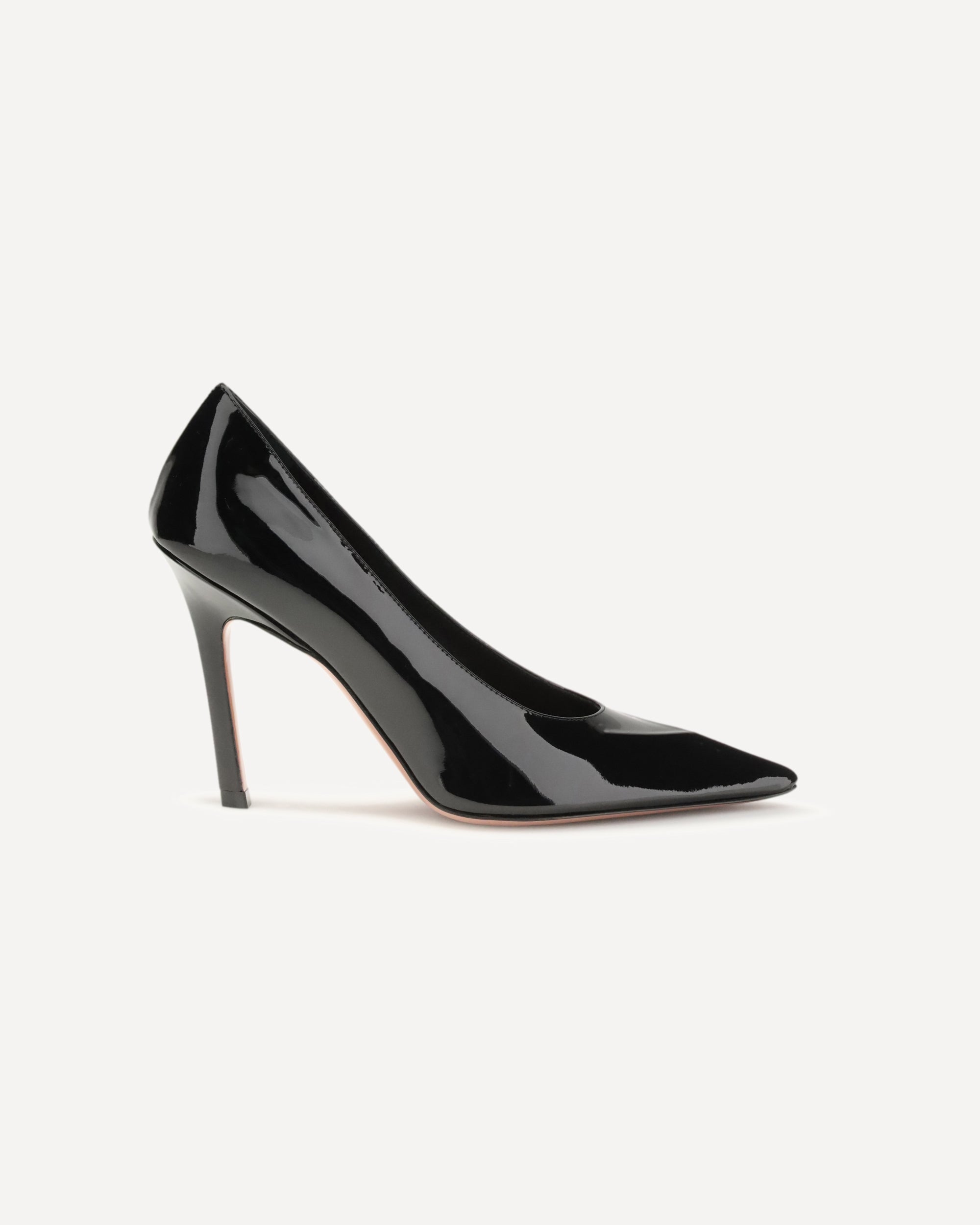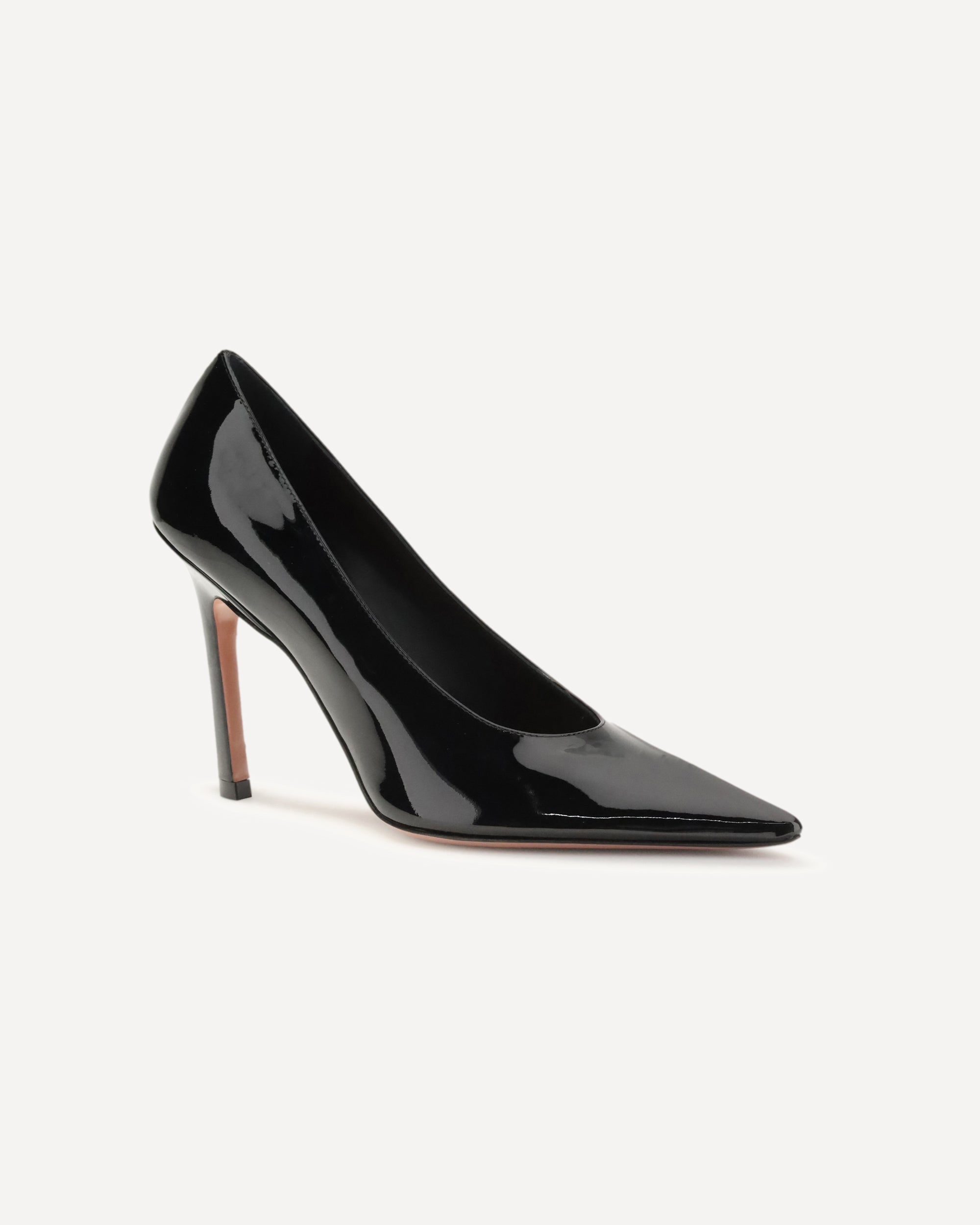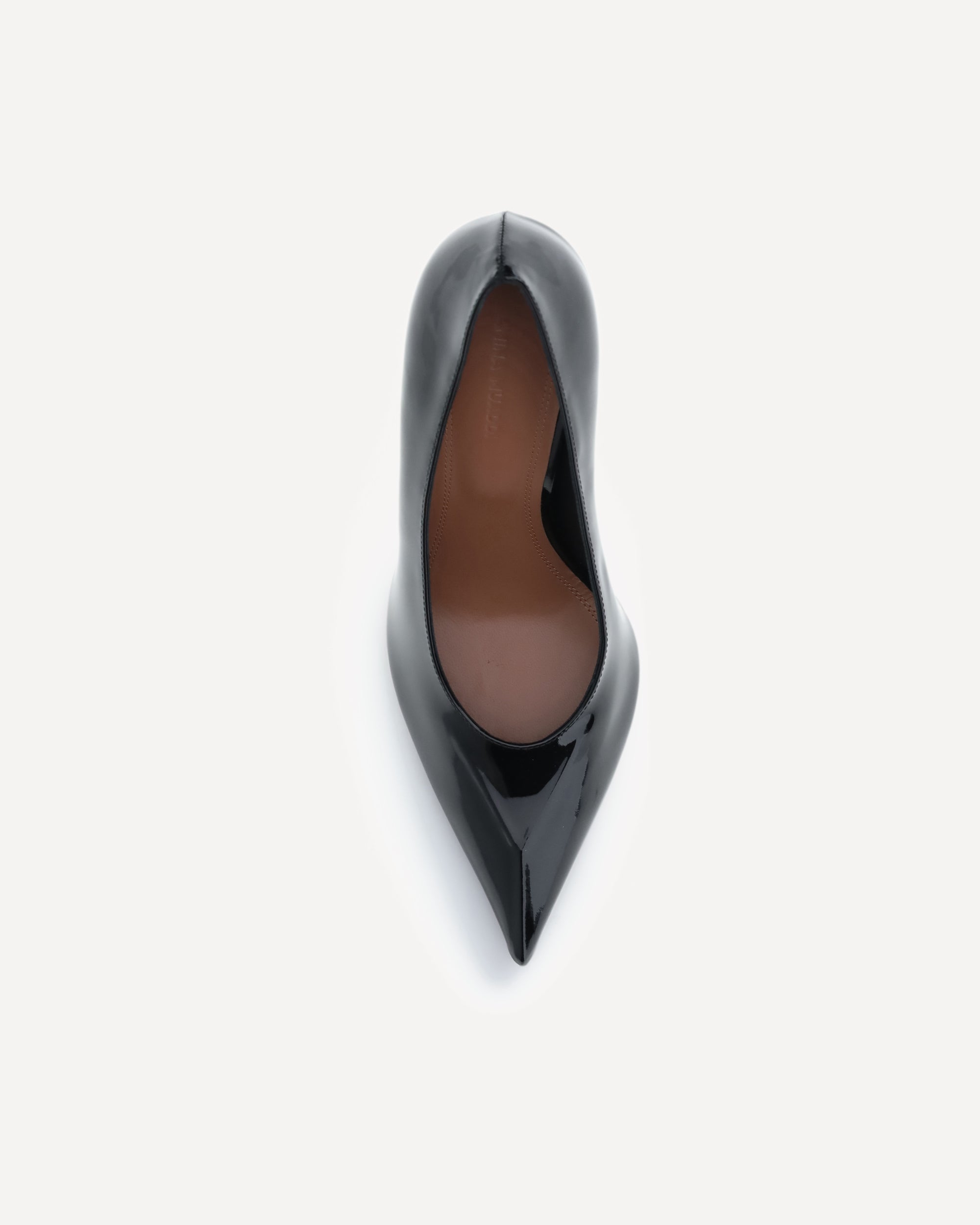 The Christine Pump 100 by Amina Muaddi is a refined Pump crafted from supple nappa leather, featuring a sleek, fully structured silhouette that enhances the foot’s shape. The design is defined by the Maison’s signature 100 mm slanted triangle heel and a sharp pointed toe adorned with a distinctive triangular accent on the upper. The fit runs true to size, while the structured construction ensures stability and an impeccable hold, making this shoe an expression of bold, contemporary elegance.