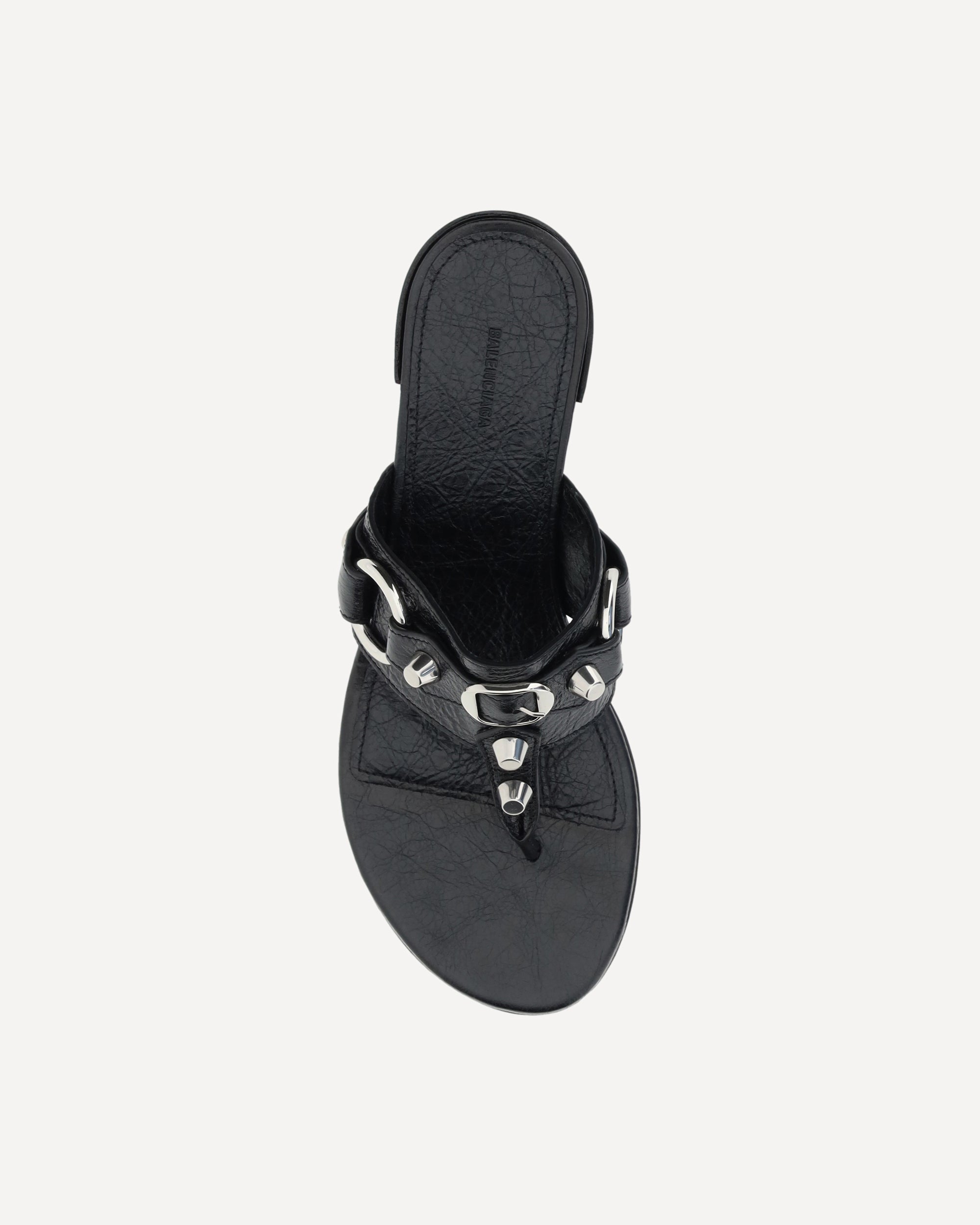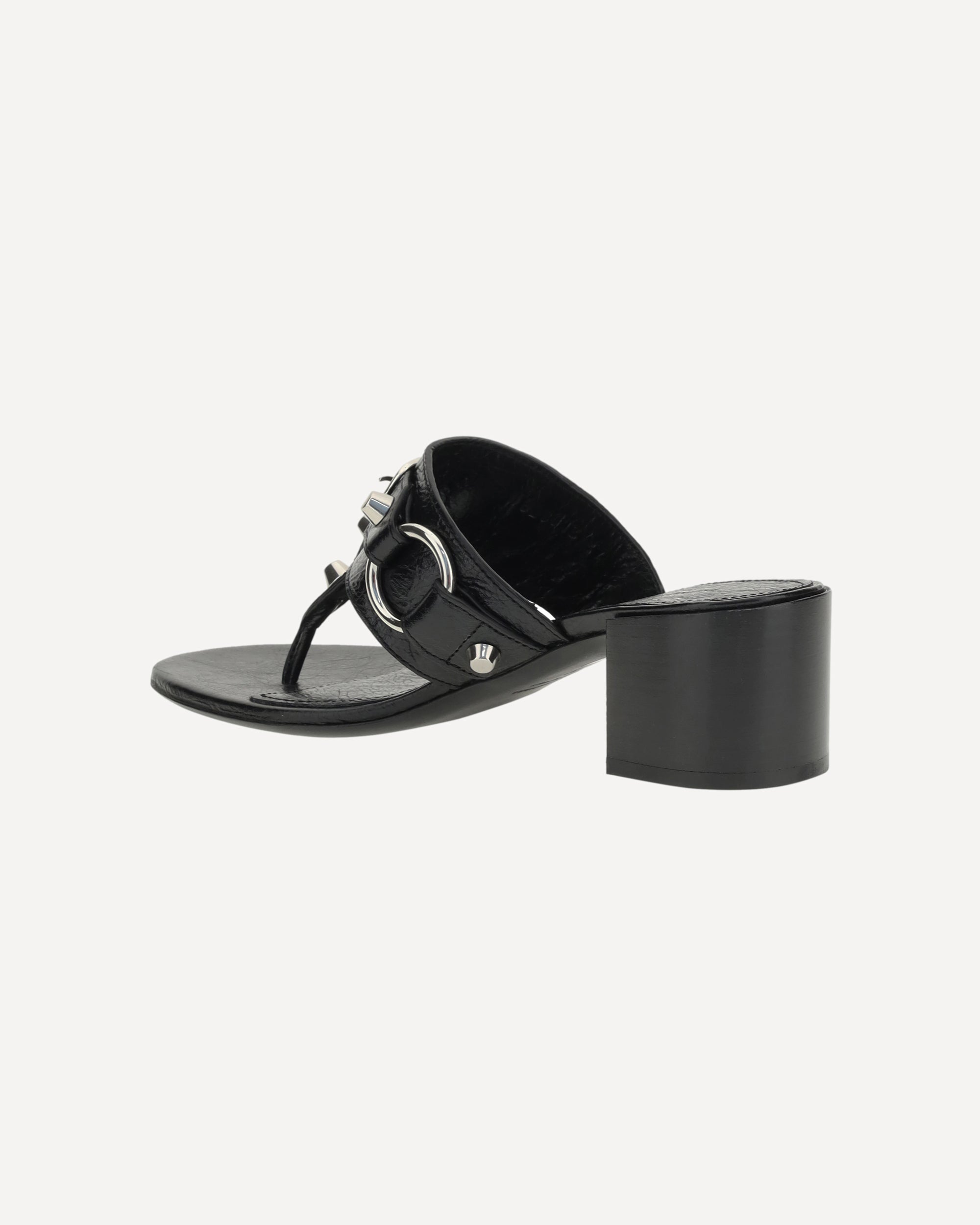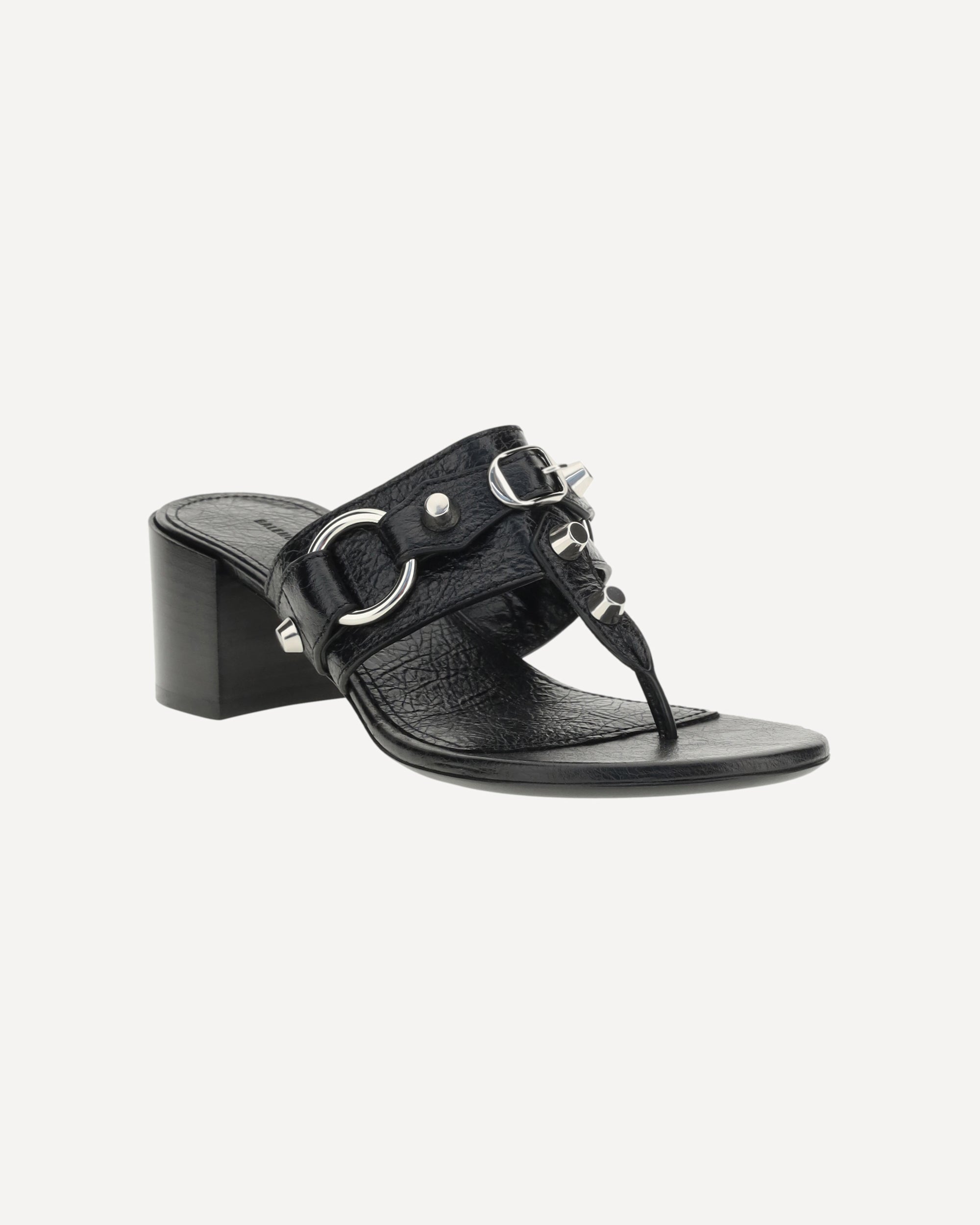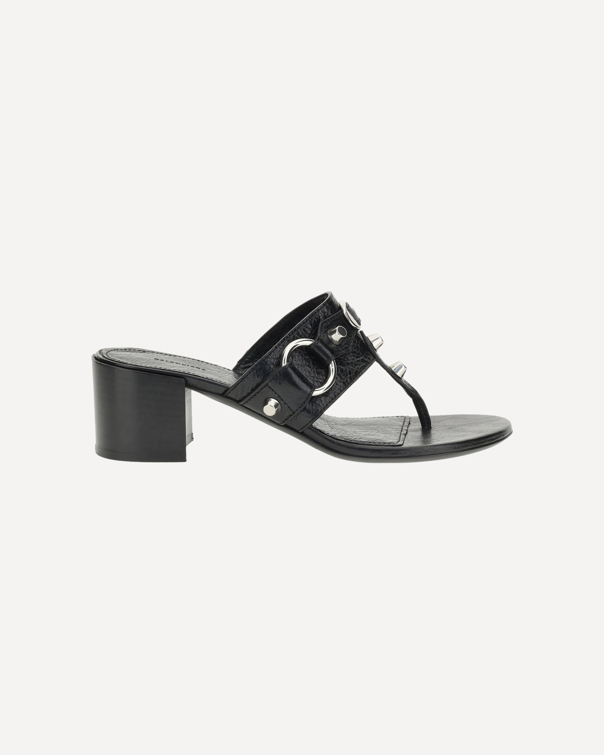 Balenciaga's City thong Sandals are a combination of elegance and boldness, crafted from Arena lambskin leather. With a rounded toe and flip-flop design, they feature a 50mm curvature that adds a touch of sophistication. Silver ABS studs and buckles give a bold accent, while the block heel provides stability and comfort. Perfect for a modern and trendy look.