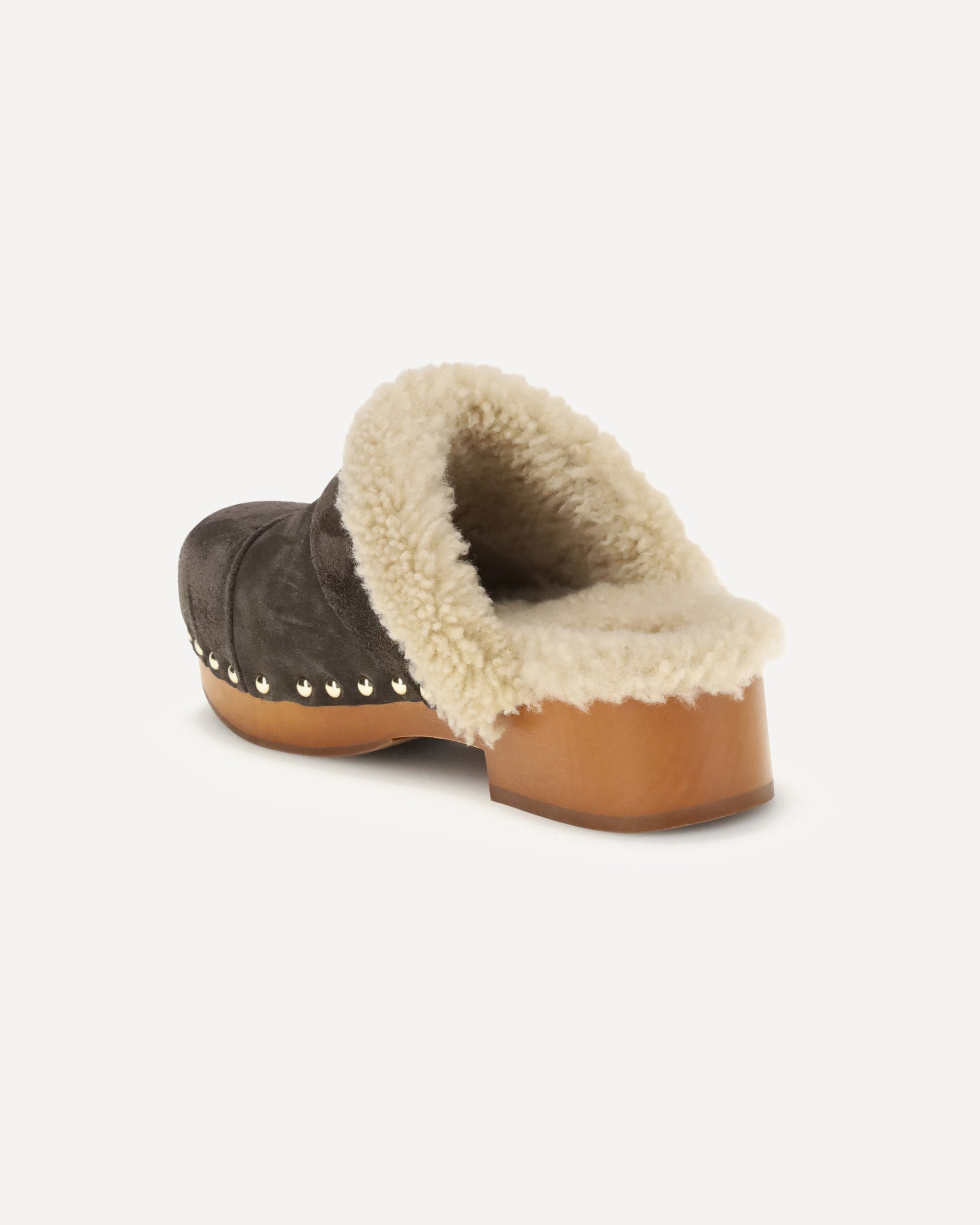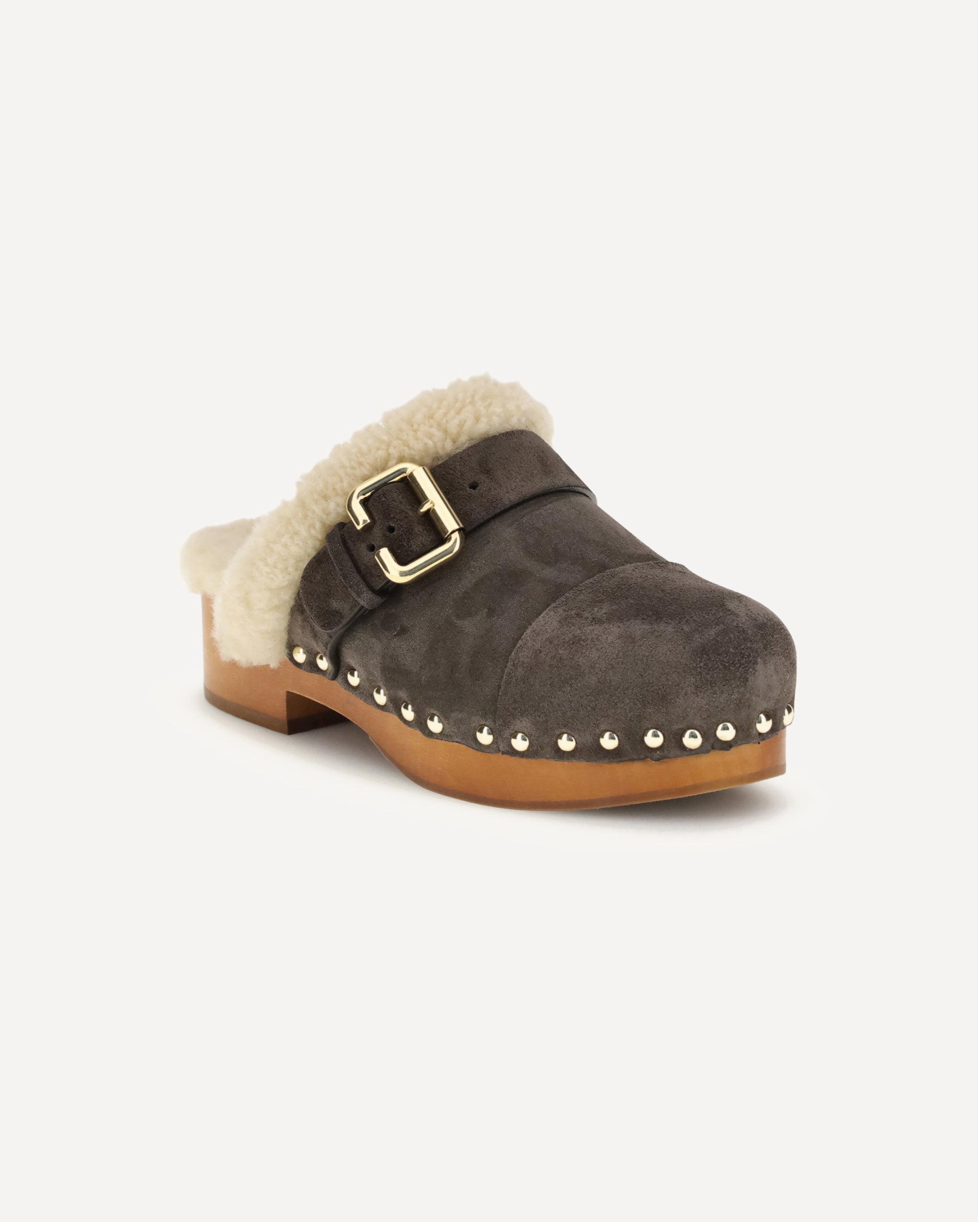 The Jeannette Clogs by Chloé are crafted from suede and lined with soft shearling for warm, cozy comfort. They are embellished with gold-tone studs and buckles shaped like the brand’s initial. The wooden sole and suede upper combine tradition and contemporary style in a versatile and refined design.