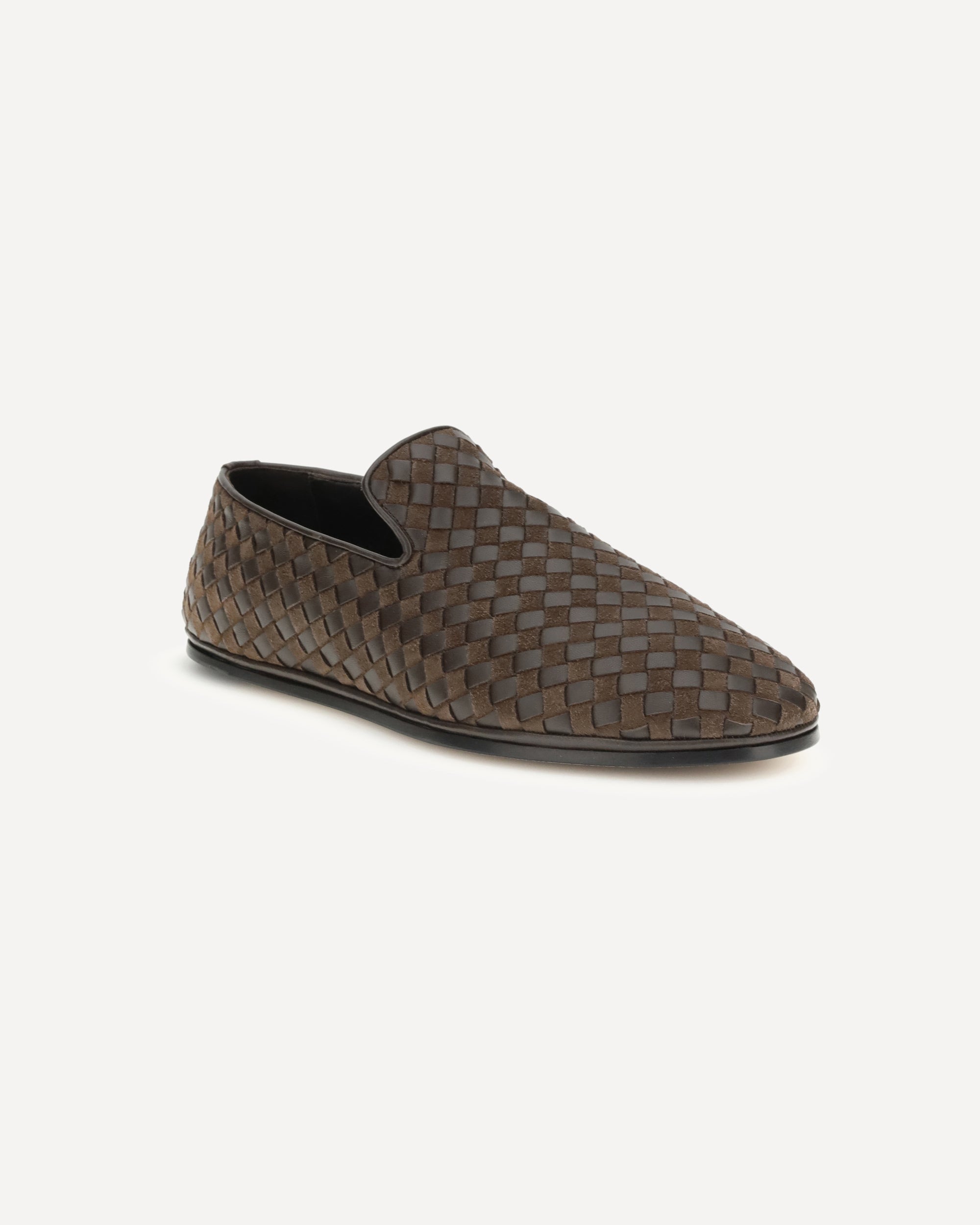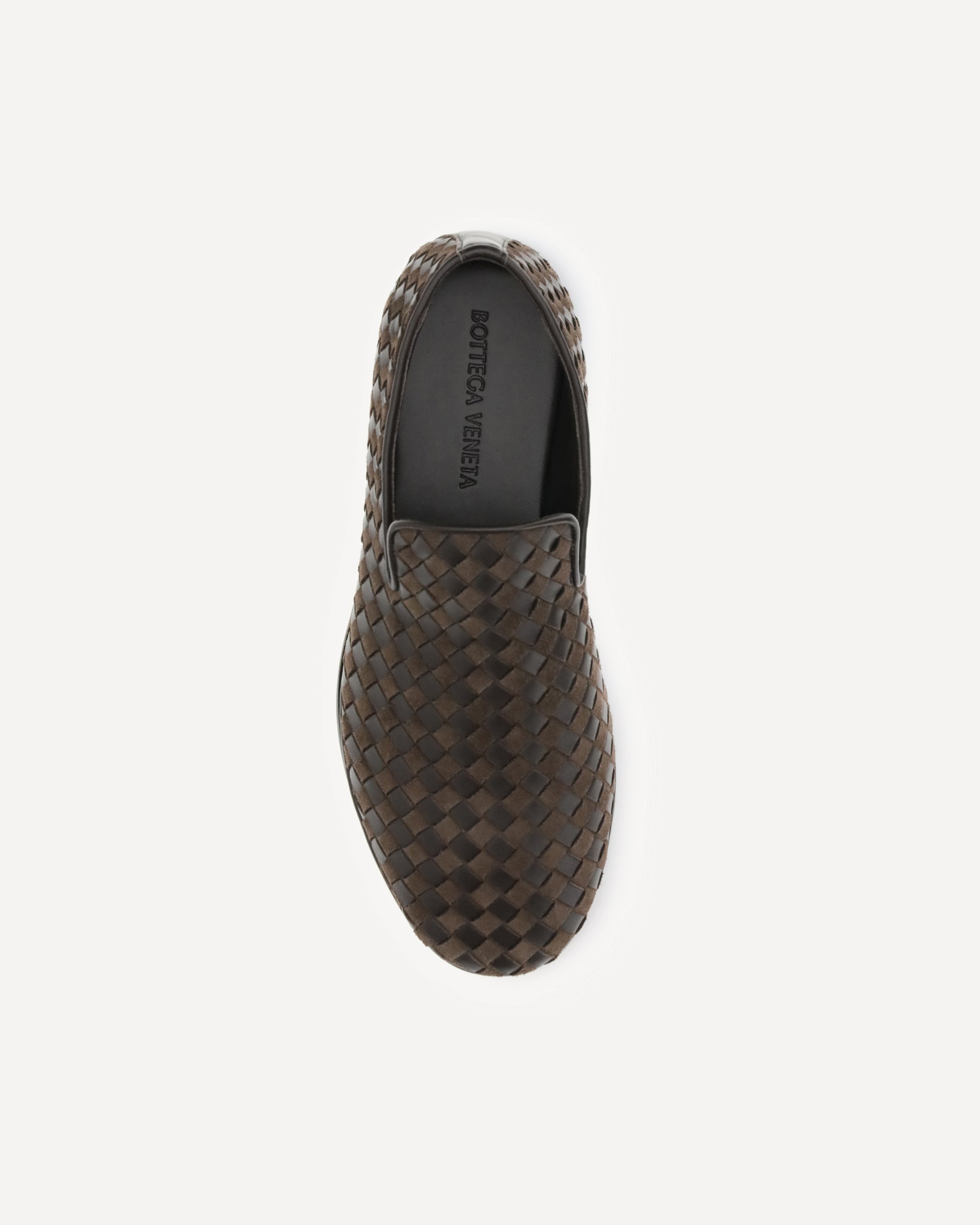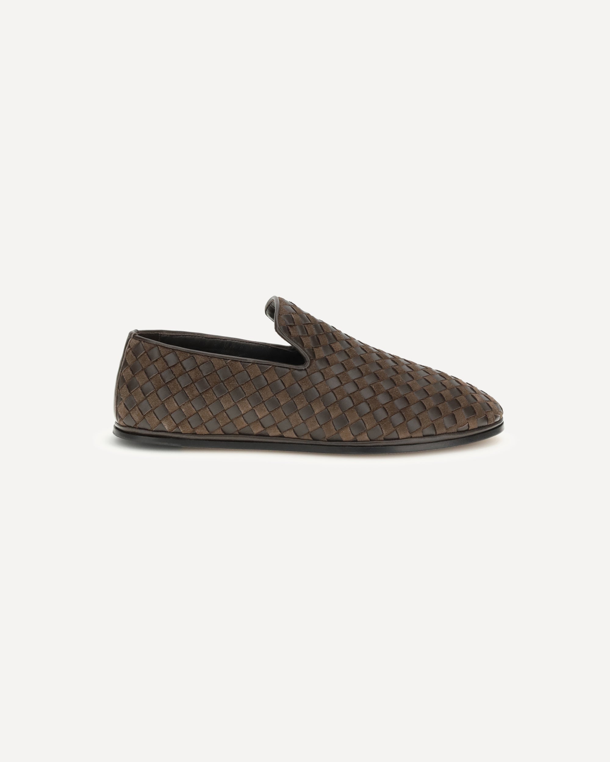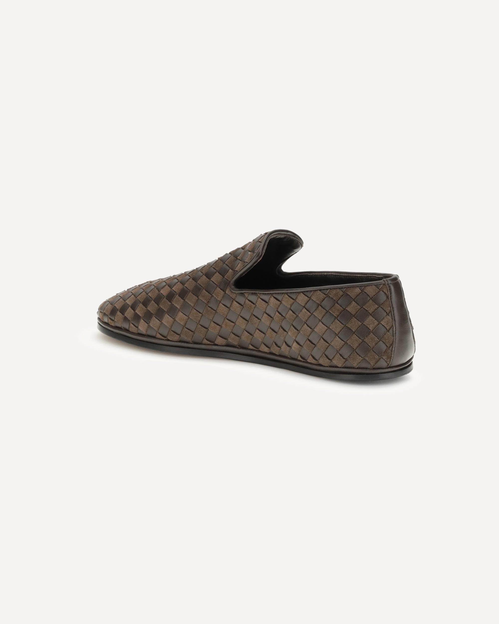 The Sunday Slippers by Bottega Veneta, crafted from woven lambskin with suede inserts, offer superior comfort thanks to the soft leather lining. A style that combines relaxation and elegance, perfect for a sophisticated yet effortless look.