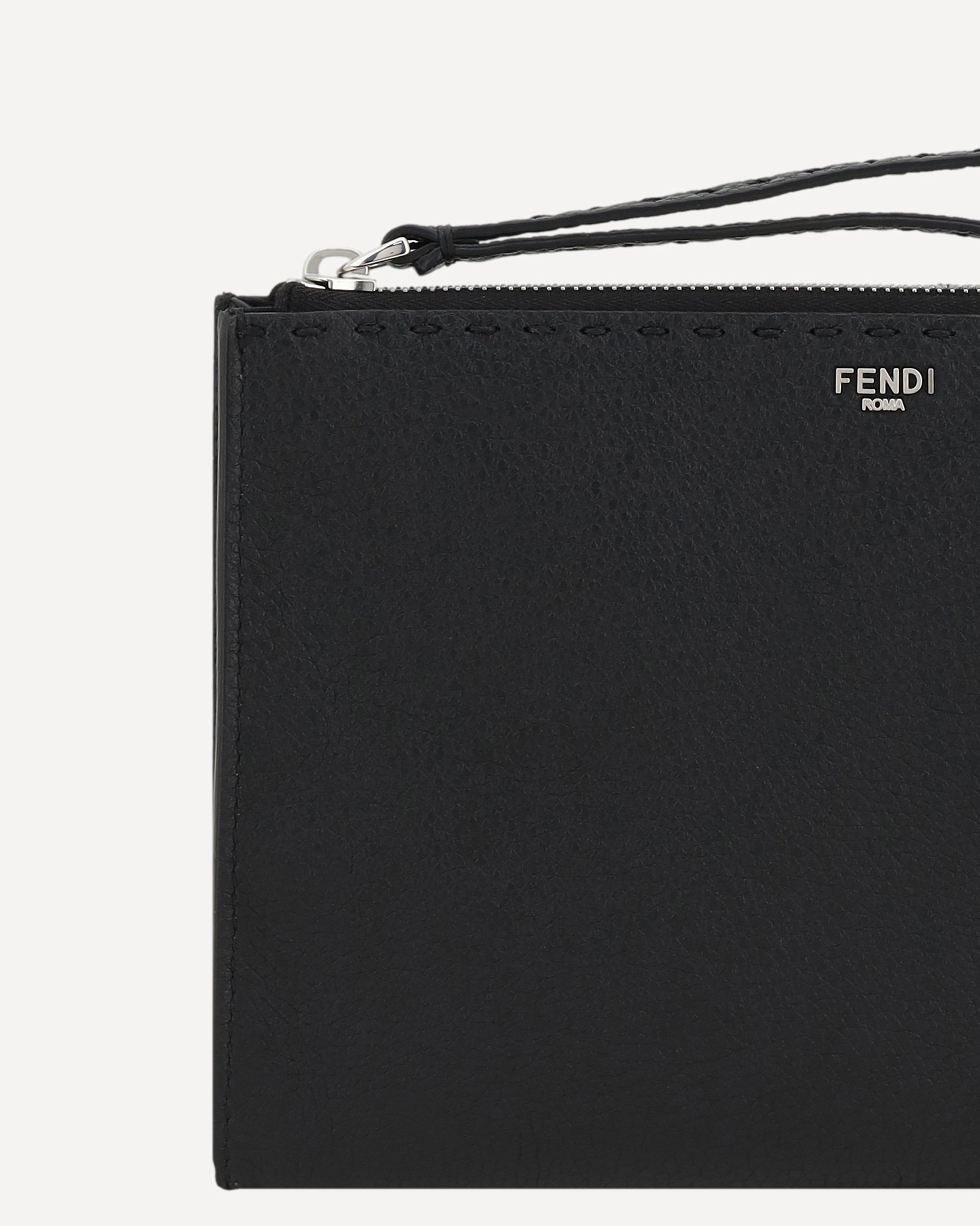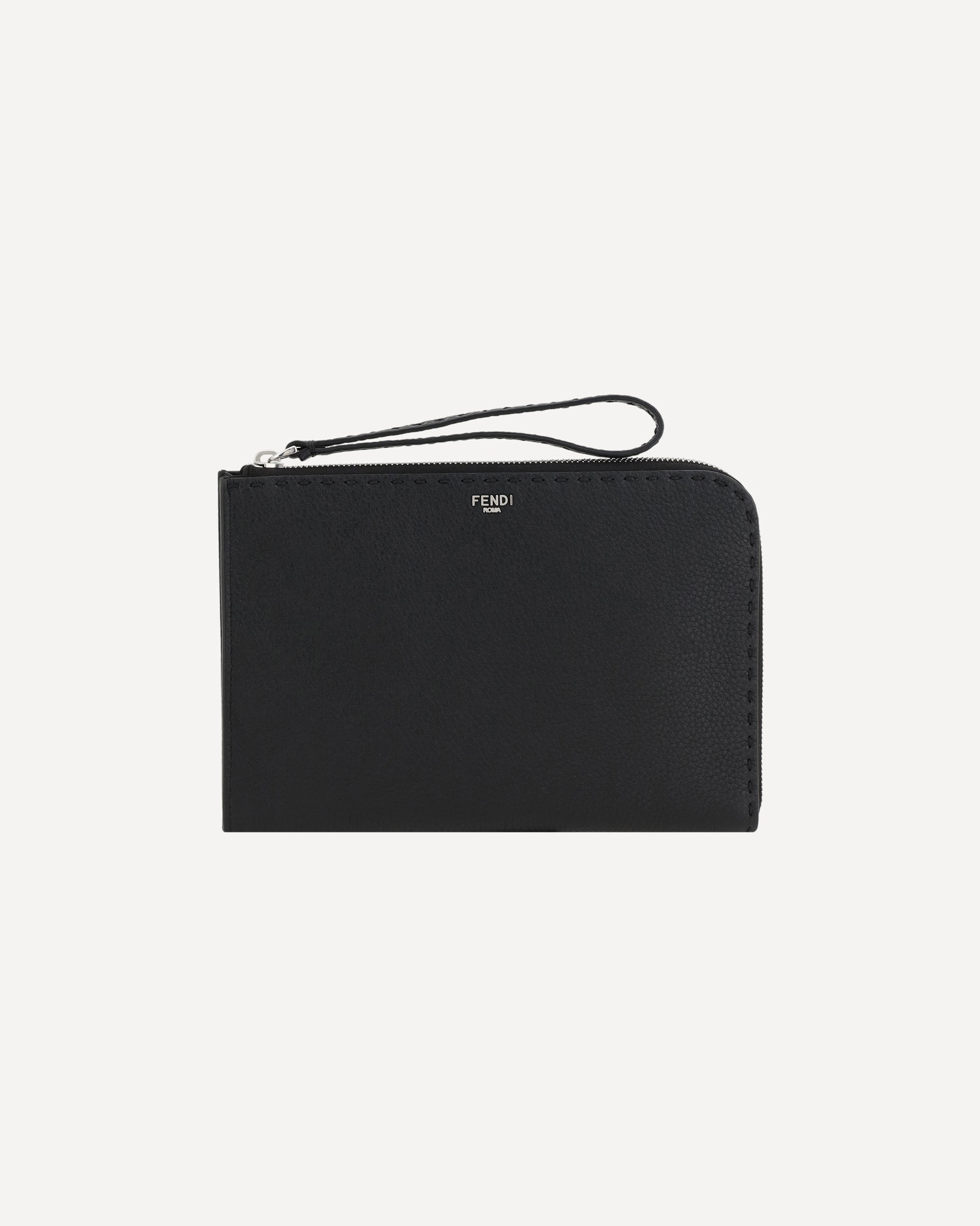 The Fendi hammered leather Pouch Bag is an elegant and sophisticated accessory, crafted from high-quality materials. The top zip closure, accompanied by a long puller, ensures practicality and security. On the front, the brand's iconic metallic monogram adds a distinctive and recognizable detail. The interior is composed of a single compartment, perfect for organizing essential items with ease.